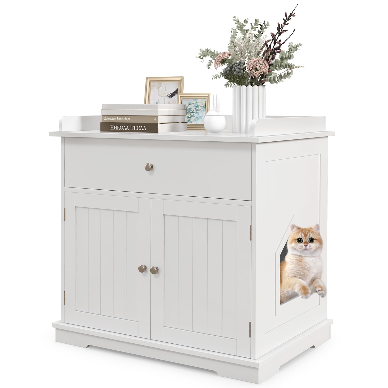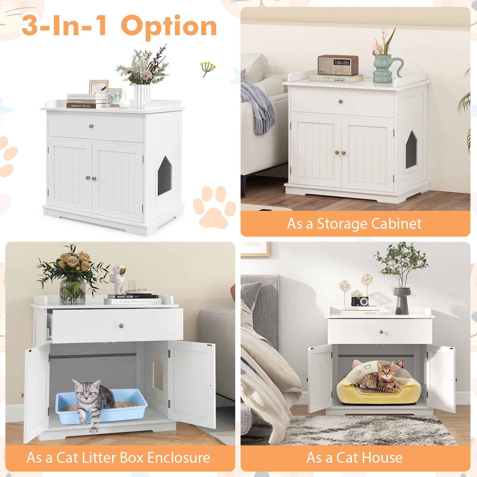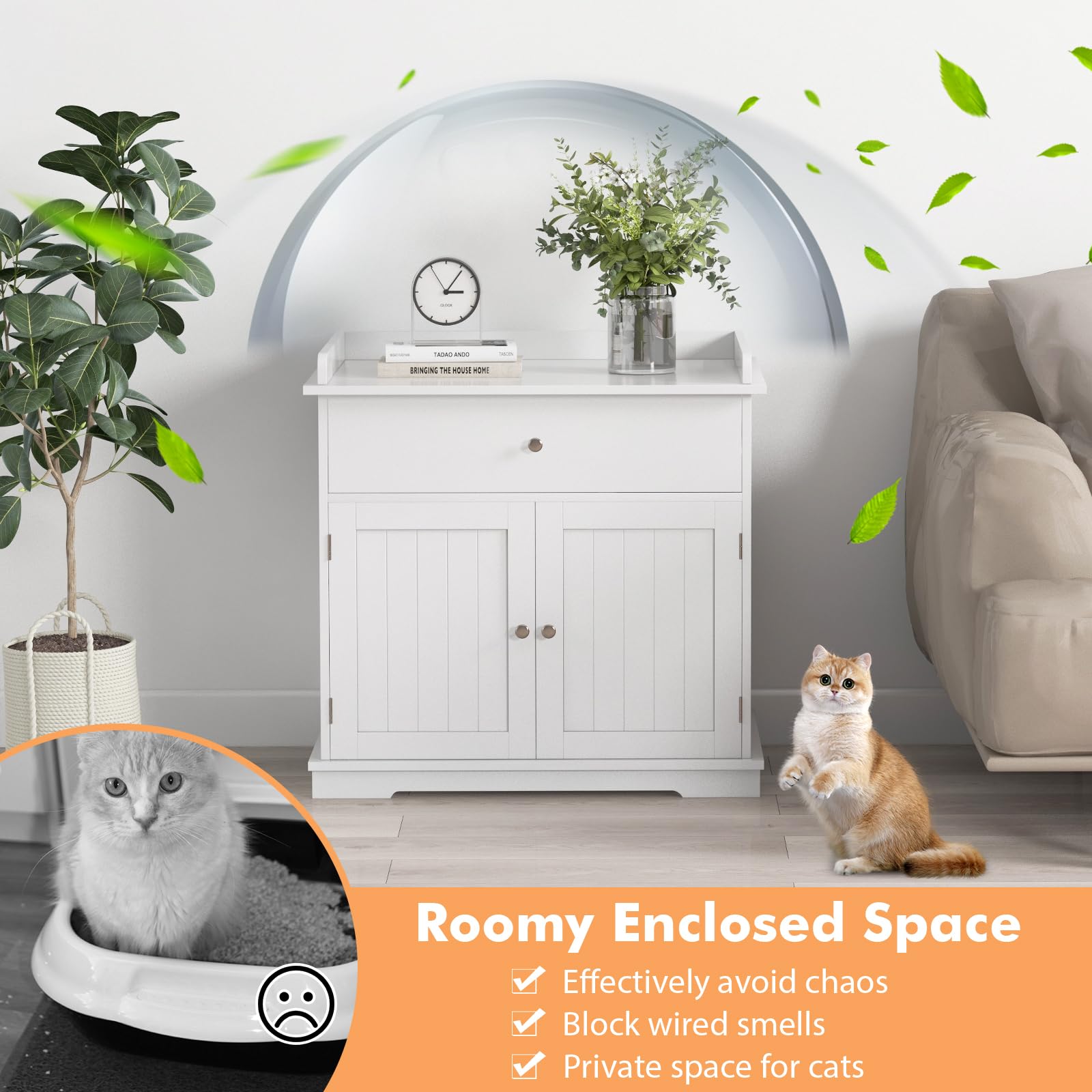 - 【Ample Storage Space】: Comes with a large drawer and a spacious cabinet top, the cat washroom hidden furniture provides a lot of space to store cat foods, cat toys, scoops, trash bags or other pet supplies.