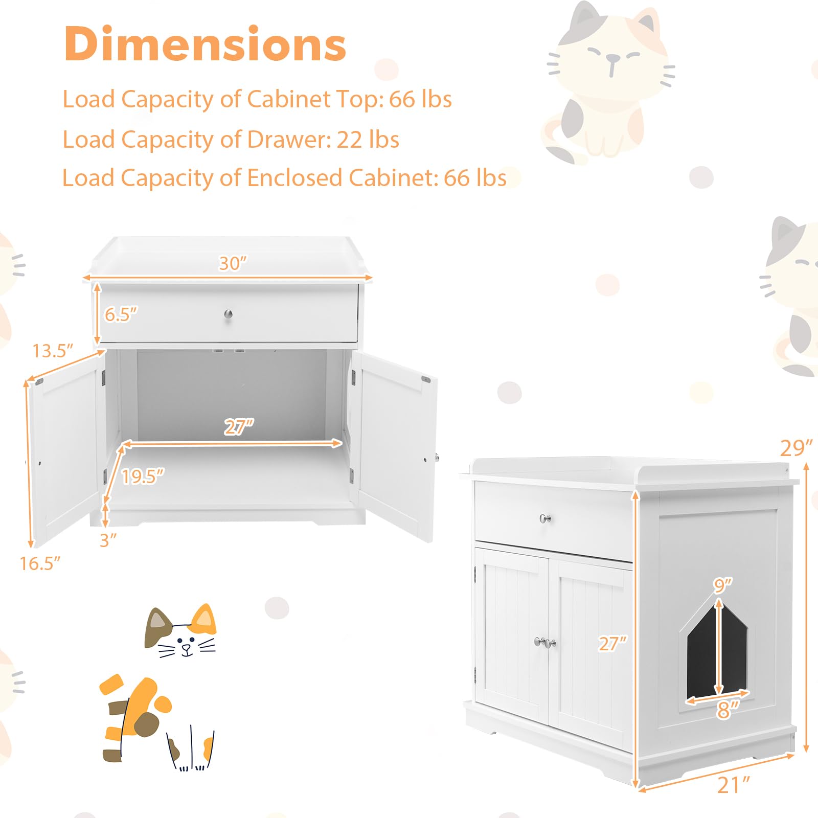 - 【Cat Litter Box Enclosure】: The internal dimensions of the cabinet behind the 2 doors are 27"L x 19.5"W x 16.5"H, so it fits most litter boxes. The wide opening door is easy for you to put in a cat bed or clean the litter box. Overall Dimension: 30''L x 21''W x 29''H.