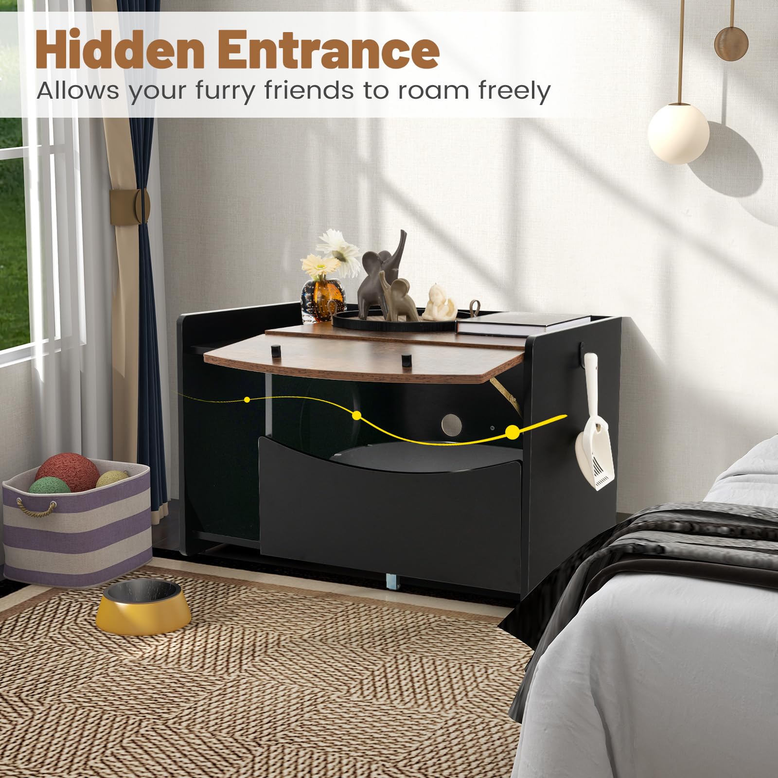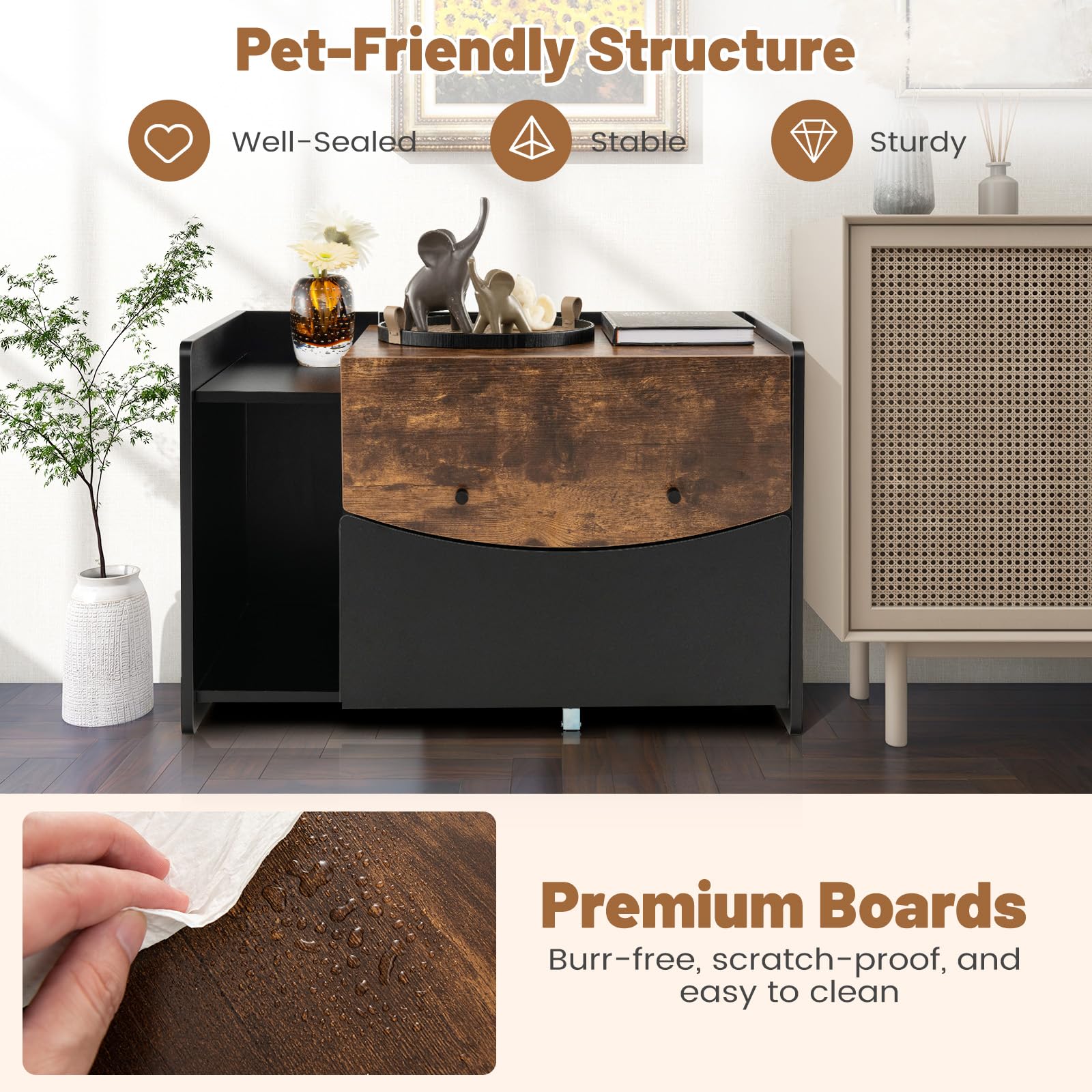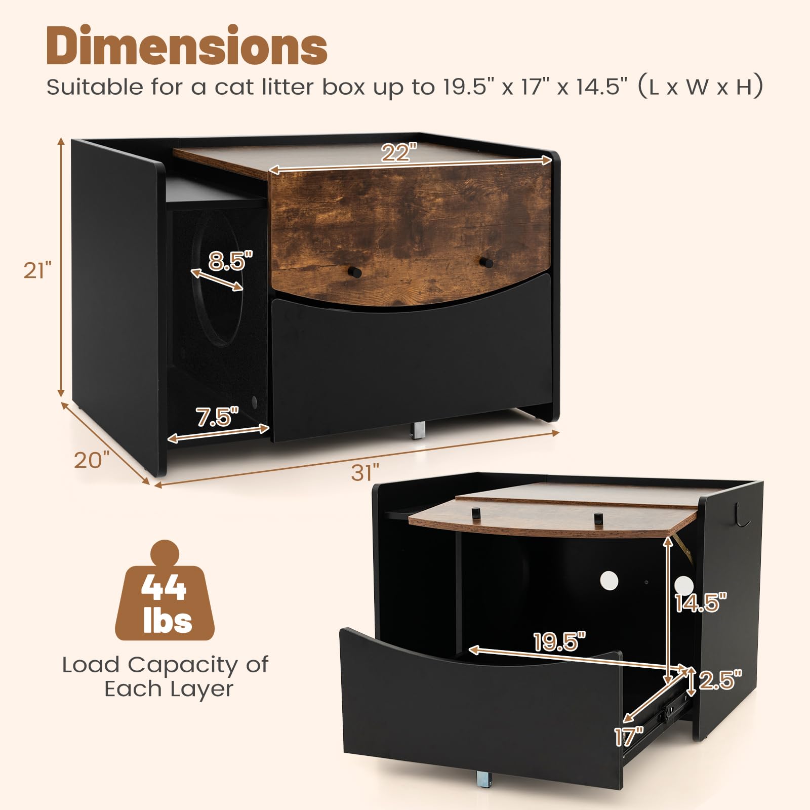 Elevate your cat's comfort with a luxurious litter box enclosure. This cat house includes a flip-up door for easy access, a rolling drawer for quick cleaning, and additional storage options like a wide cabinet top and hanging hook. Your cat will enjoy the cozy retreat with a hidden entrance and ventilation holes for airflow. Crafted from high quality materials, this burr-free enclosure provides a secure and stable resting spot. Enhance your cat's living space with this stylish and practical cat house.