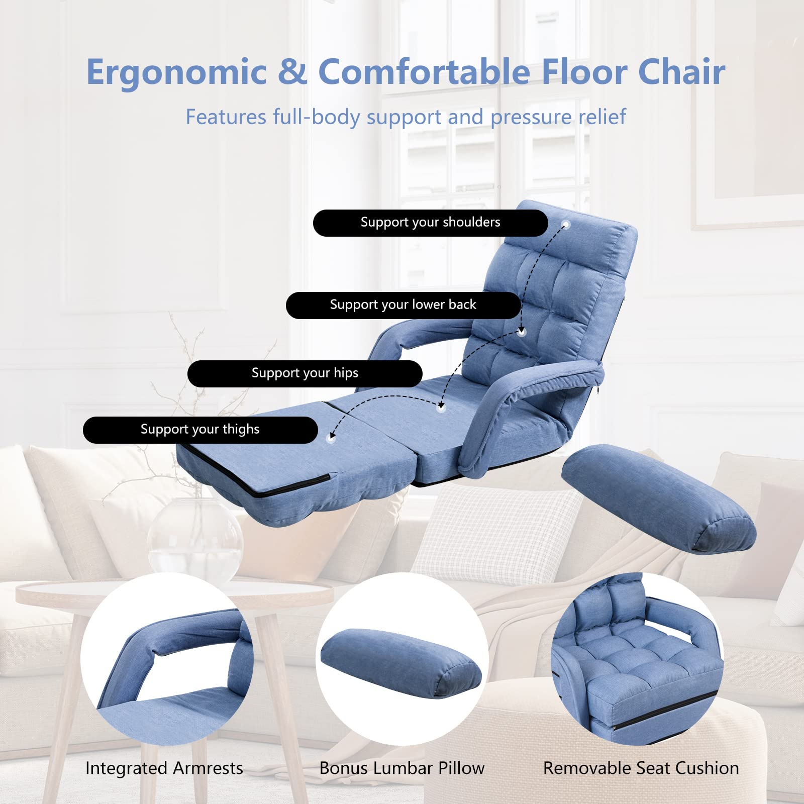 • Ergonomic Design with Armrests & Lumbar Pillow: In addition to an adjustable backrest, the indoor lounge chair is designed with integrated armrests and a detachable lumbar pillow, which give full-body support and relieve your pressure. And the seat cushion is removable according to your preference.