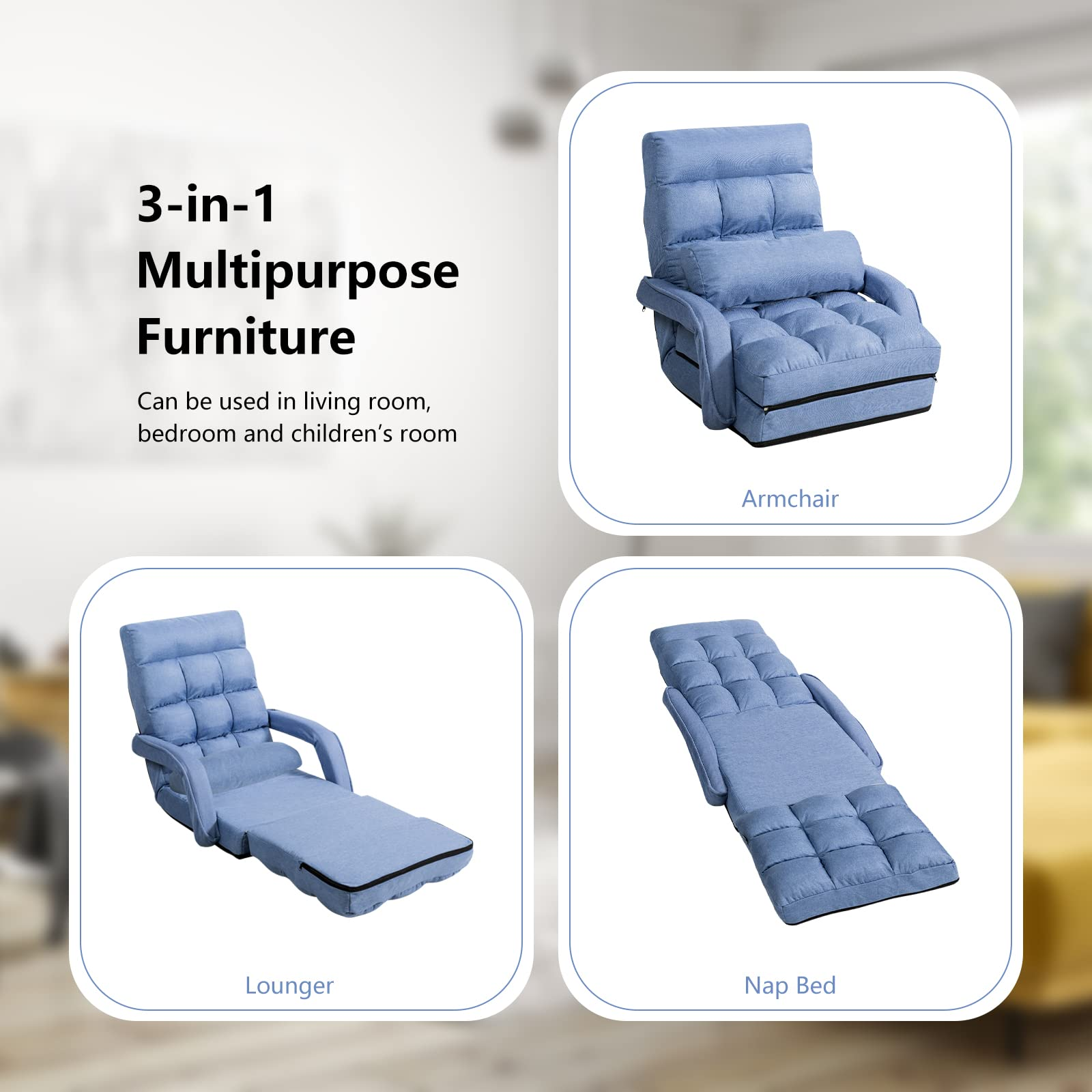 • Versatile Usage: This adjustable and comfortable lounge sofa is designed to allow you to enjoy your leisure time on the floor. With its adjustable feature, the floor lounger can be used as a single sofa or a nap bed for various activities, including meditation, reading, watching TV as well as playing games.