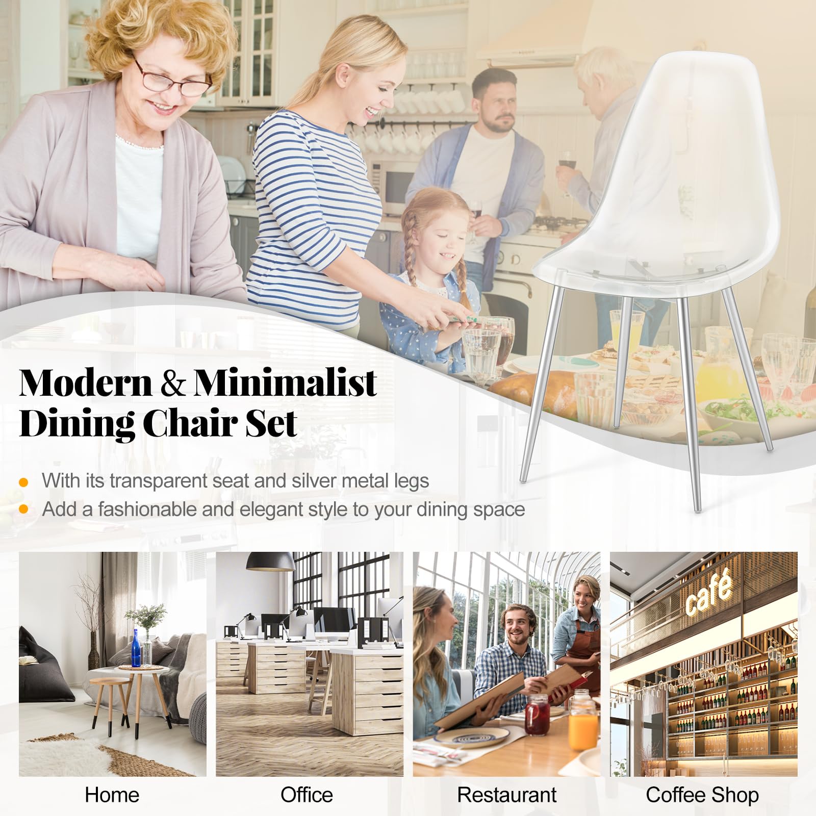 Includes 4 transparent plastic chairs, the combination of transparent seats and silver metal legs, these modern and sleek dining chairs could seamlessly blend into any decoration style. Besides, these chairs boast a curved backrest and spacious seat that hugs the natural contours of your body, providing exceptional support for long hours of dining or working without discomfort. To ensure excellent sturdiness and stability, the chairs are equipped with rustproof electroplated metal legs and X-shaped stabilizing brackets. Crafted from premium PET material, the transparent seats are not only wear-resistant but also easy to clean and maintain. This dining chair set is a practical and stylish addition to your home or office!