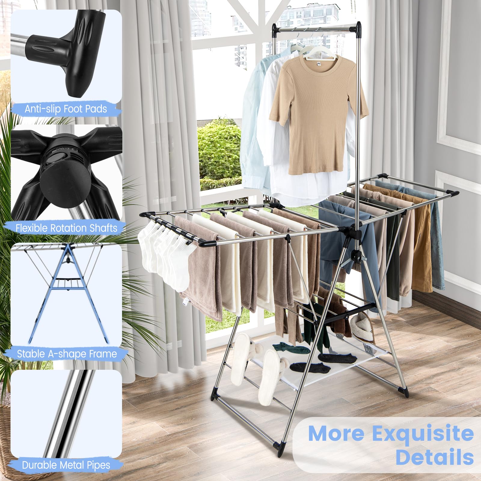 - [Multifunctional Drying Rack]: With 3 tiers and a high hanger design, this clothes drying rack offers a spacious drying area for your clothes, pants, scarfs and towels. Besides, the side clips and 4 shoe holders provide extra space for socks and slippers.
