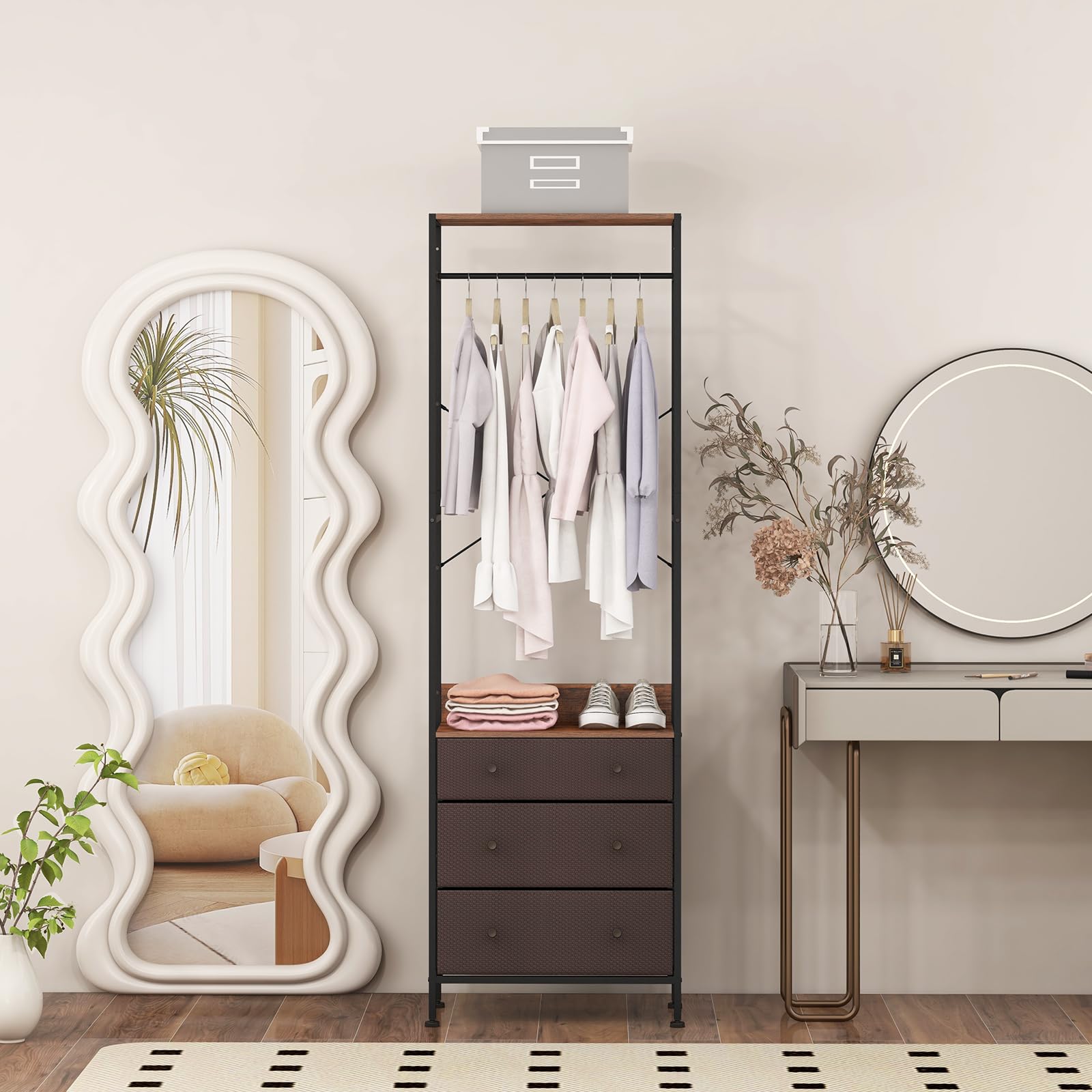 - 【Spacious Storage】: Organize your items neatly with a top shelf, hanging rod, middle shelf, and 3 foldable drawers. This clothing stand keeps clothes, bags, shoes, and more easily accessible and well-organized, offering generous storage space.