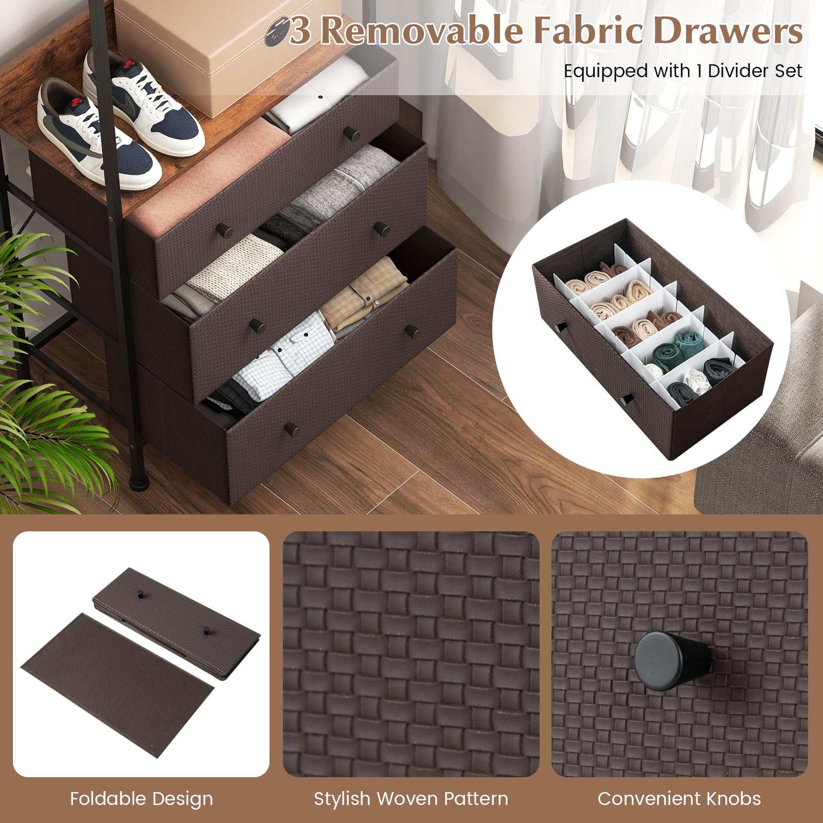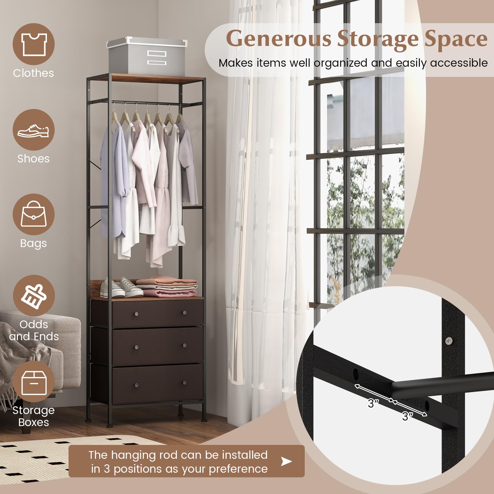 - 【Customizable Features】: Enjoy flexibility with a hanging rod that can be installed in 3 positions, along with a drawer featuring dividers for personalized storage. Convenient knobs on the drawers allow for easy access, catering to your different needs.