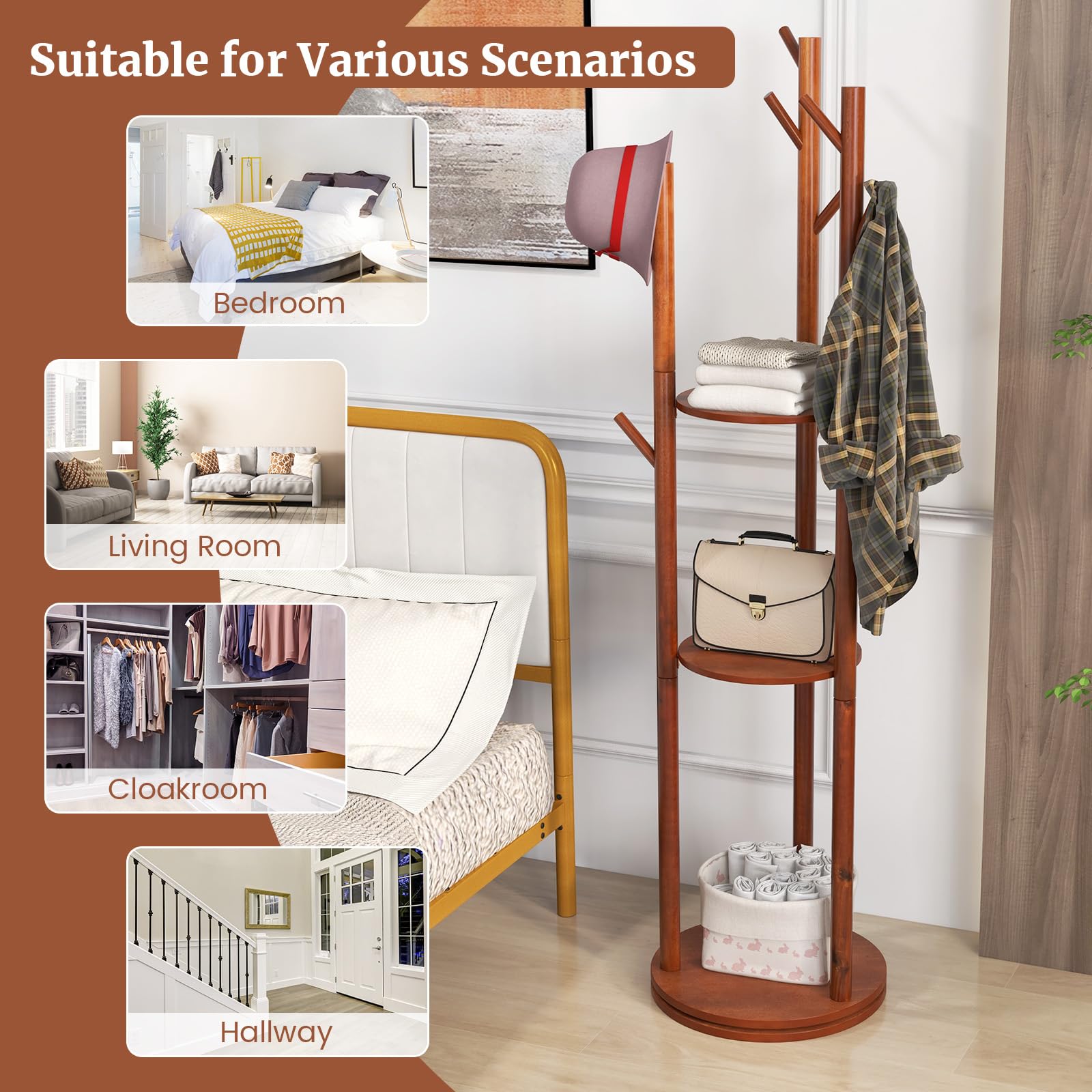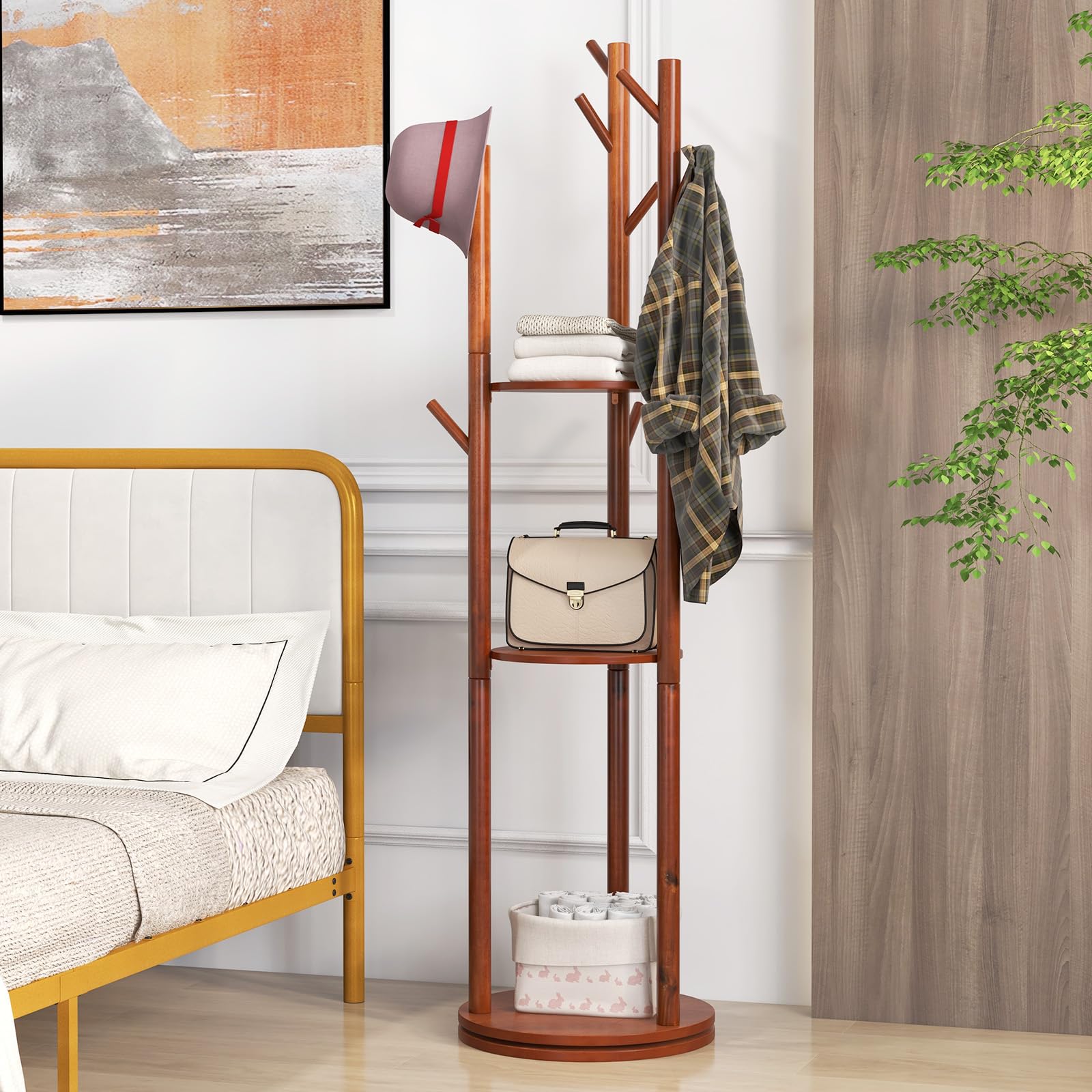 Keep your belongings organized and add a touch of style to your space with our wooden rotary coat rack! This coat tree comes with a convenient 360° rotating base, making it easier to hang or take clothes. With 3 shelves and 9 hooks, it offers versatile storage options to meet your different needs. The smooth surface and rounded edges ensure that your clothes are well protected. Made with solid rubber wood, both the poles and hooks are durable for long-lasting use. Its vertical structure saves space, making it perfect for small areas like bedrooms, living rooms, hallways, and more. Plus, installation is a breeze with the help of the user's manual.