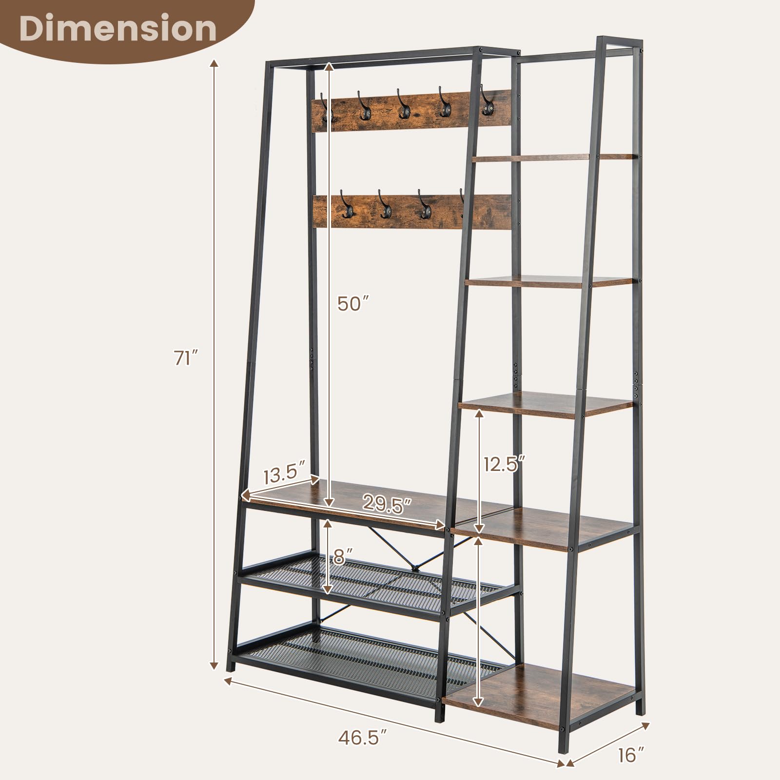- 5-in-1 Hall Tree Storage Bench: Giantex versatile hall tree is a cost-effective and space-saving home furniture as it features multiple functions all in one, including top rack, 2 rows of hanging hooks, shoe bench, 2 mesh shelves and 5 storage shelves. It provides perfect place to organize your clothes, bags, shoes, scarves, hats, boxes, etc.