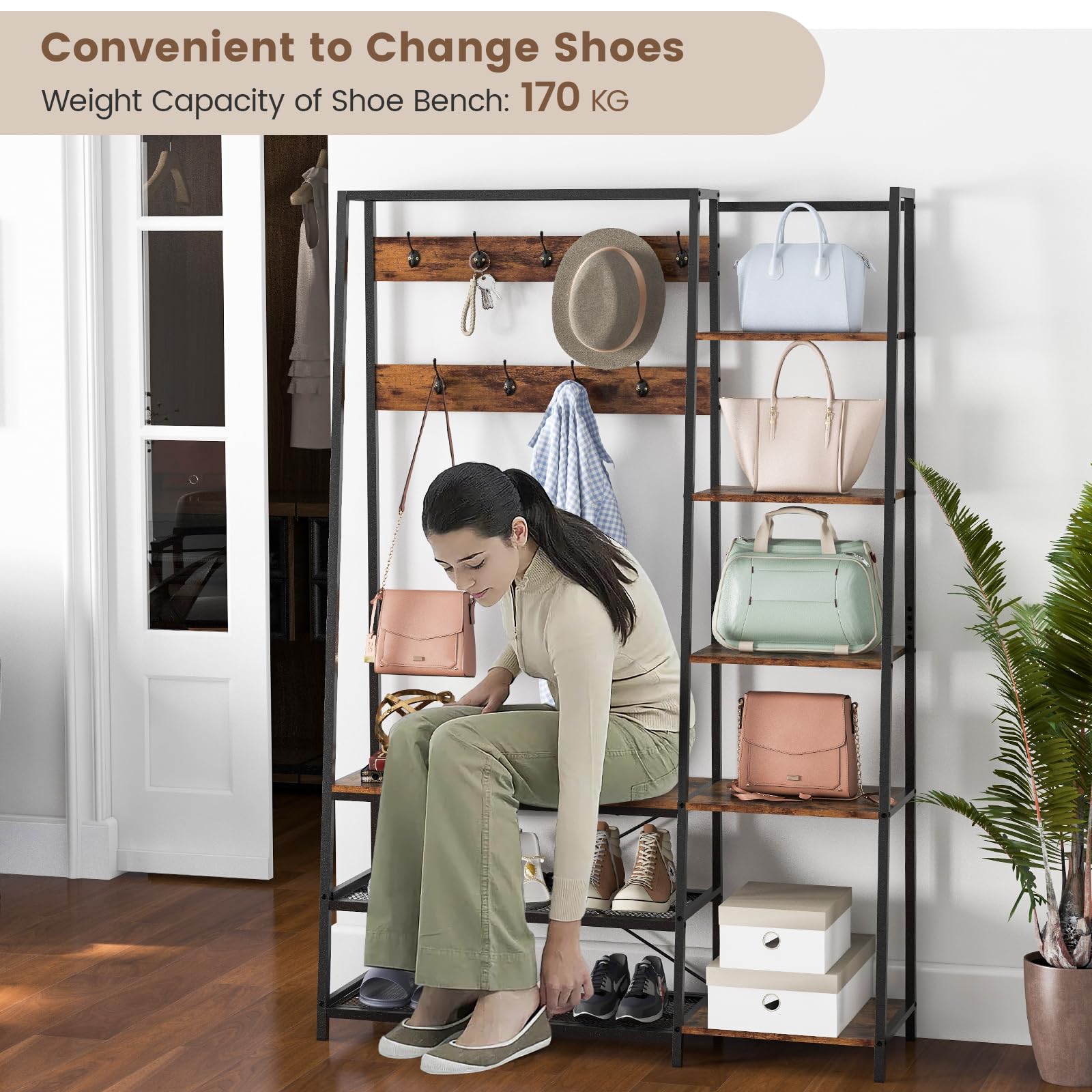 Our multifunctional entryway hall tree integrates hanging rod, coat hook, shoe bench and shoe rack, This coat rack allows you to show your decor, hang your jackets, perch your shoes, and take a seat. With a maximum loading capacity of 220 lbs, our shoe bench can offer you a convenient seat for changing shoes. This hall tree with shoe bench is made of engineered board with powder-coated metal frame for durability and stability. Moreover, the hall tree is equipped with anti-tip device to increase overall stability and prevent tipping over.?The perfect combination of black frame and rustic brown wood grain finish gives the clothing rack an industrial look, which fits well with any home style. This shoe and coat rack works perfectly in the entryway, hallway, living room, bedroom, mudroom, or closet room!