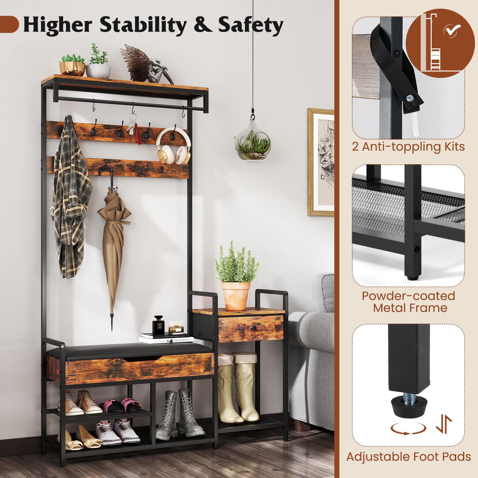 The hall tree includes a coat rack, shoe rack, and foldable fabric drawer for storage, along with sturdy metal hooks for convenience. Moreover, the soft padded shoe bench offers a convenient solution for organizing your footwear while also providing a stylish seating option. The bench has a roomy storage space under the seat, ideal for storing sundries. Crafted with powder-coated metal frame, this hall tree ensures durability and stability, bolstered further by the anti-toppling kits and adjustable foot pads. Blending rustic brown finish and industrial style, the hall tree adds a touch of charm to any space.