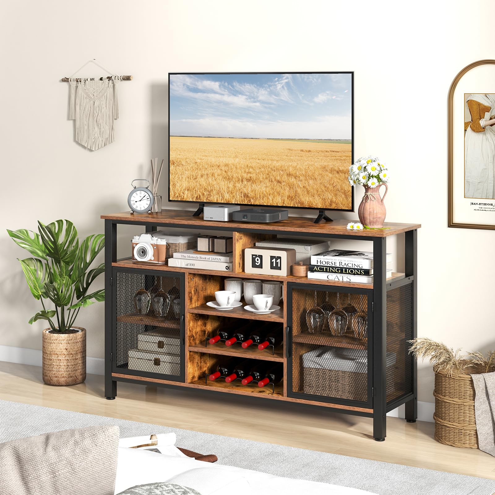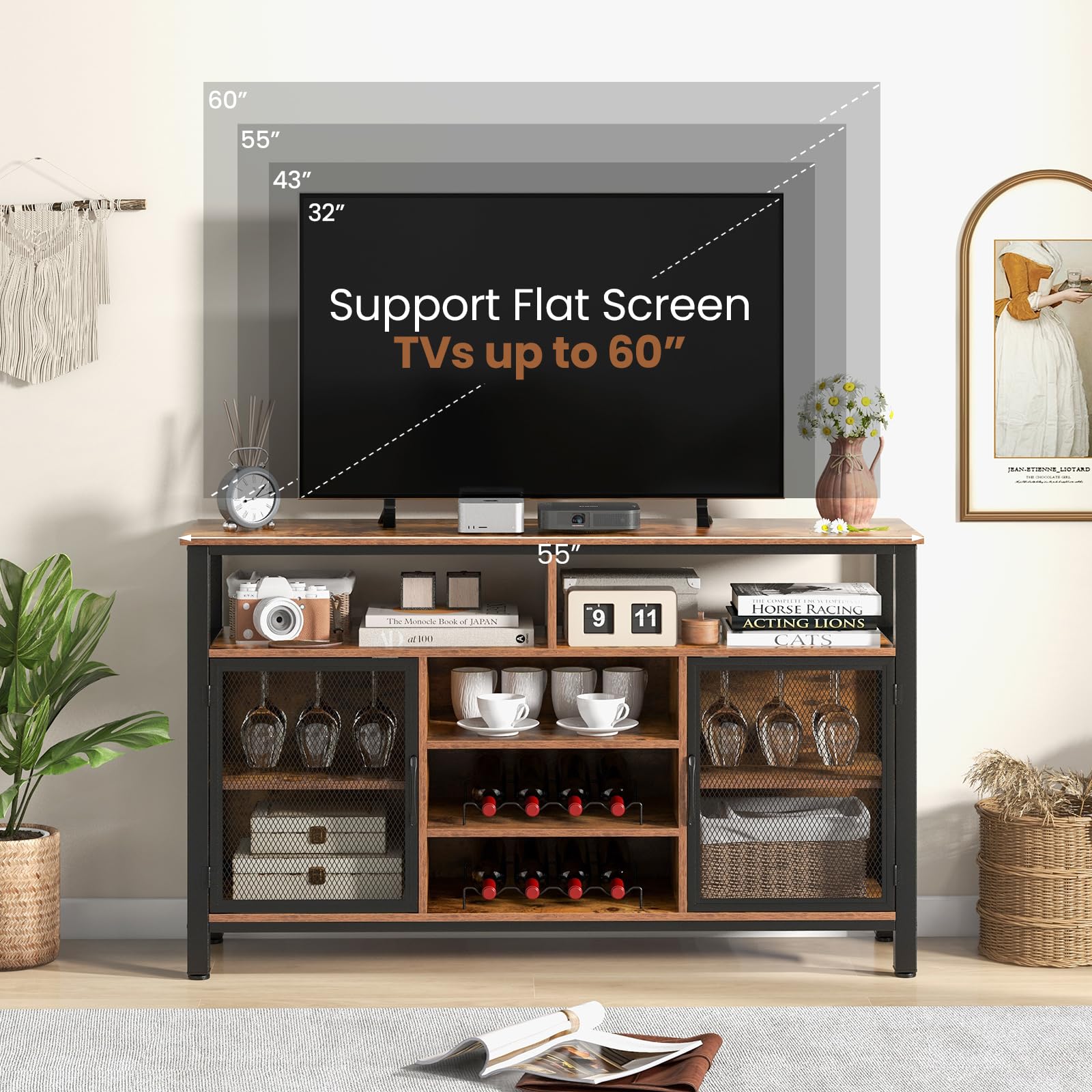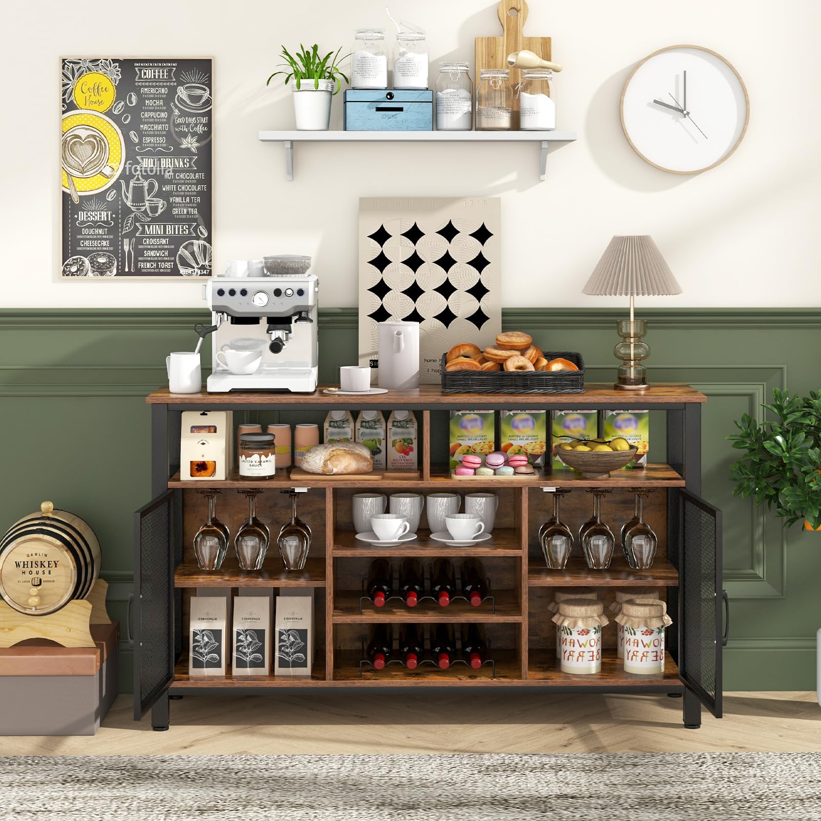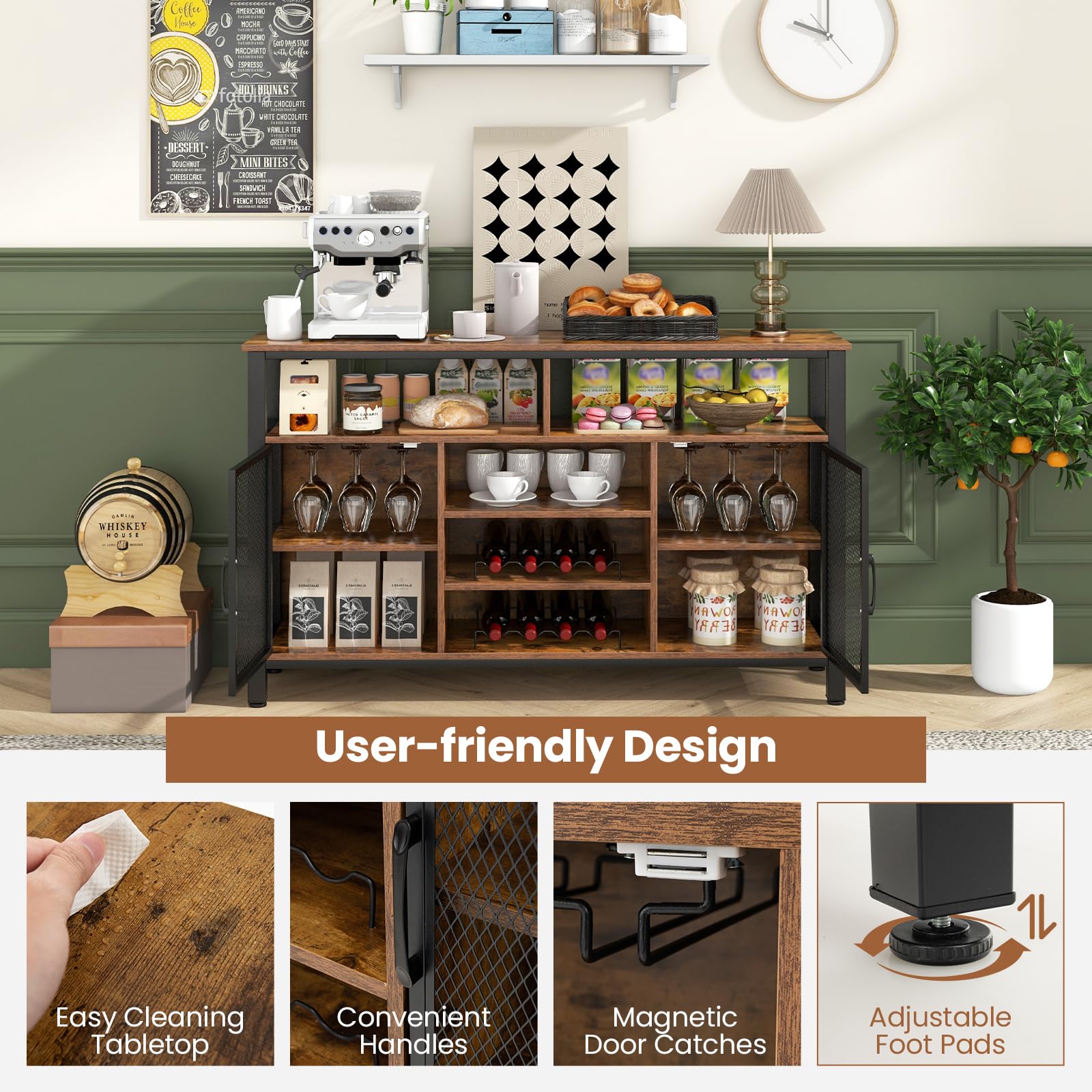 Introducing the ultimate organizer for wine enthusiasts and kitchen gurus alike - our 55-inch wine bar cabinet! Designed to captivate and impress, this versatile storage solution effortlessly showcases your wine collection, accommodating up to 8 bottles with style. With 6 rows of wine glass holders, your precious stemware is elegantly displayed and easily accessible. But that’s not all! This extraordinary cabinet boasts many other storage options to ensure every kitchen essential finds its rightful place. Crafted with a heavy-duty metal frame, this storage cabinet stands sturdily. Anti-tipping kits enhance the overall using safety and provide better protection for your family. Wait, there’s more! Transform this marvelous piece into a stunning TV stand for your flat screen up to 60". The user-friendly design, like the mute hinges, gives you a better experience. Elevate your organization game today with our coffee bar cabinet!