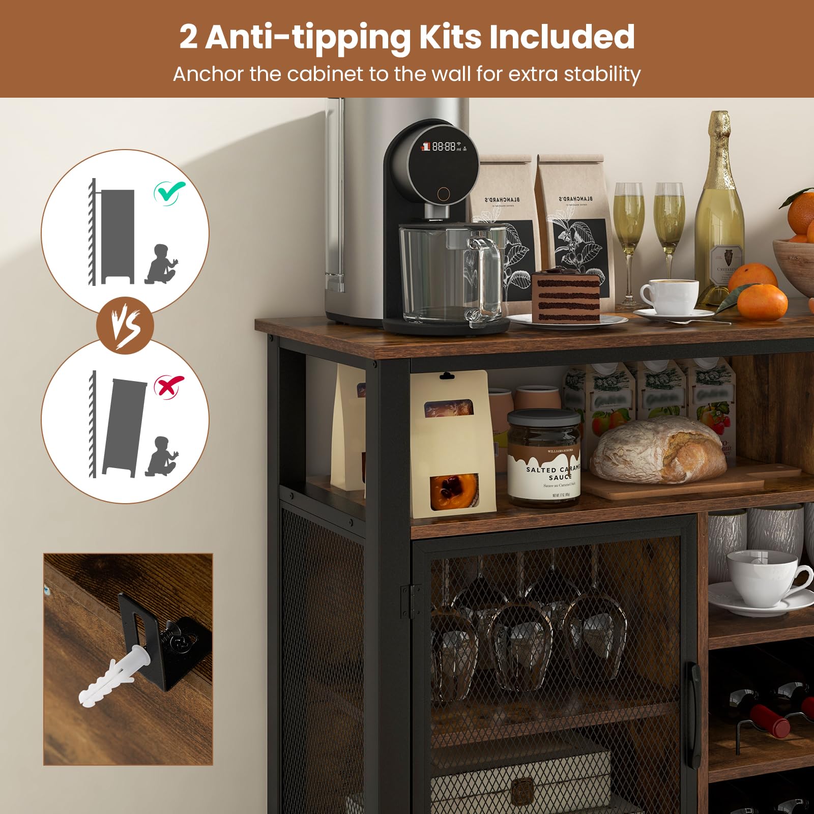 - Enhanced Sturdiness: The large coffee bar cabinet is constructed with a heavy-duty metal frame for long-lasting durability. Together with 2 anti-tipping kits and 4 adjustable foot pads, the cabinet is not likely to wobble or tip over.