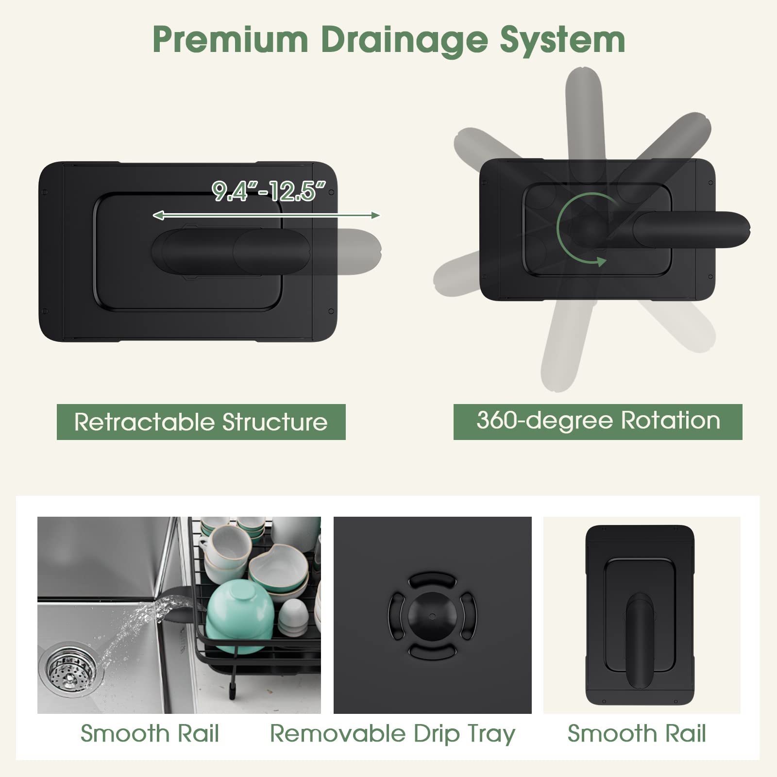Our 2-tier dish drying rack with drainboard will be your great kitchen helper. With a foldable structure, this dish drying rack offers ample storage space for your tableware when unfolded, and it helps to save your kitchen space when folded. Besides, it is able to accommodate 10 plates, over 10 bowls, over 4 cups, and more than 30 cutlery, meeting your drying needs. All water will drop into the sink through the 360-degree swiveling spout of the drip tray. Meanwhile, a rust-proof metal frame with anti-slip feet keeps it durable and stable. When it is dirty, you can remove the drip tray and easily clean it.
