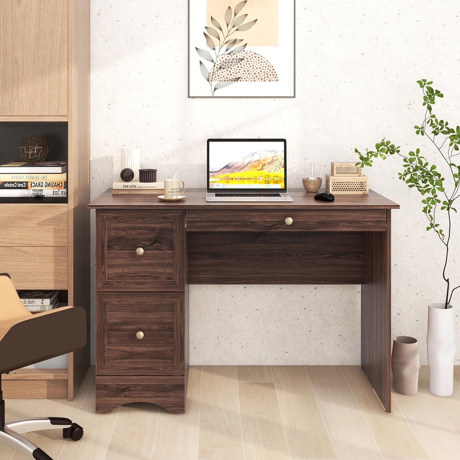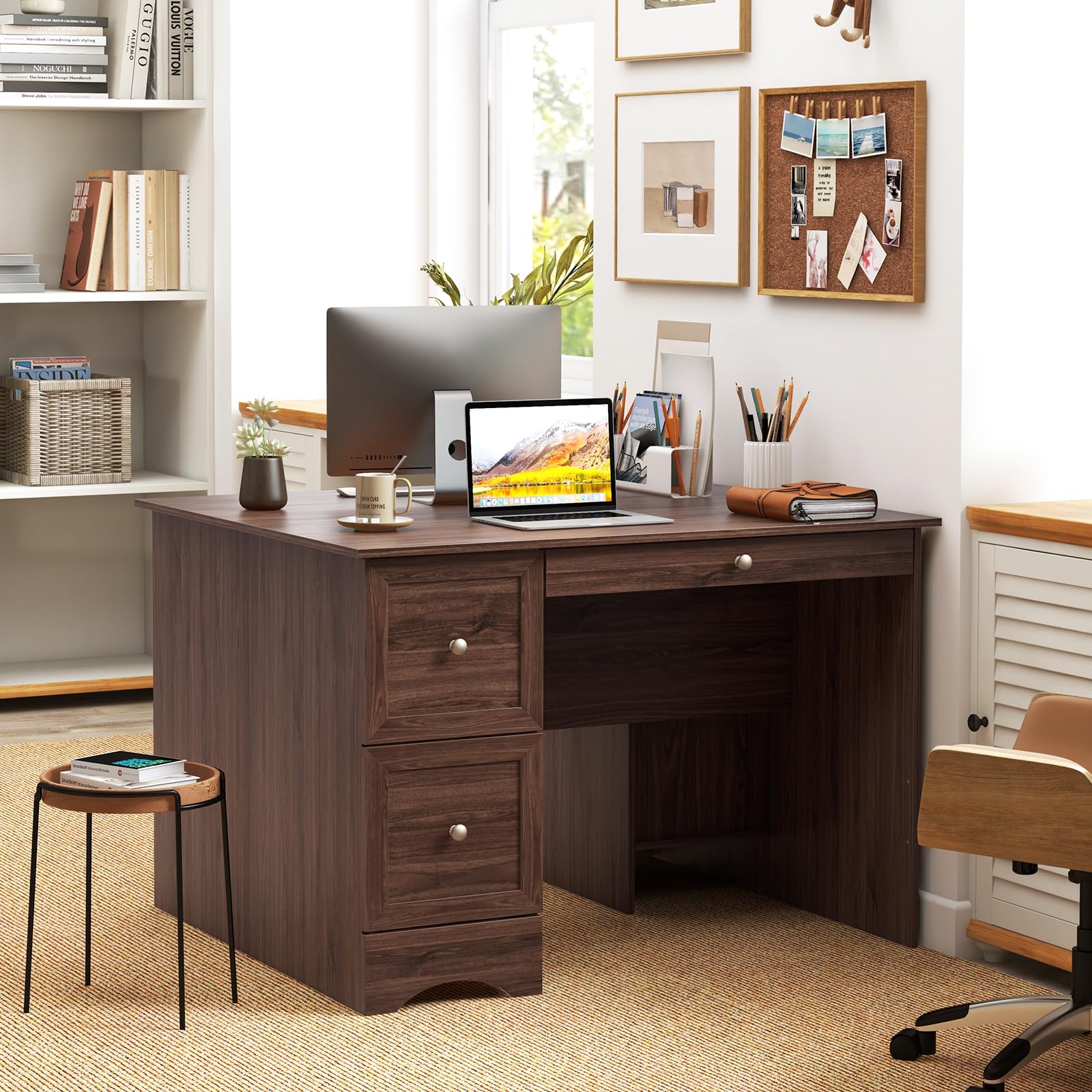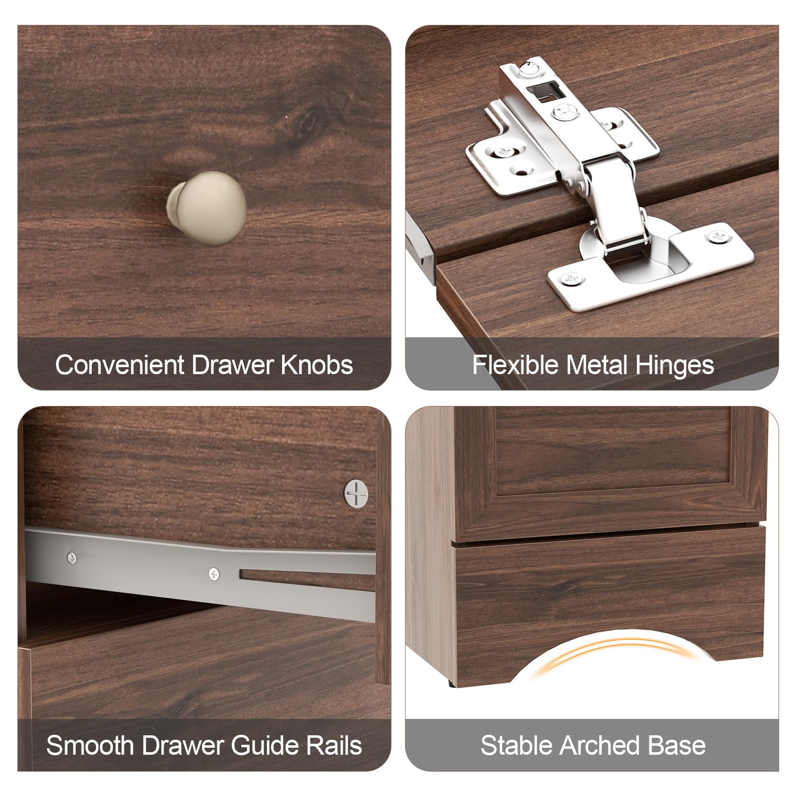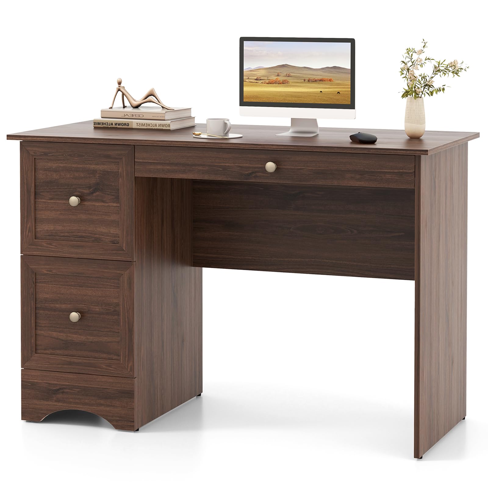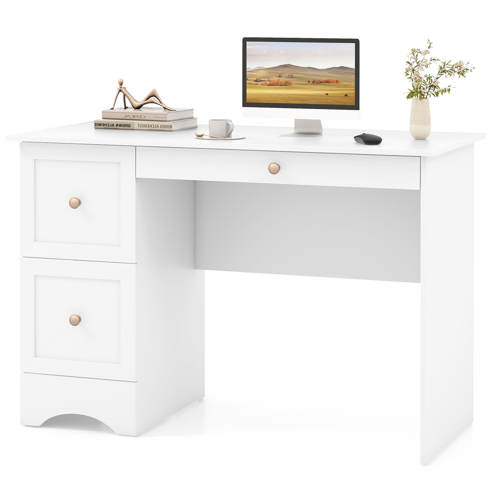 - Durable & User-Friendly Design: Constructed with premium P2 engineered wood, this PC desk with storage is built to withstand long-term use. The stable arched base ensures overall stability, and the convenient drawer knobs and smooth drawer guide rails allow for easy opening and closing of the drawers.