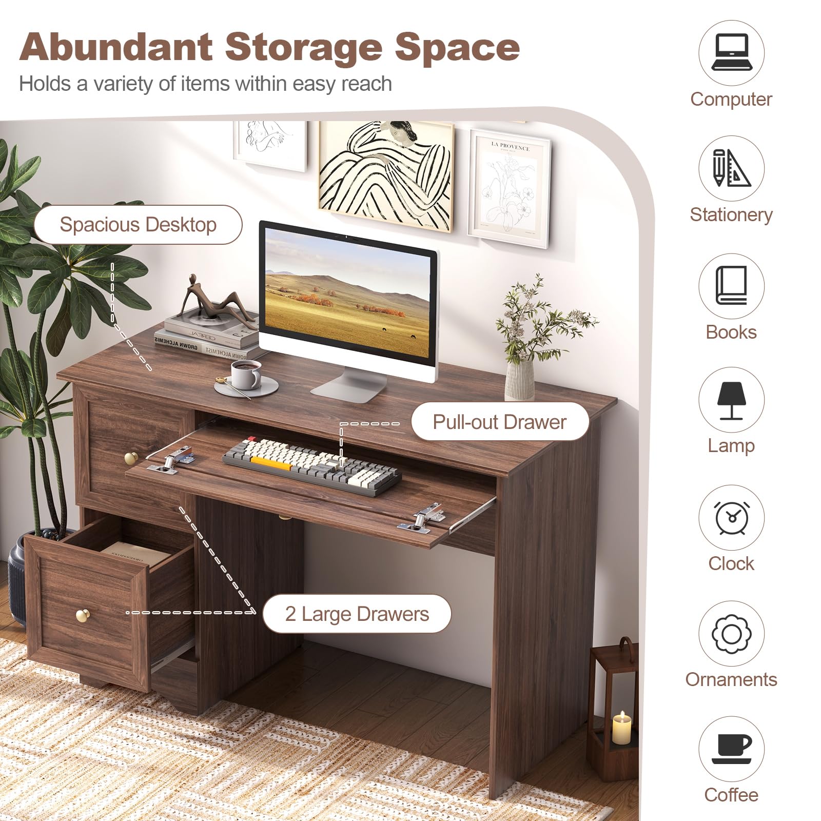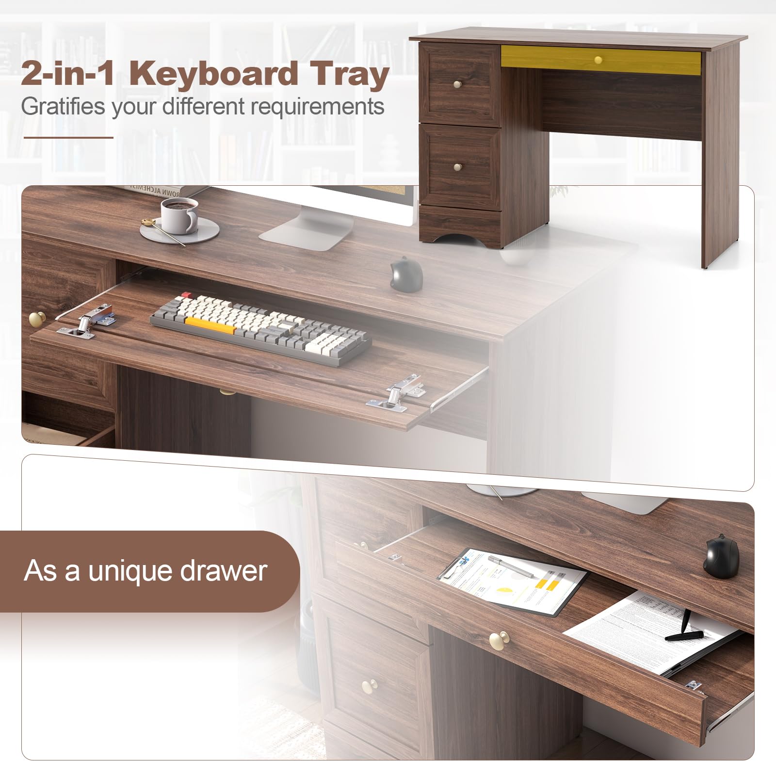 - Abundant Storage Options: Featuring 2 deep drawers, this study writing table offers ample storage for a wide range of items while keeping them protected from dust. Additionally, the unique 2-in-1 keyboard tray can serve as an additional drawer for versatile use. You have the freedom to decide how to make the best use of it!