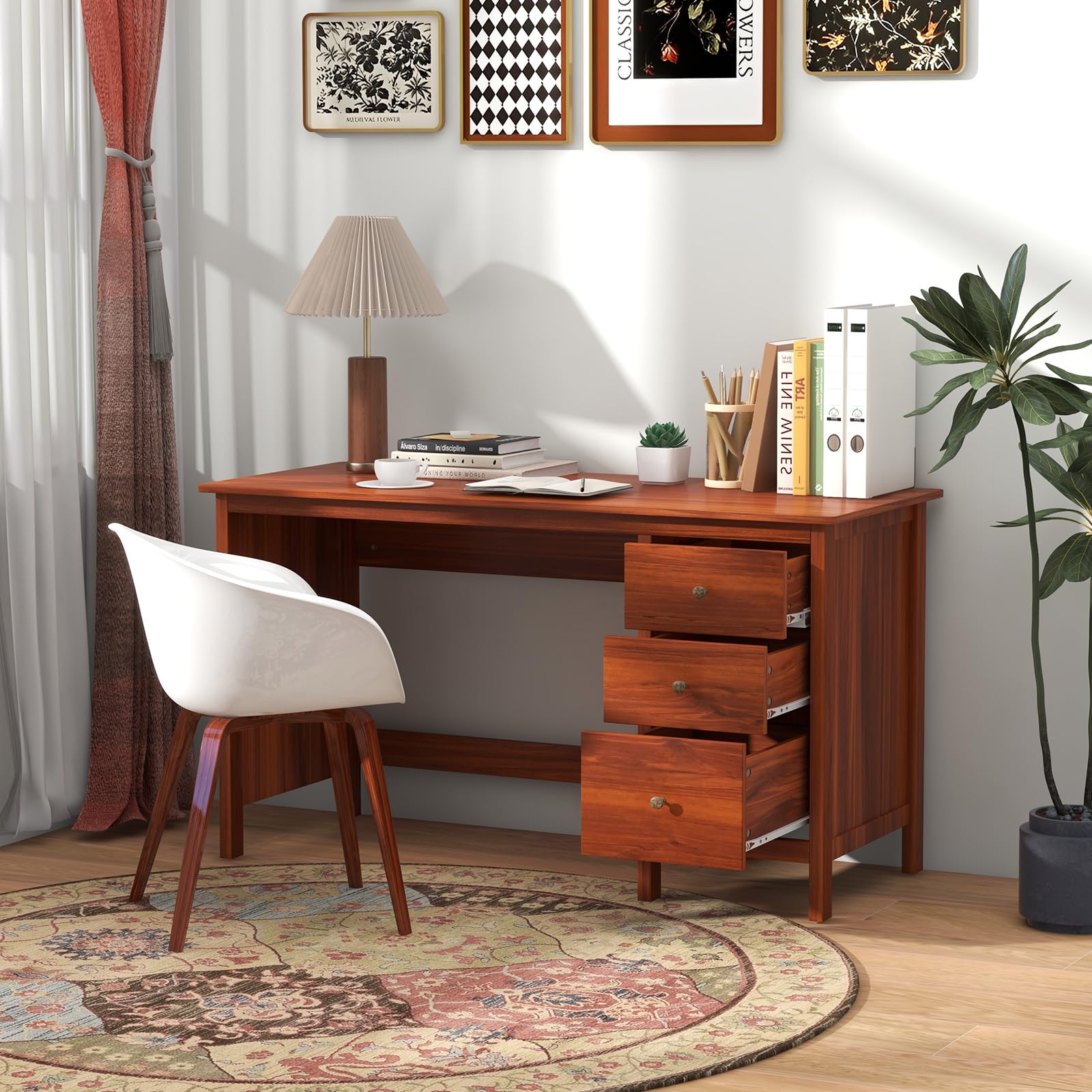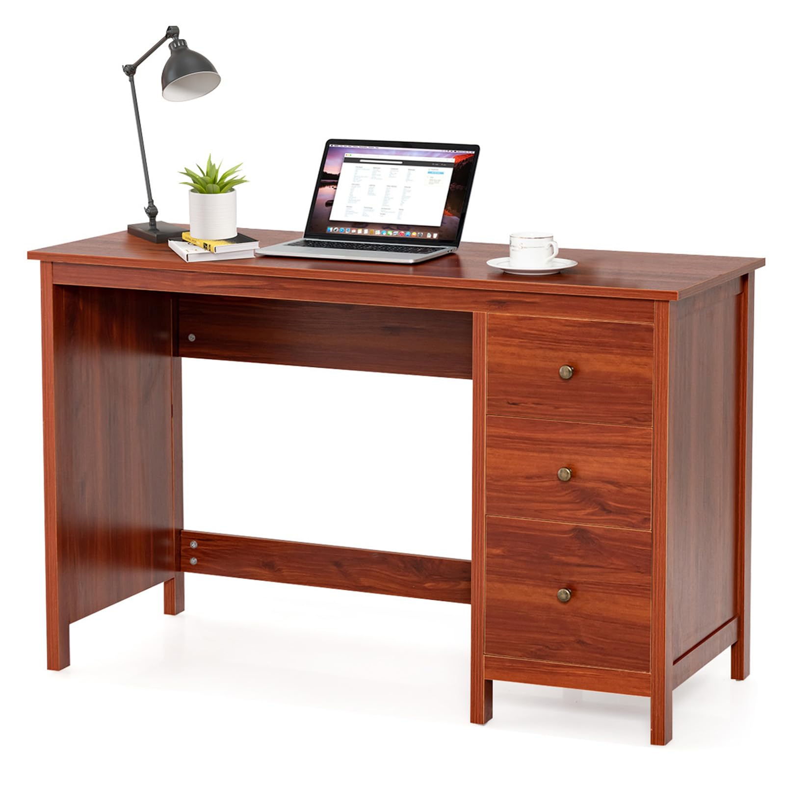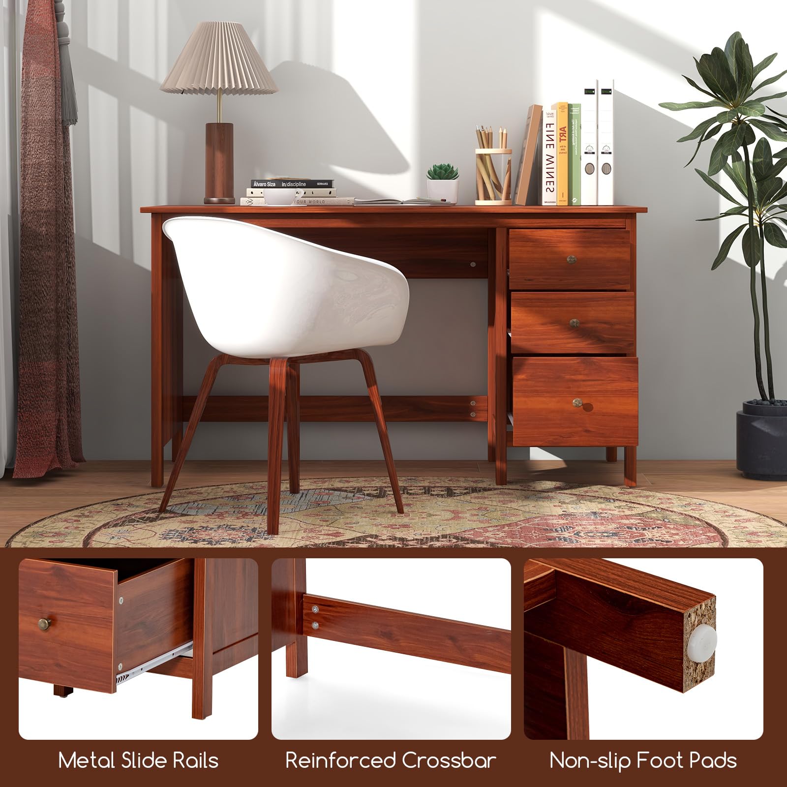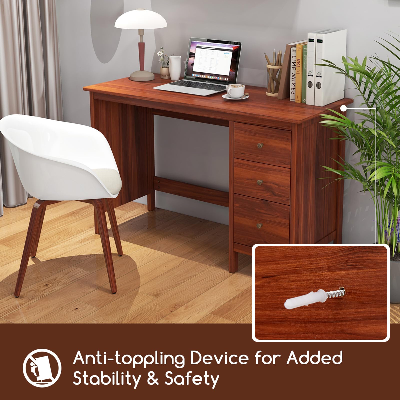 Spacious workstation can free you from messy surroundings and thus to help you concentrate on working for higher efficiency. Featuring 3 large drawers, this writing desk provides versatile storage options for all your office essentials. Safety is a top priority, which is why this computer desk features an anti-toppling device. Together with thickened board, the study desk is a reliable addition to your living space. In addition, whether used for study, bedroom or office, the desk will be of great satisfaction.