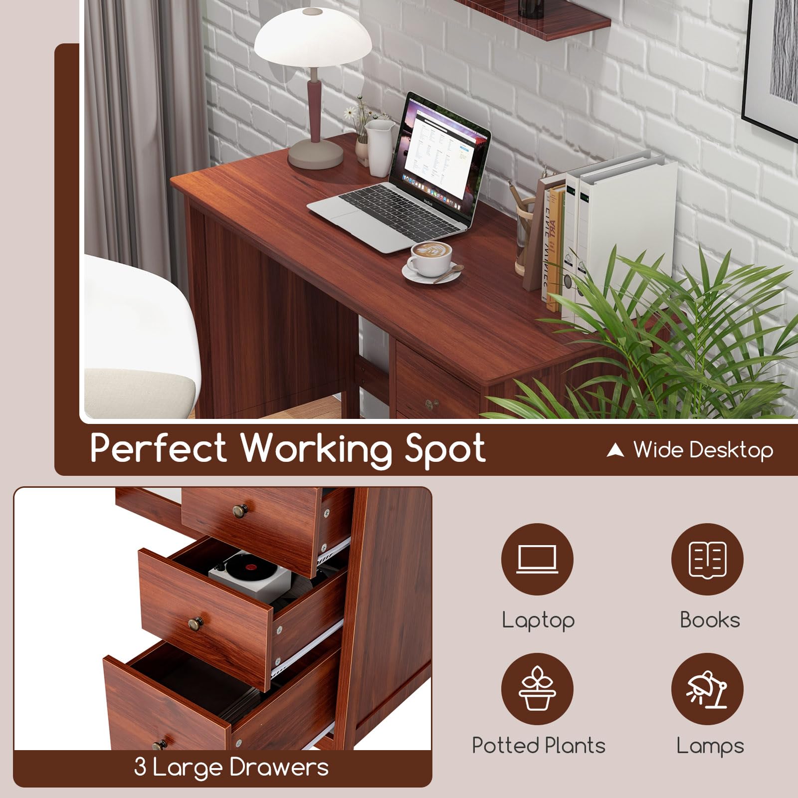 - Spacious Working Area: The wide desktop provides ample storage space for your laptop, books, lamps, and potted plants, etc. Whether you are working on a project or studying, you will have plenty of space to spread out and stay organized.