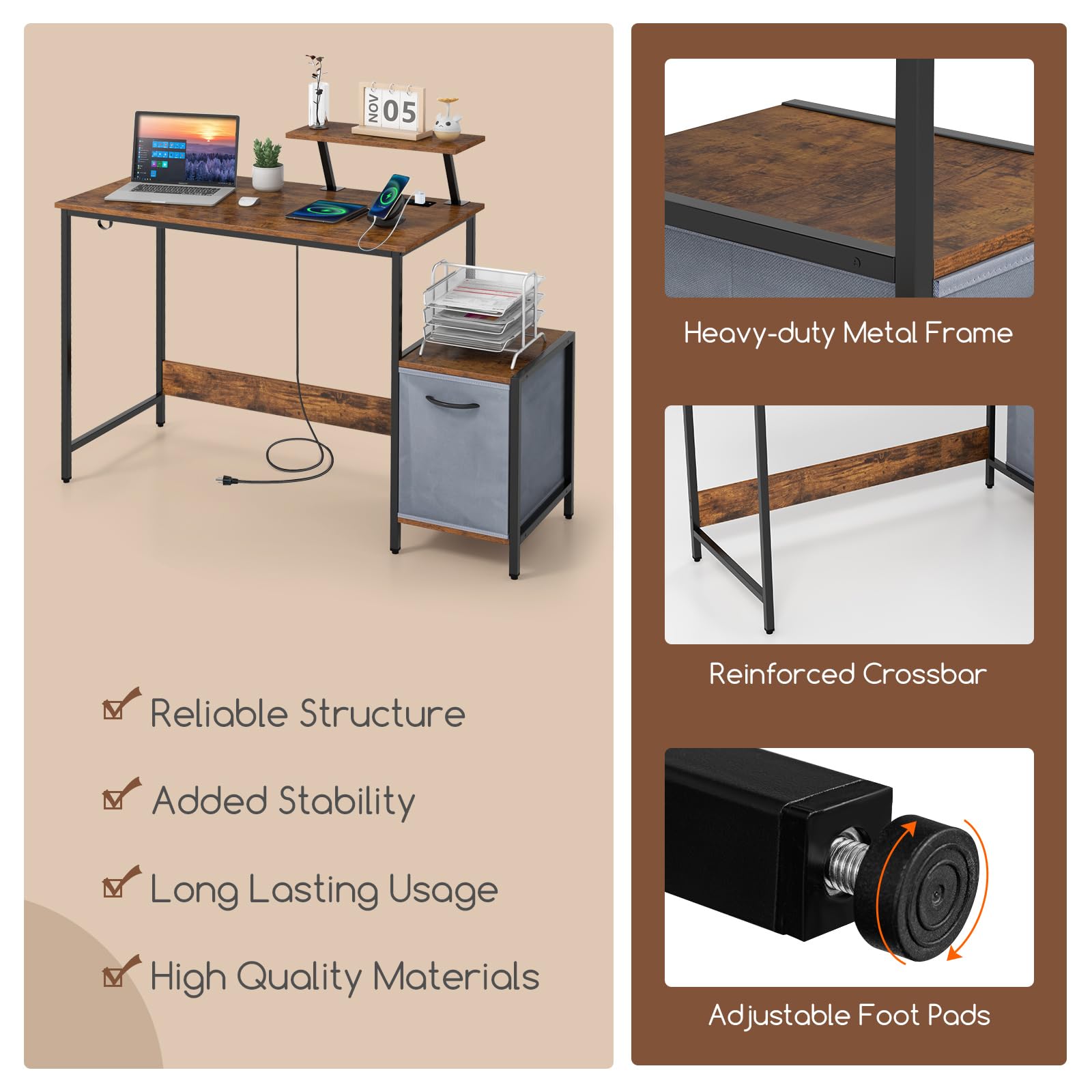 Stay connected and productive with this computer desk, featuring an integrated power outlet for easy charging. The large desktop offers ample room for your essentials. Additionally, the reversible storage drawer and raised shelf can be installed on either side of the desk, allowing you to customize the layout to fit your space. The handy hook and printer stand free up more tabletop surface. Built to last, this sturdy workstation is a reliable addition to your room. This industrial computer desk adds both functionality and style to any home office or study area.