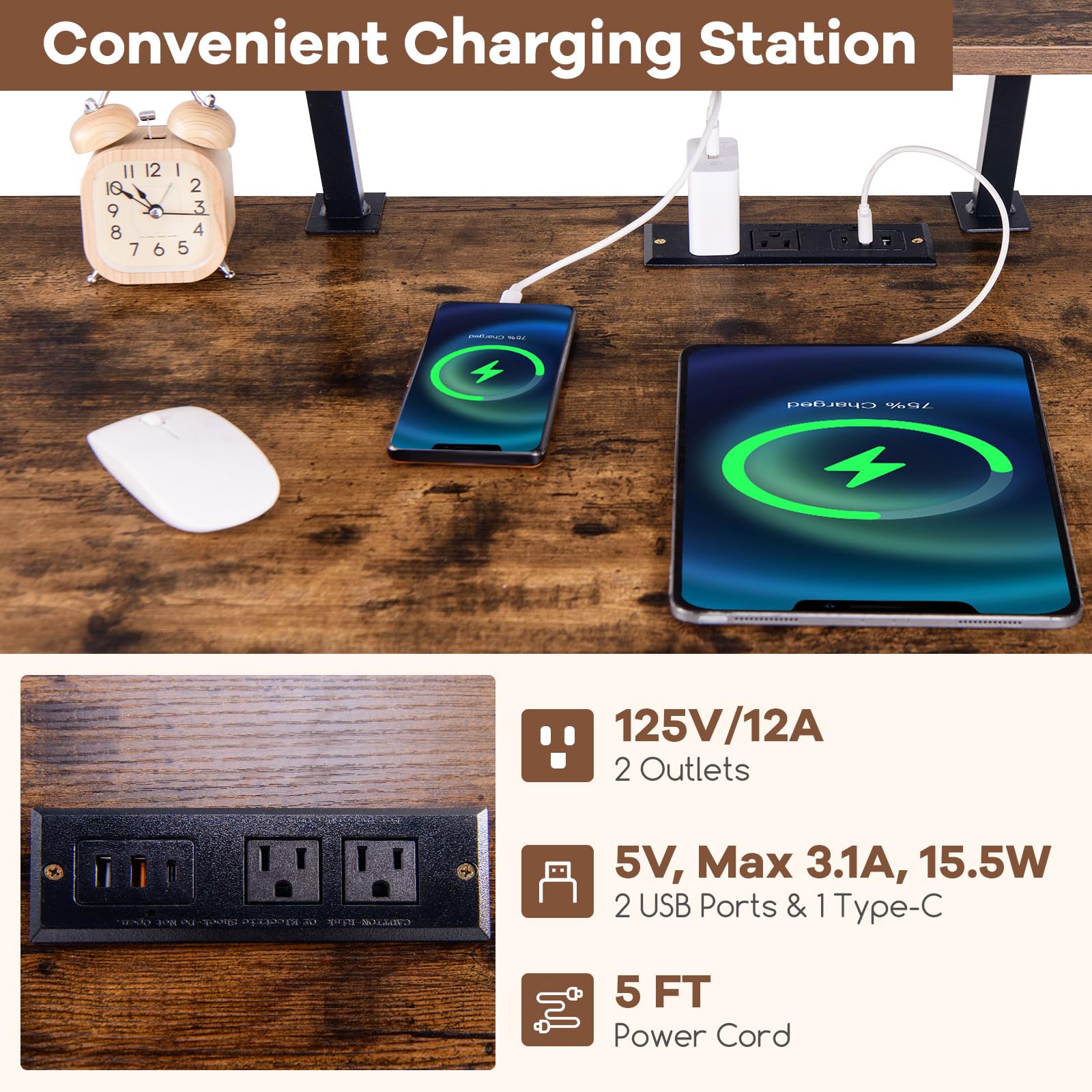 - [Convenient Charging Station]: This computer desk has a built-in charging station for easy access to power supply. There are 2 outlets, 2 USB ports and 1 type-C port to keep all your devices powered and within reach during your work sessions.