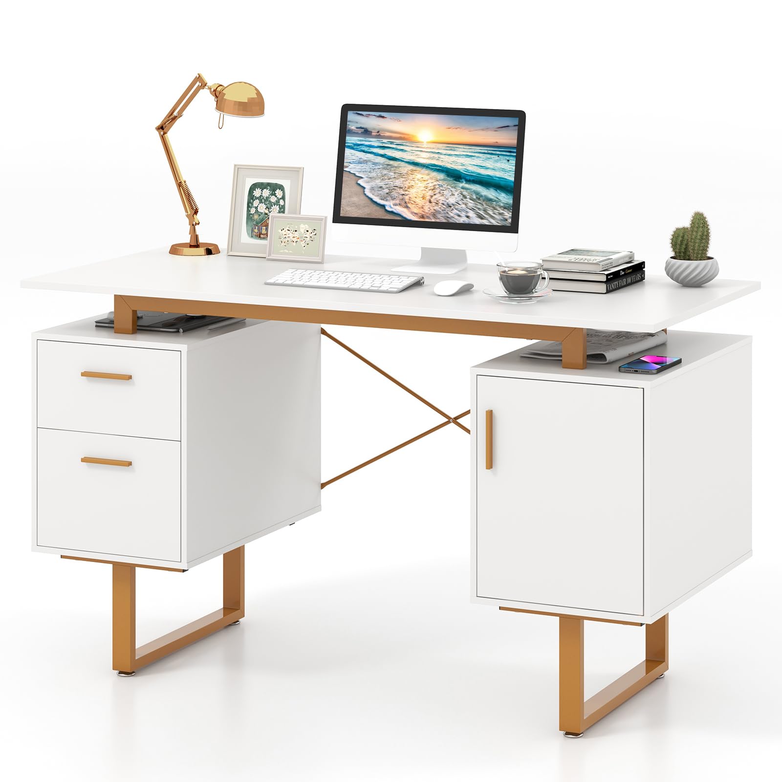 With a roomy 51”L x 23.5”W desktop, this computer desk offers ample workspace and large storage. It boasts dual drawers and an enclosed cabinet for storage, all supported by a stable metal frame with adjustable foot pads. The modern design features a floating desktop for a touch of elegance and additional storage below. The home office desk is the perfect size at 51”L x 23.5”W x 30”H and suitable for a study, home office, or bedroom without occupying too much space. More user-friendly details await your discovery.