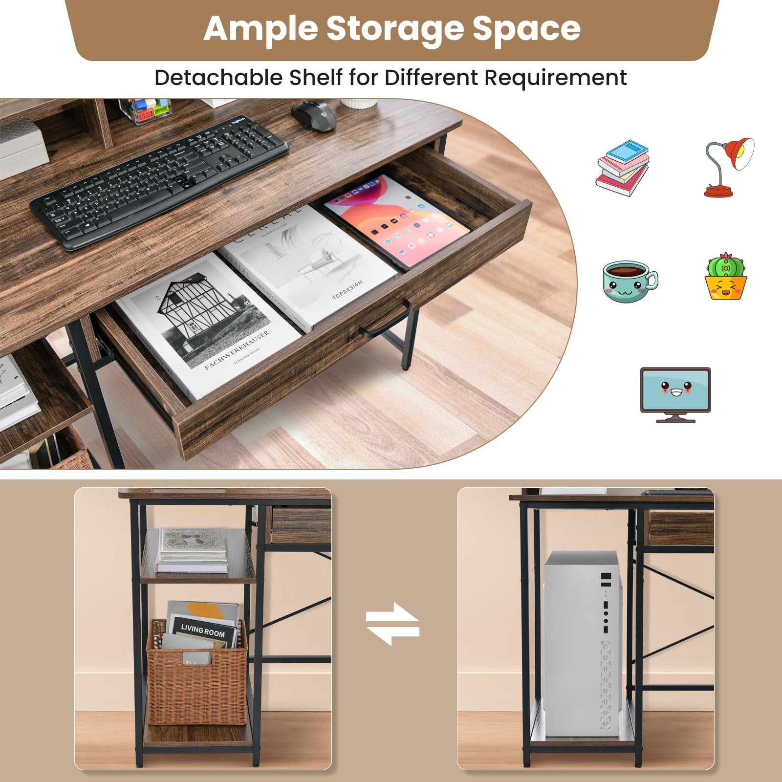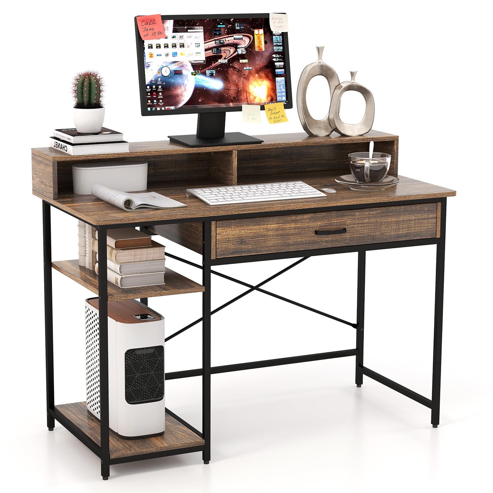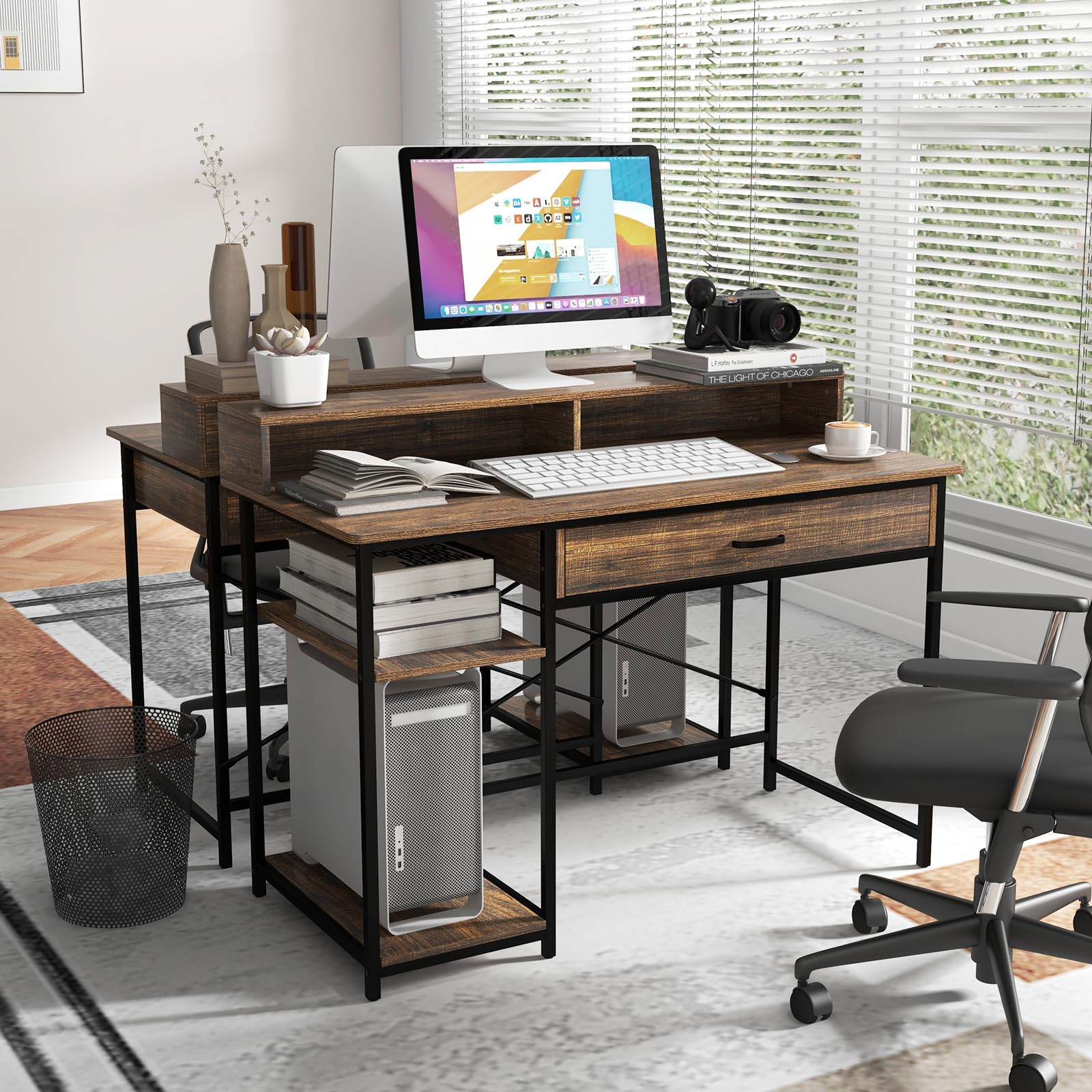 - Large Capacity, Classified Storage: The computer desk is equipped with a monitor stand with 2 storage compartments, a wide & large drawer, an open storage shelf, and a CPU stand. The fully open design provides ample storage space for computer, computer host, books, keyboard, books, cups, and storage boxes to make your room organized.
