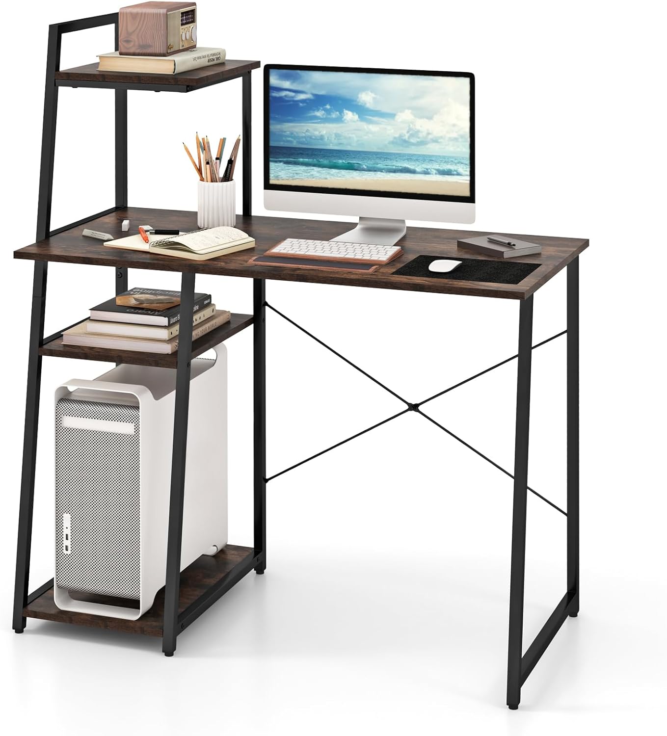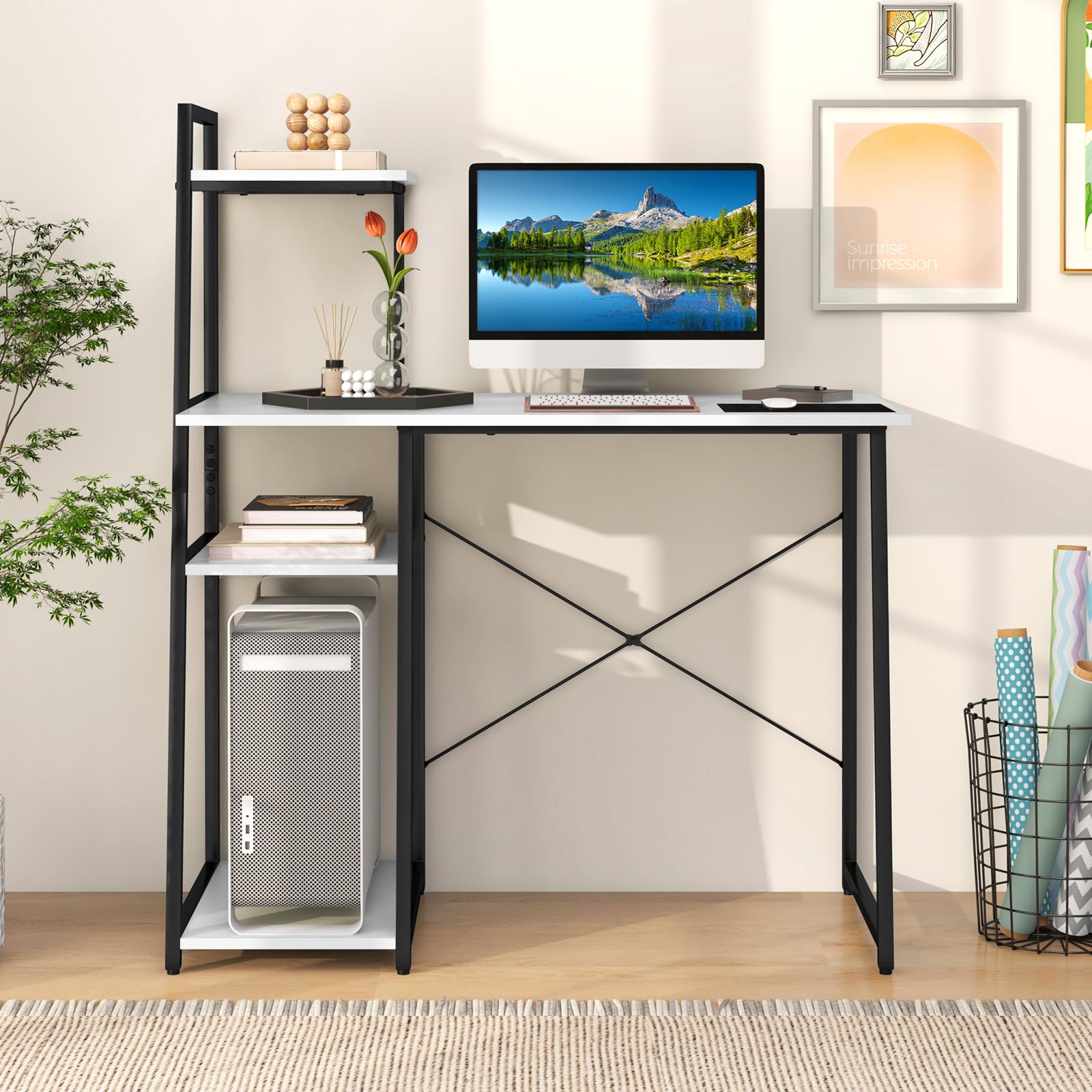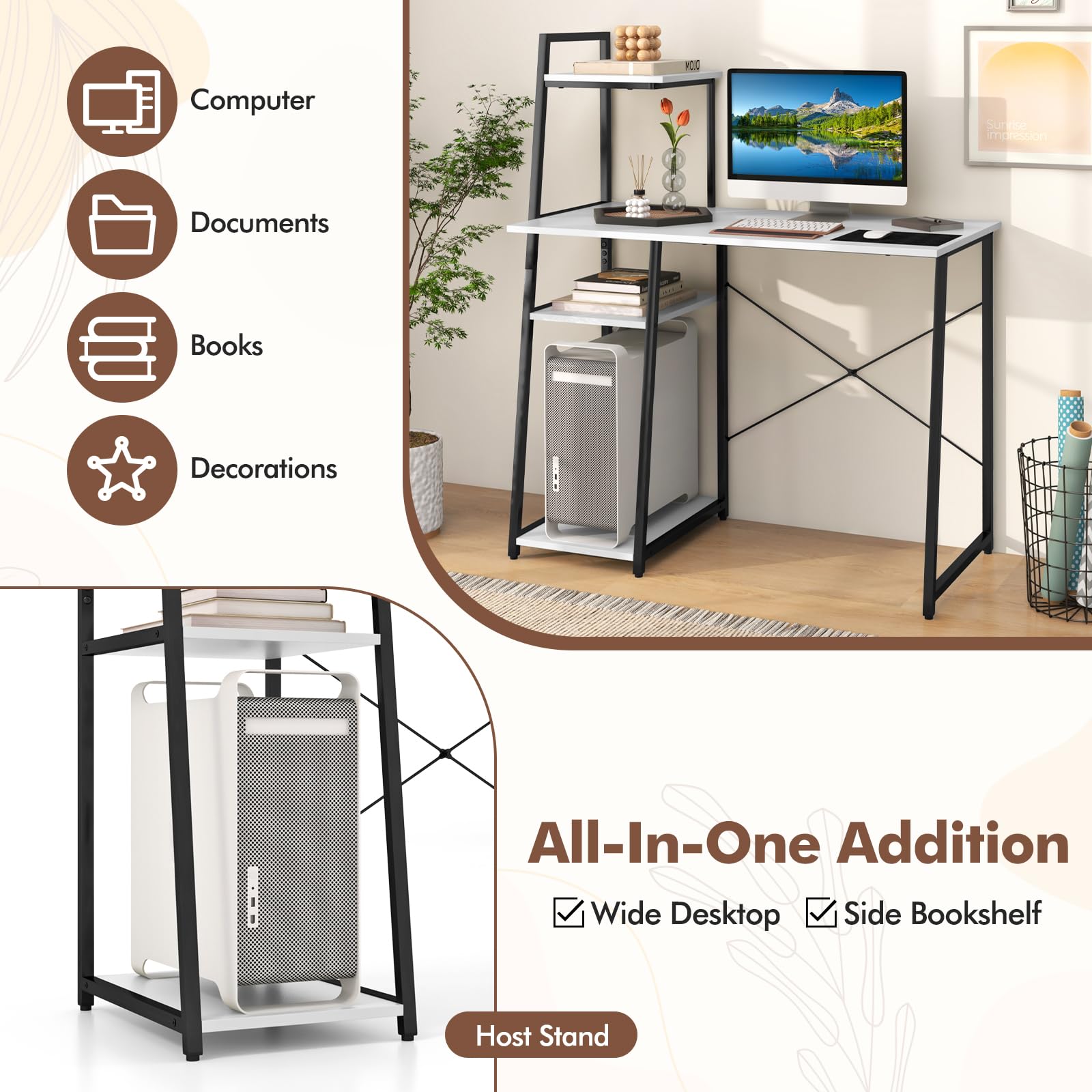 - [More Storage Space]: The study writing desk features a spacious side bookshelf with an anti-falling baffle to safely stash your books. Coupled with a host stand, this desk ensures your essential computing equipment is secured and accessible.