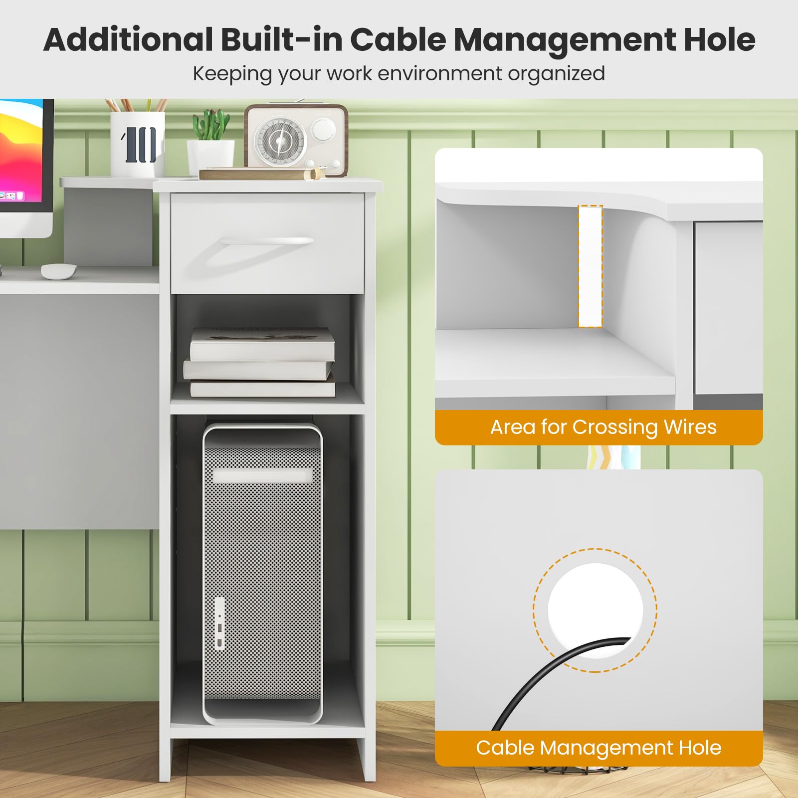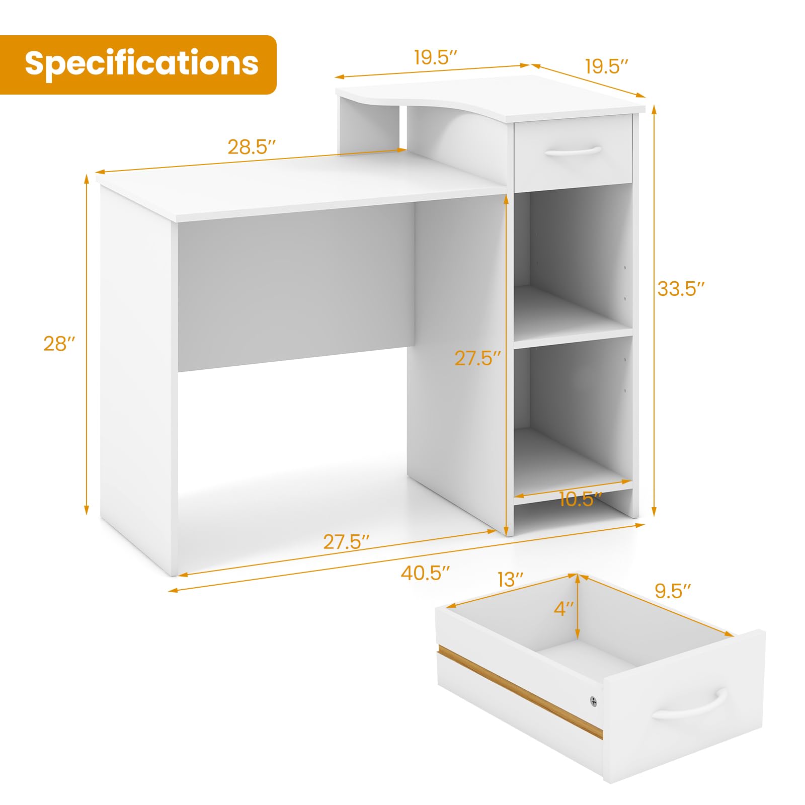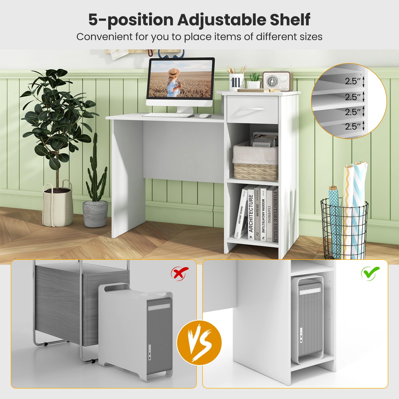 Enhance your workspace organization effortlessly with this multifunctional computer desk. The spacious tabletop and convenient slide-out drawer provide ample space for your essentials, keeping your work area tidy and efficient. Customize your storage options with the versatile 5-position adjustable shelf, perfect for storing a computer host, books, decorations, and more. Say goodbye to tangled wires and distractions with the convenient cable management hole that keeps your workspace neat and organized. Moreover, the desk is built to last, featuring a robust construction and anti-slip foot pads for stability and durability. Its modern and elegant design adds a touch of sophistication to any office, making it ideal for studying, working, or gaming.