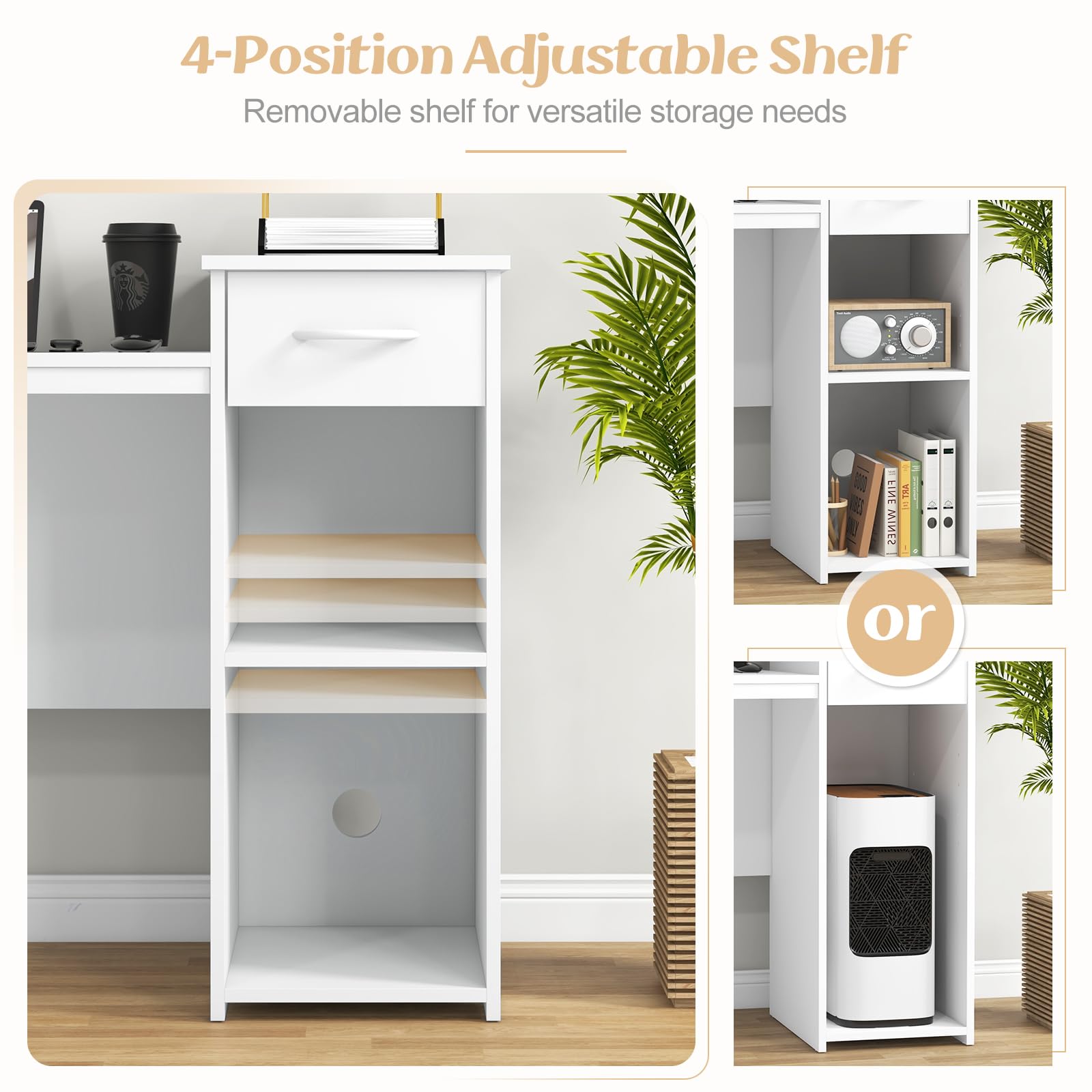 Keep your essentials within reach without the clutter, thanks to a sleek printer shelf, a spacious drawer and 2 open shelves. Crave more space? Adjust away with a height-adjustable shelf that bends to your will - rip it out if your tech desires freedom. Kiss tangled cables goodbye and enjoy a surface as clean as your focus. All this, wrapped in a 43.5" frame that squeezes into snug corners with ease, exuding effortless elegance. Step up your office game; this isn't just furniture, it's your new productivity partner!