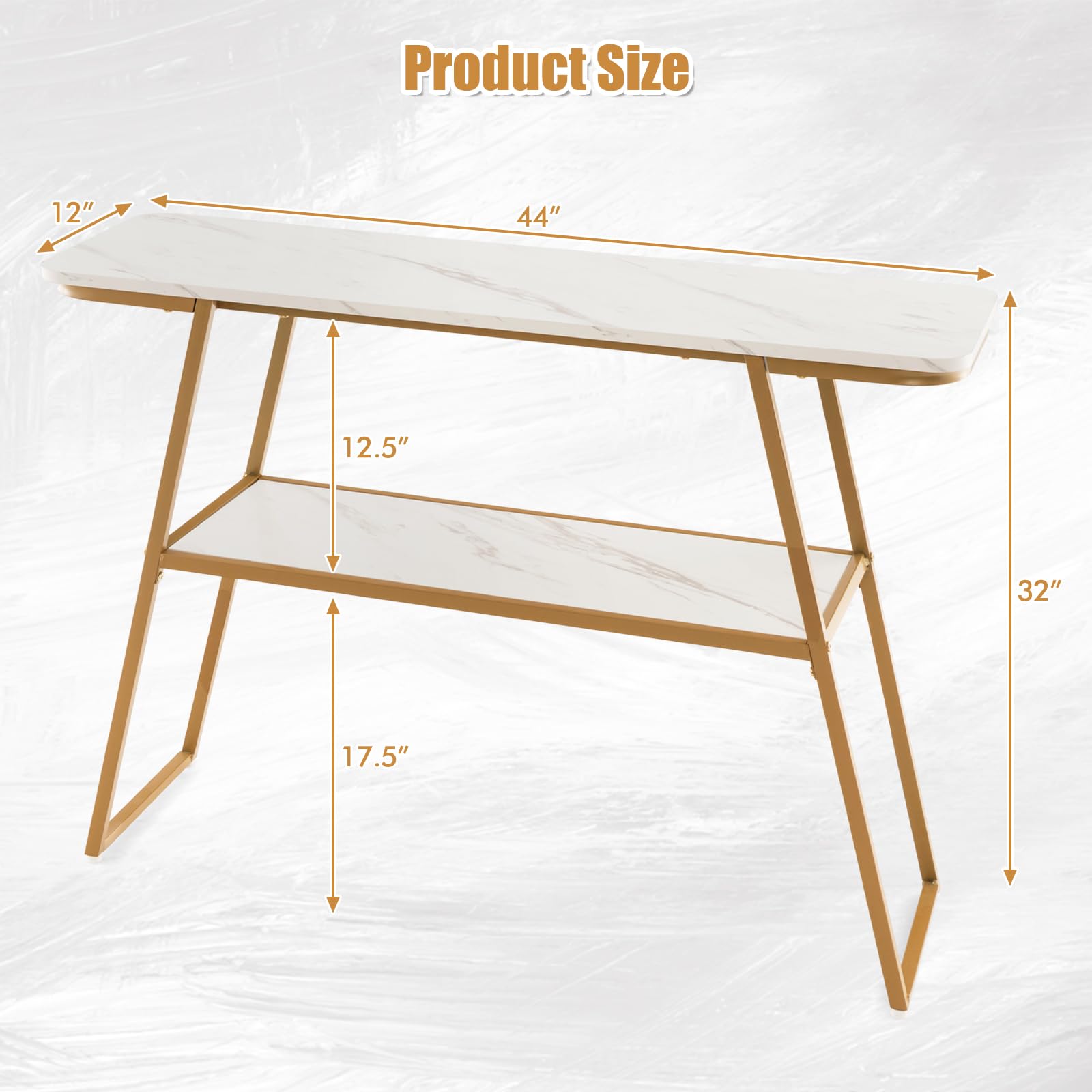 - Quality Marble-like Tabletop: The tabletop and shelf are made of thickened board of 0.6”, ensuring durability and resistance to daily wear and tear. The faux marble surface adds an elegant touch and perfectly complements the golden metal frame, enhancing the overall aesthetic appeal of the console table.