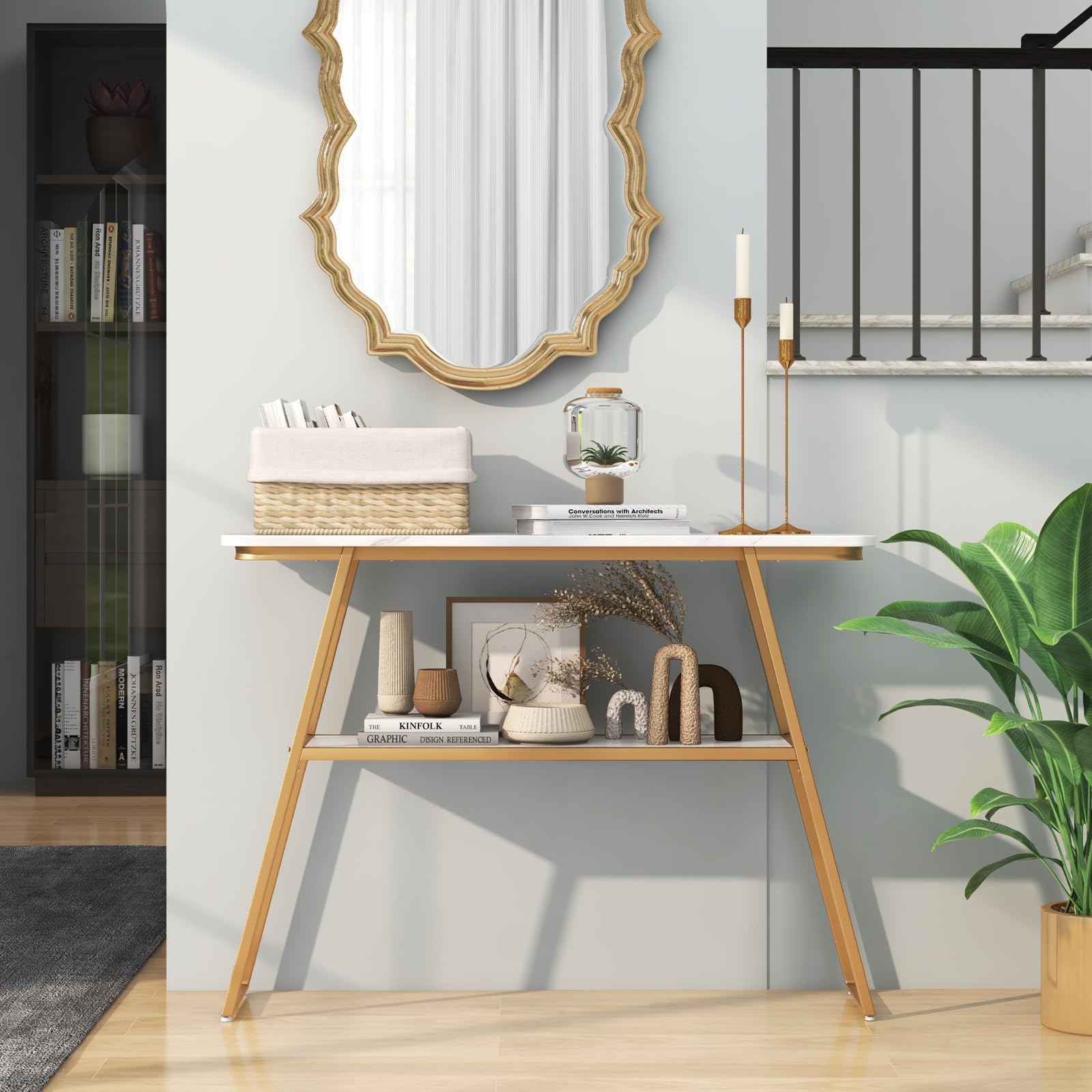 Elevate the elegance of your home with our gold console table! This stylish piece features a 2-tier storage shelf, providing ample space to keep your belongings organized and easily accessible.