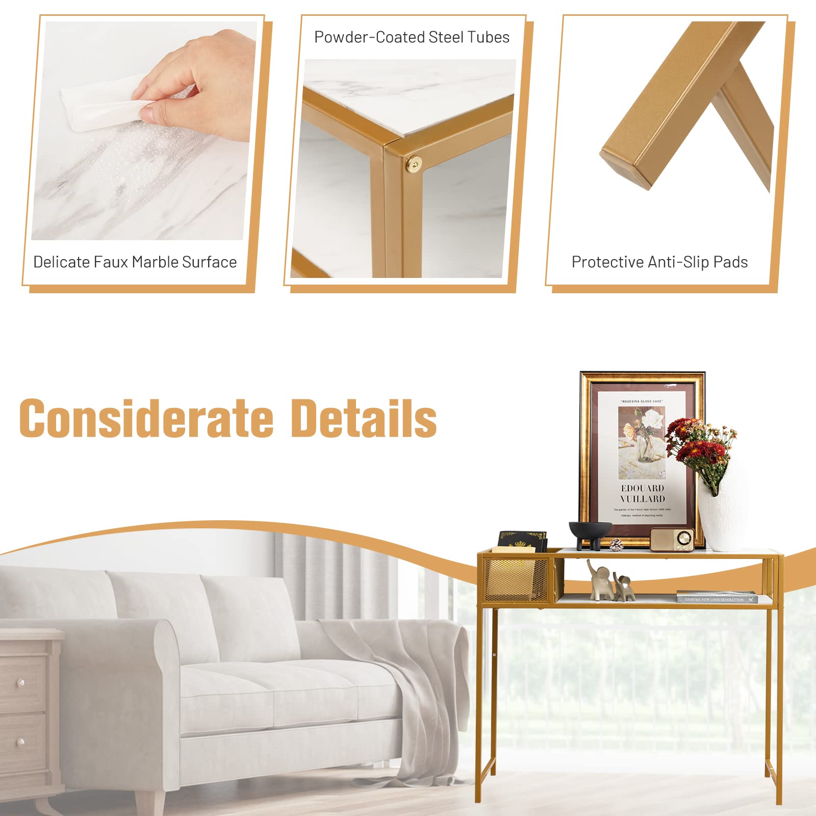 The console table offers ample storage space to meet daily needs, a tabletop for food preparation, a shelf for collection display and a wire basket for sundry storage. More, it perfectly combines faux marble design and gold frame, bringing a deluxe feeling. Also, the steel structure highly ensures the strong load capacity. Together with an anti-toppling device, stable using is perfectly ensured. And there is no need for you to worry about scratches, cause anti-slip pads will effectively protect the floor. Depending on actual needs, the console table is ideal for the living room, dining room, kitchen and more places to play different roles.