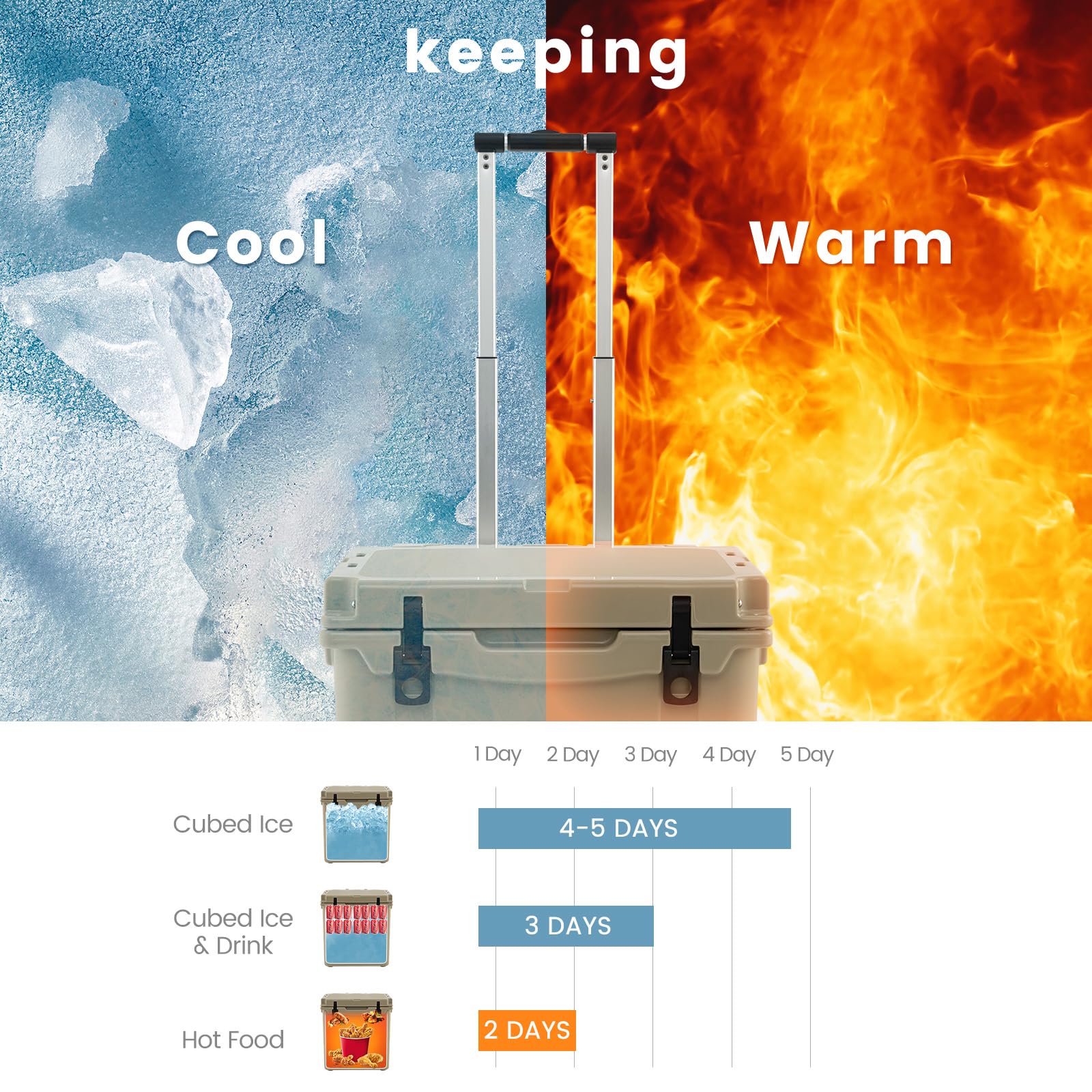- 【Premium Insulation】: Our travel cooler is built with high-performance insulated PU material, providing a thick insulation layer for optimal temperature retention. It can keep ice frozen for 3-5 days, and drinks cold for 3 days. It can also keep hot food warm for up to 2 days. The food grade LLDPE material and sealing strip further extend the cold storage time.