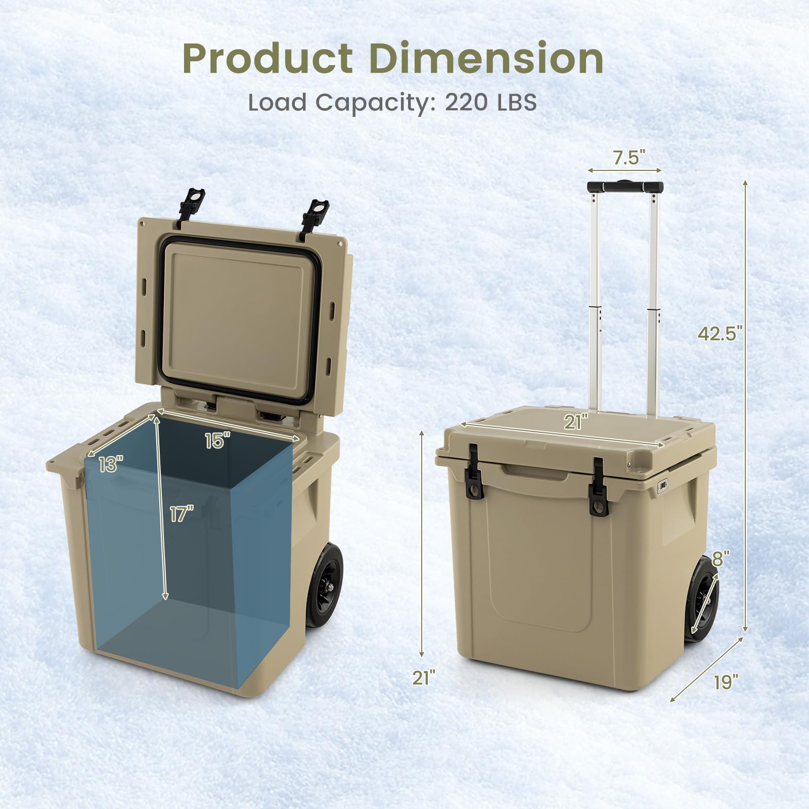 - 【All-Terrain Wheels & Ergonomic Handle】: Our cooler is designed with puncture-resistant, all-terrain wheels, allowing for easy navigation over rough terrains. And a 3 position adjustable handle can be extended from 20.5" to 32.5" or 42.5".