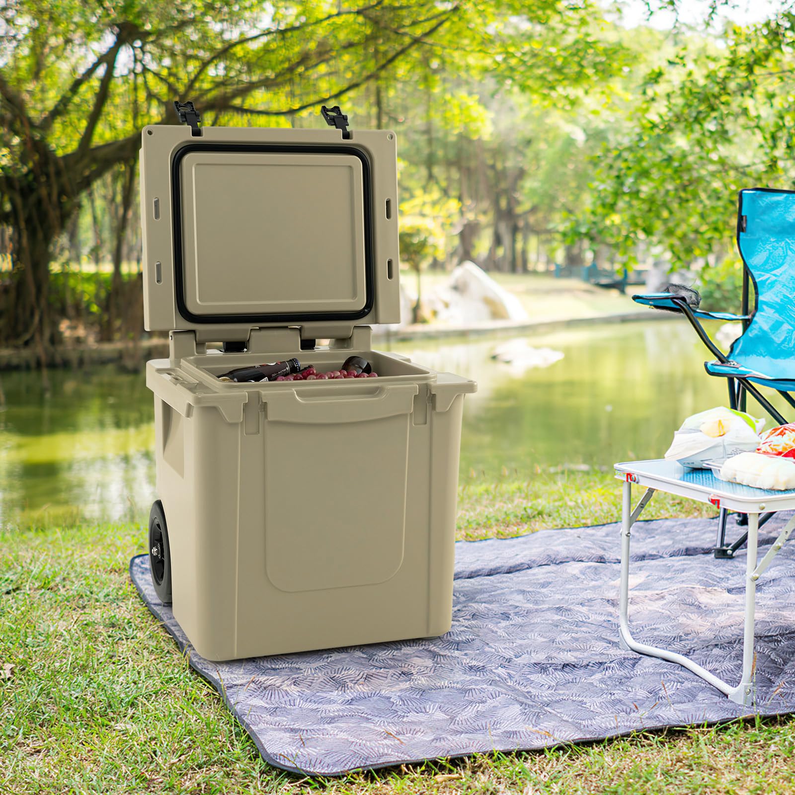 - 【45 Quart Wheeled Cooler】: With a 45 QT ample storage size, this cooler can hold up to 59 cans (330ml). Ideal for camping or fishing, it's also great for storing fruits, vegetables, or fish.