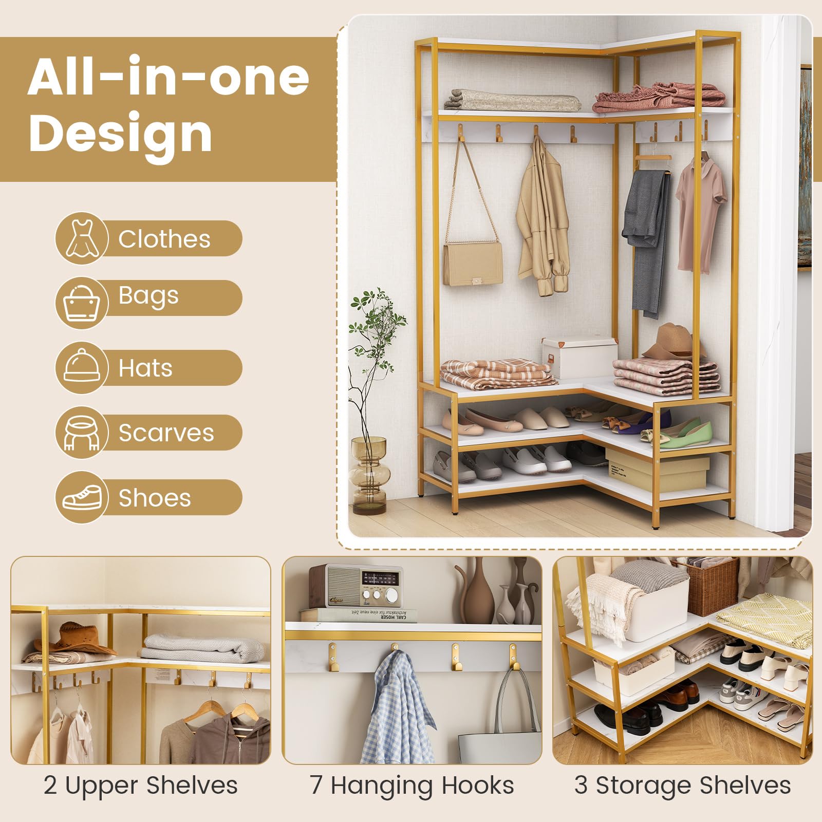• [Multi-purpose Clothes Rack]: The corner garment rack combines the functions of a coat rack, shoe storage, changing shoe bench, and display shelf, satisfying your daily needs. The multifunctional clothes rack will be a perfect storage solution for your home.