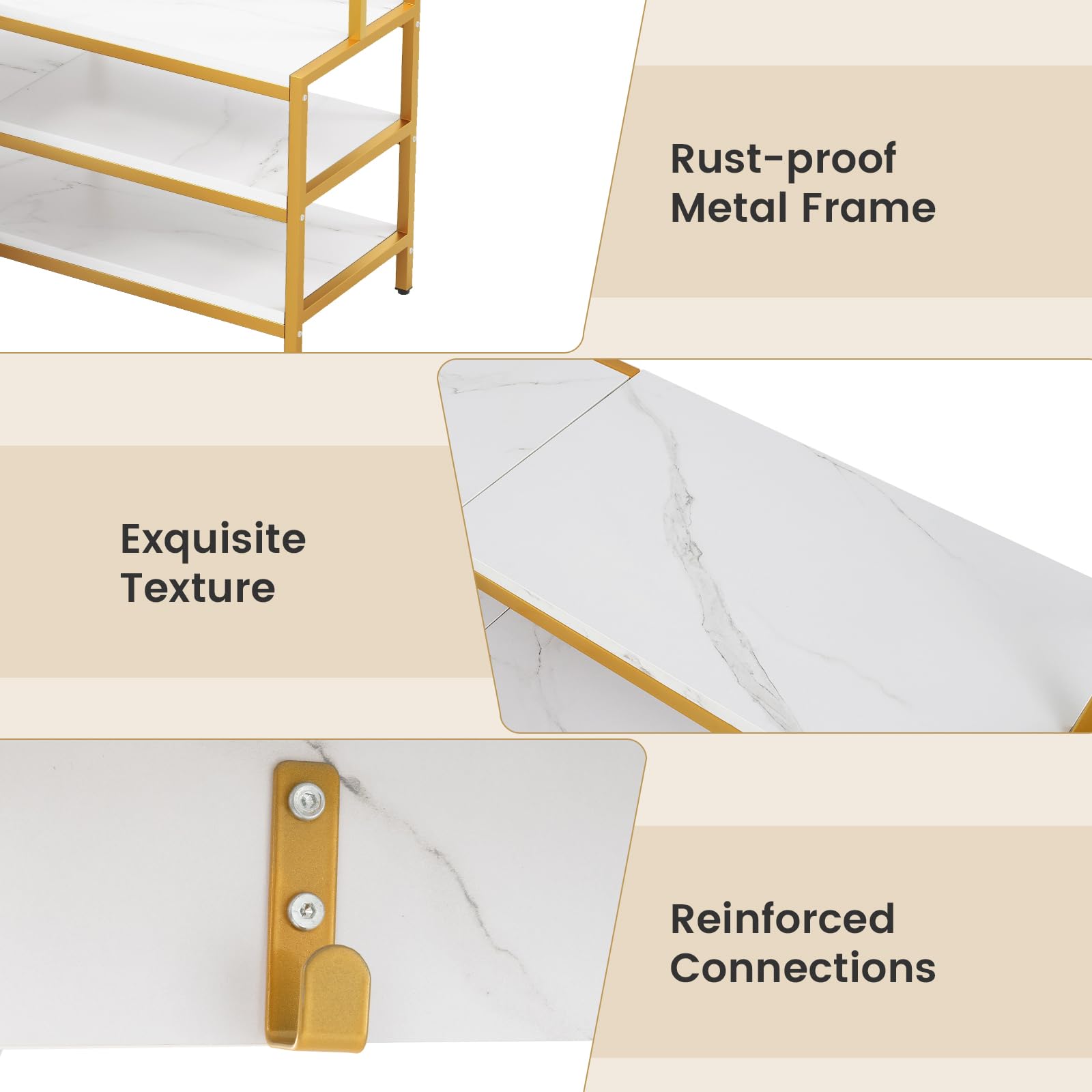 There are 2 upper shelves, 3 bottom shelves, and 7 hanging hooks for you to neatly organize different items. Moreover, the strong metal frame helps it stand sturdily. Adjustable foot pads ensure enhanced sturdiness and prevent the floor from getting scratched. Considering safety use, it is also designed with anti-toppling devices for outstanding stability. Thanks to the exquisite texture and black/ golden frame, it will be a real eye-catcher in entryways, living rooms, or bedrooms.
