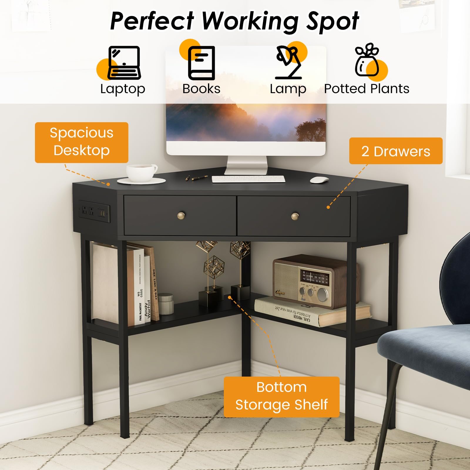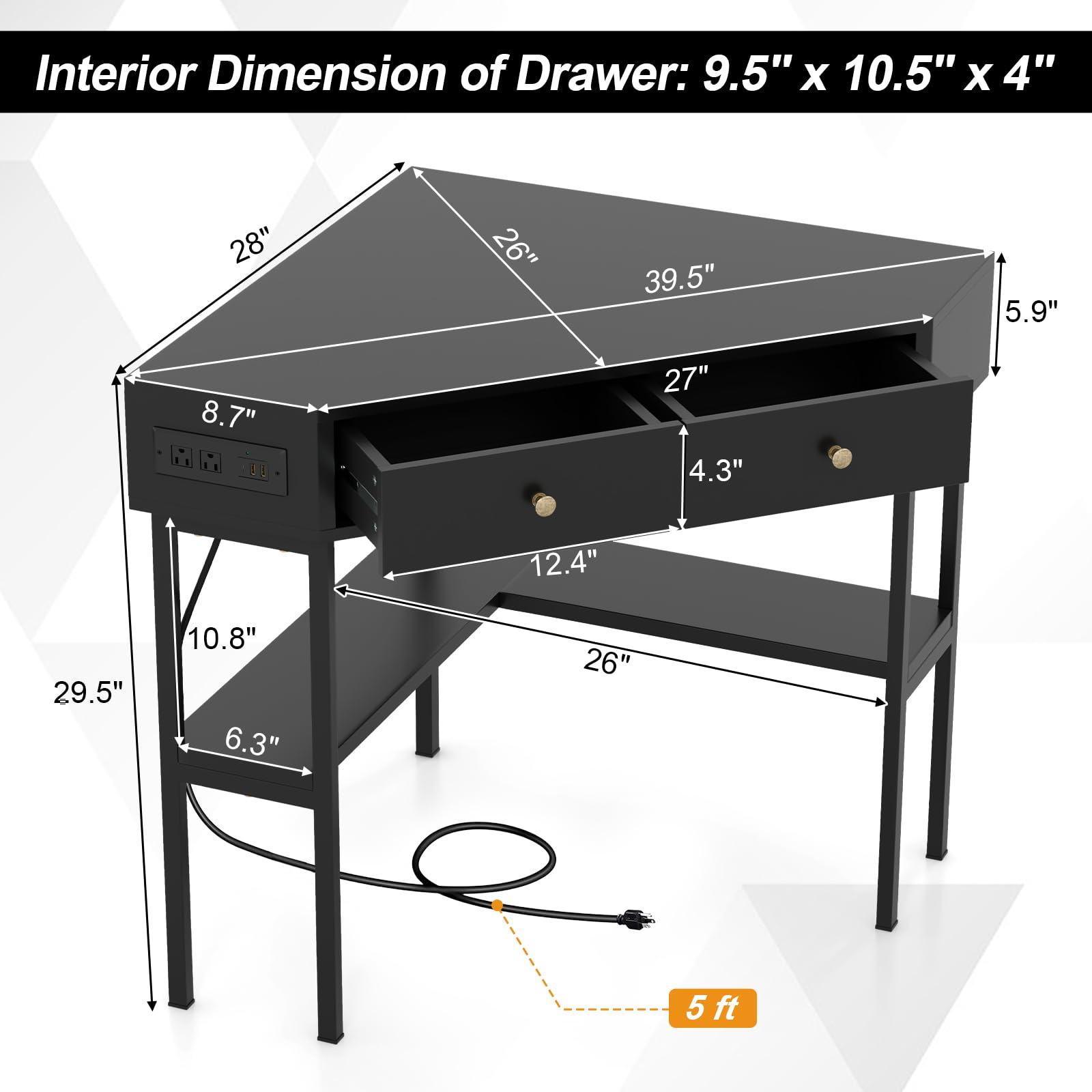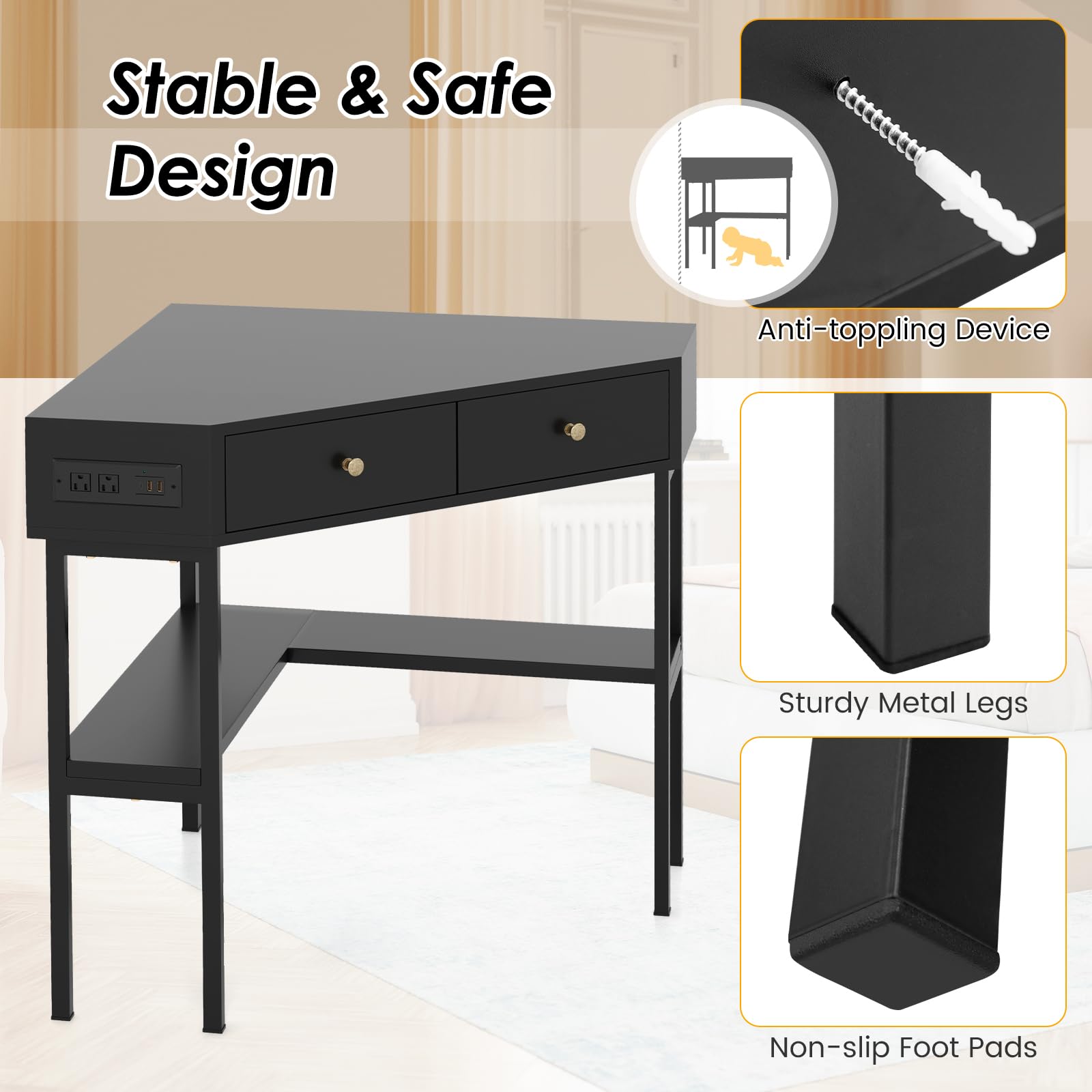 Triangular design can perfectly fit room corners and avoid space occupation, providing ample work surface while optimizing your available space. Equipped with an intimate charging station, this corner desk allows you to keep your devices powered and within reach. There is a wide tabletop, 2 pull-out drawers and a storage shelf to store your essentials, such as laptop, books, lamp, and potted plants. For reliable structure, the triangle computer desk features anti-toppling device that prevents accidental tipping, making it safe for use in households with children or pets. Sturdy metal legs also enhance highly stability. You'll have a fully functional and space-saving desk that caters to your work needs.