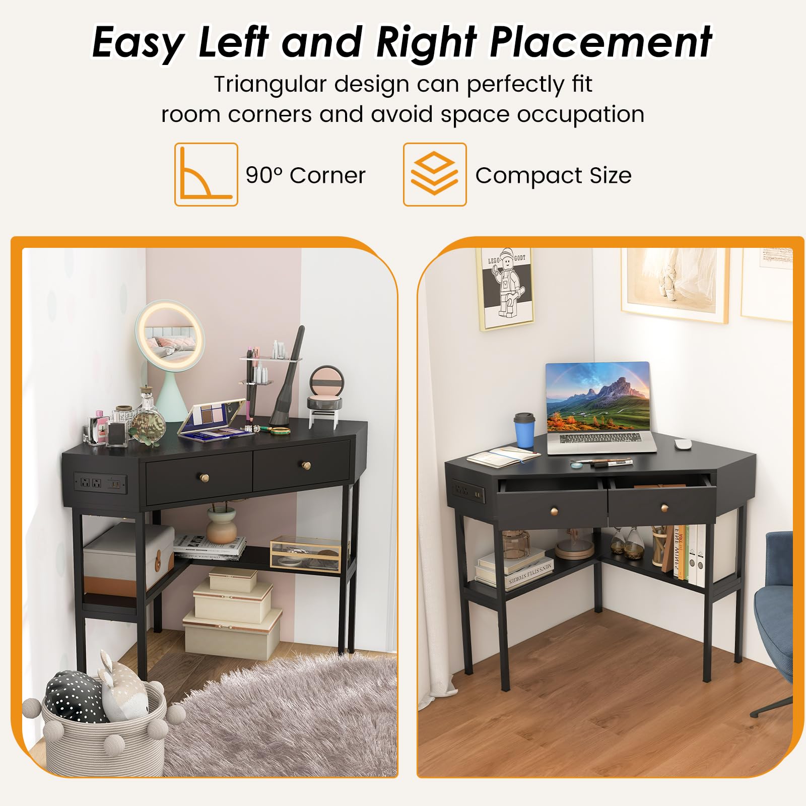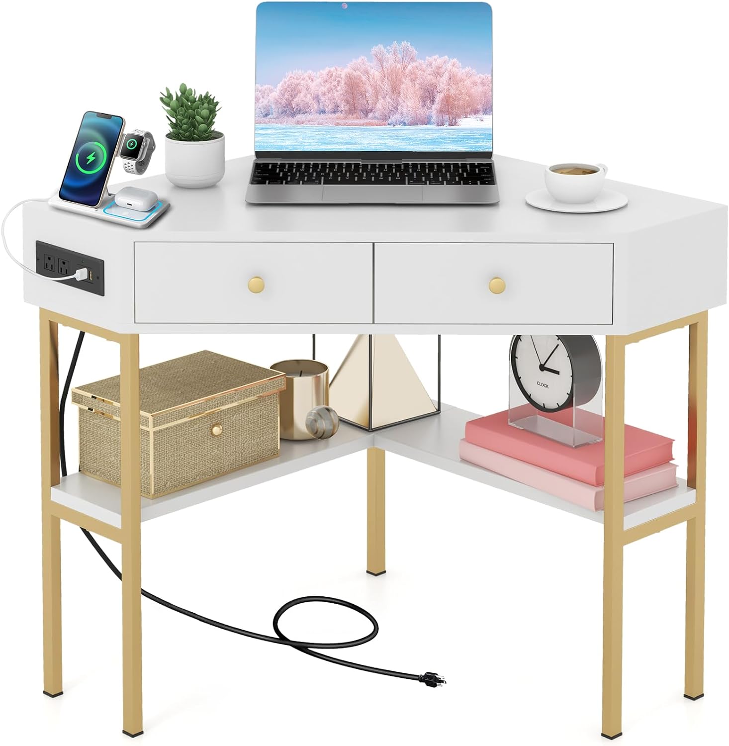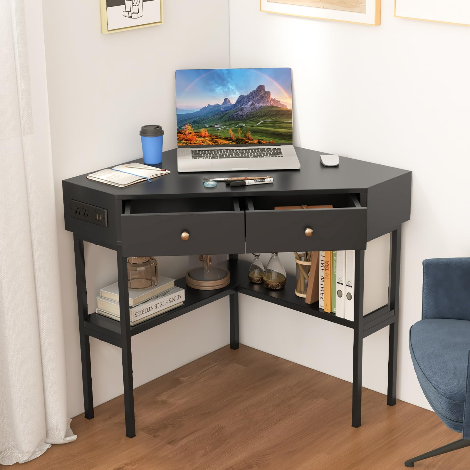 Triangular design can perfectly fit room corners and avoid space occupation, providing ample work surface while optimizing your available space. Equipped with an intimate charging station, this corner desk allows you to keep your devices powered and within reach. There is a wide tabletop, 2 pull-out drawers and a storage shelf to store your essentials, such as laptop, books, lamp, and potted plants. For reliable structure, the triangle computer desk features anti-toppling device that prevents accidental tipping, making it safe for use in households with children or pets. Sturdy metal legs also enhance highly stability. You'll have a fully functional and space-saving desk that caters to your work needs.