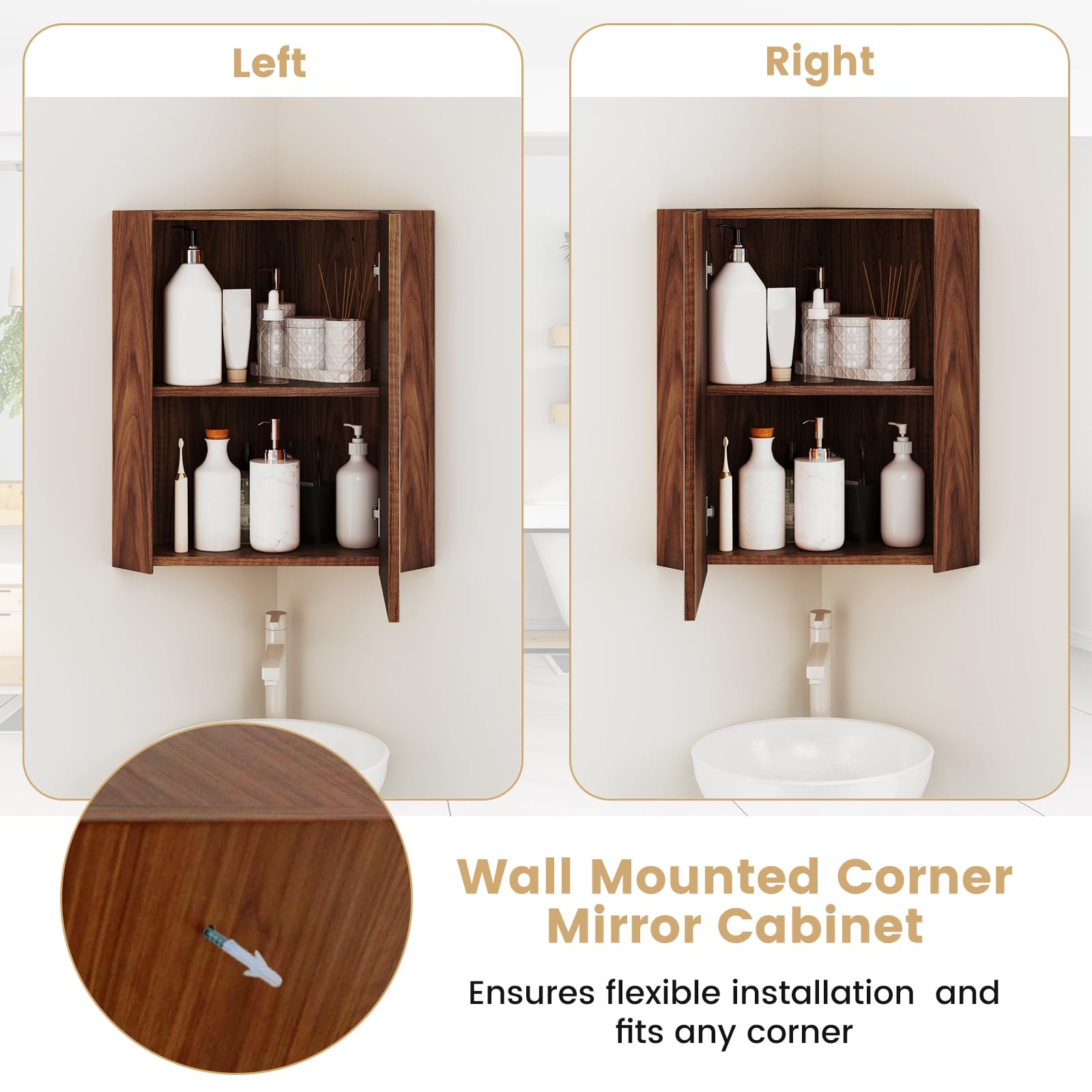 Featuring a high-definition mirror for flawless grooming, this wall storage cabinet allows you to choose the door's opening direction for added convenience. The adjustable shelf lets you customize the interior storage space to suit your needs, while the soft close hinges ensure safety. With its space-saving corner shape and wall-mounted design, this bathroom mirror cabinet maximizes space utilization. Perfect for the bathroom, bedroom, living room, or entryway, it's the ideal solution to keep your space neat and organized.