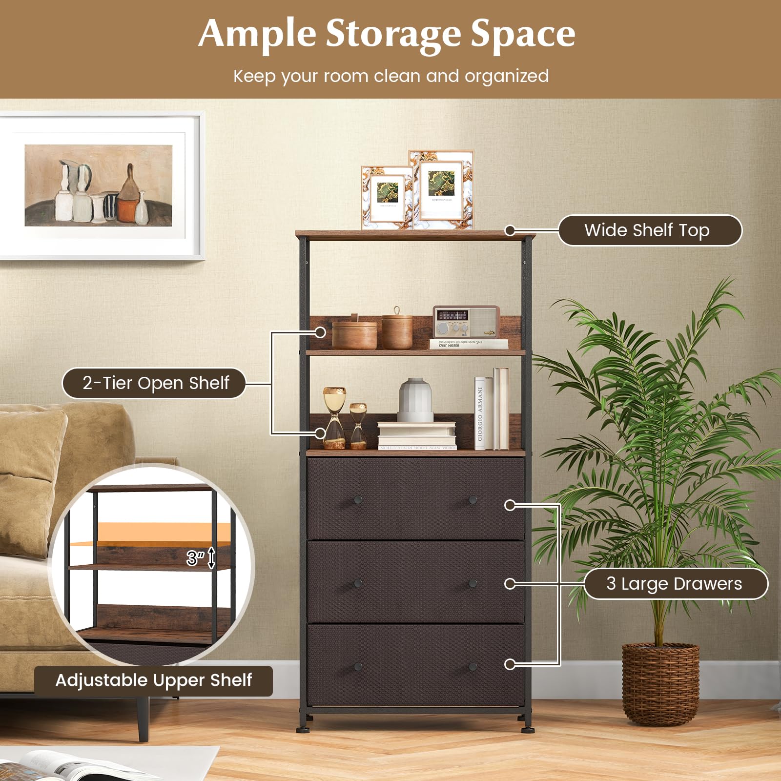 Are you looking for a storage solution that offers ample space to keep your belongings organized? Look no further! Our storage cabinet features 3 large pull-out drawers, a wide shelf top, and a 2-tier open shelf, perfect for storing books, snacks, and more, meeting all your storage needs. The 3 folding fabric drawers can be customized and folded when not in use, while the PVC woven surface adds elegance. Besides, with a modern design suitable for various spaces like the living room, office, dining room, or study, this cabinet enhances both functionality and decoration. Equipped with adjustable foot pads and 2 anti-tipping devices for stability and safety, this cabinet ensures peace of mind. Additionally, installation is a breeze with the detailed manual included, and the easy-to-clean surface adds convenience. Dimensions: 22” x 12” x 46”(L x W x H).
