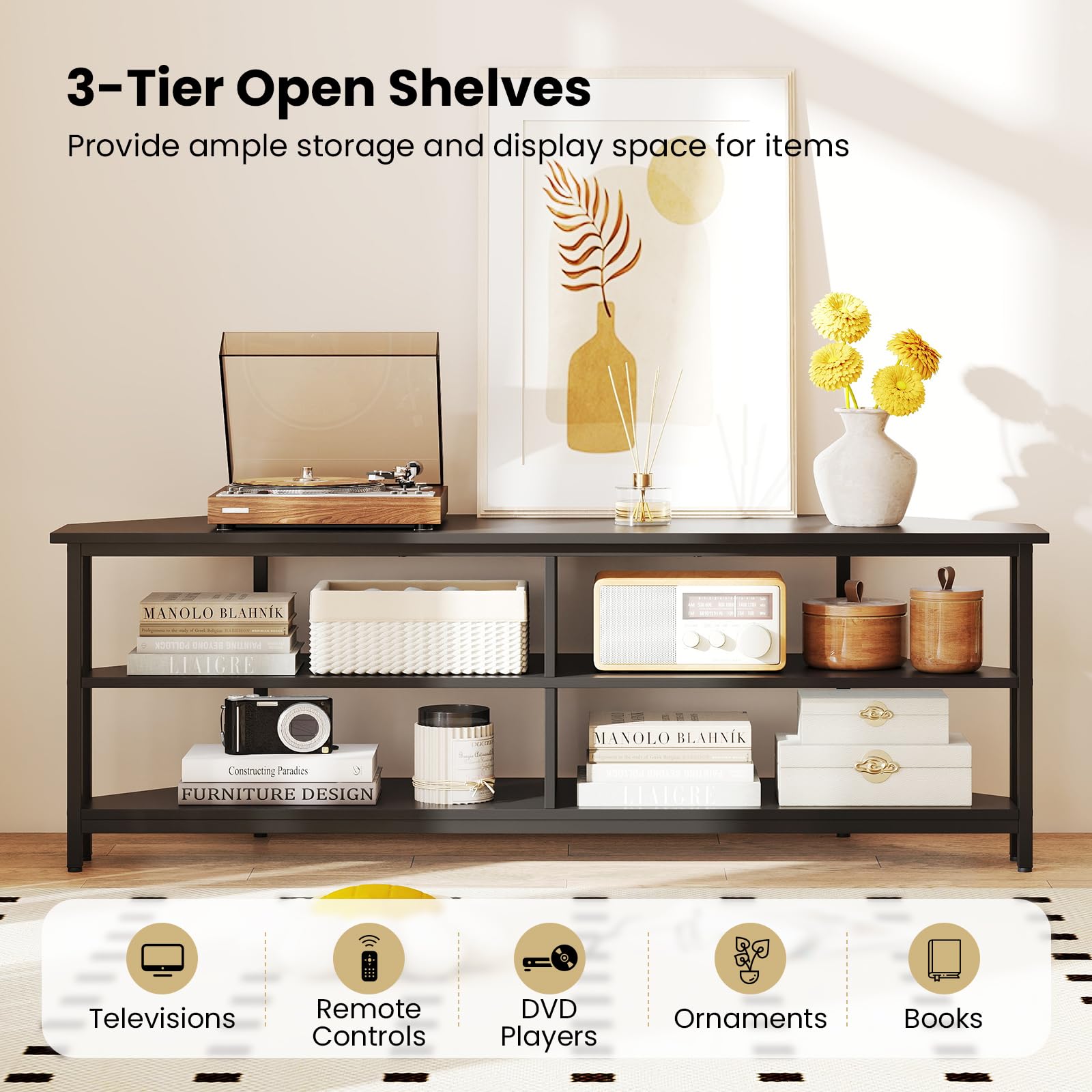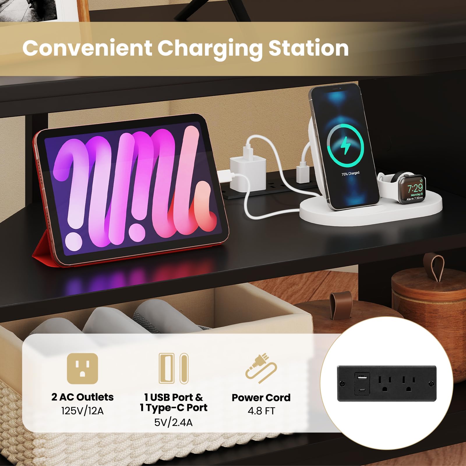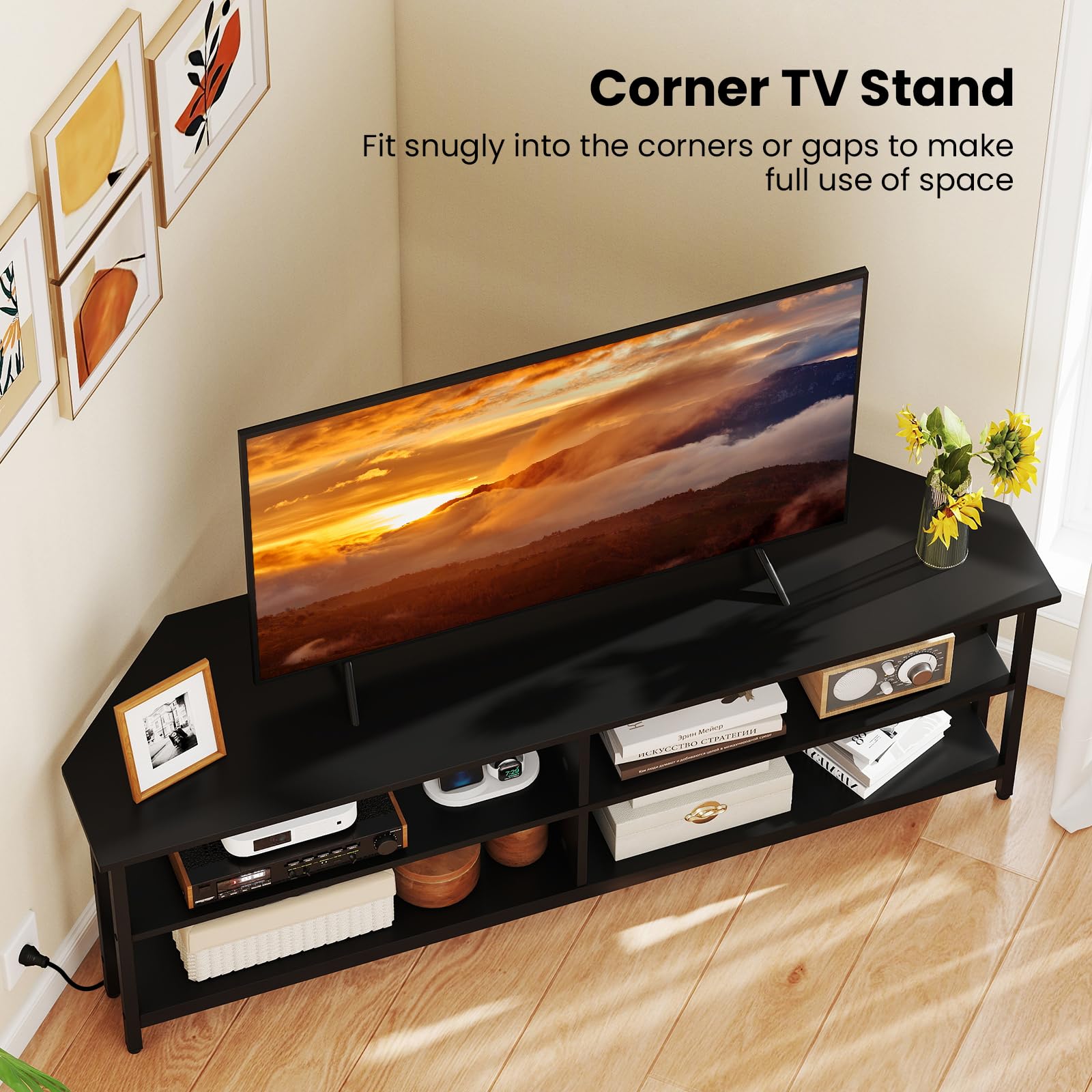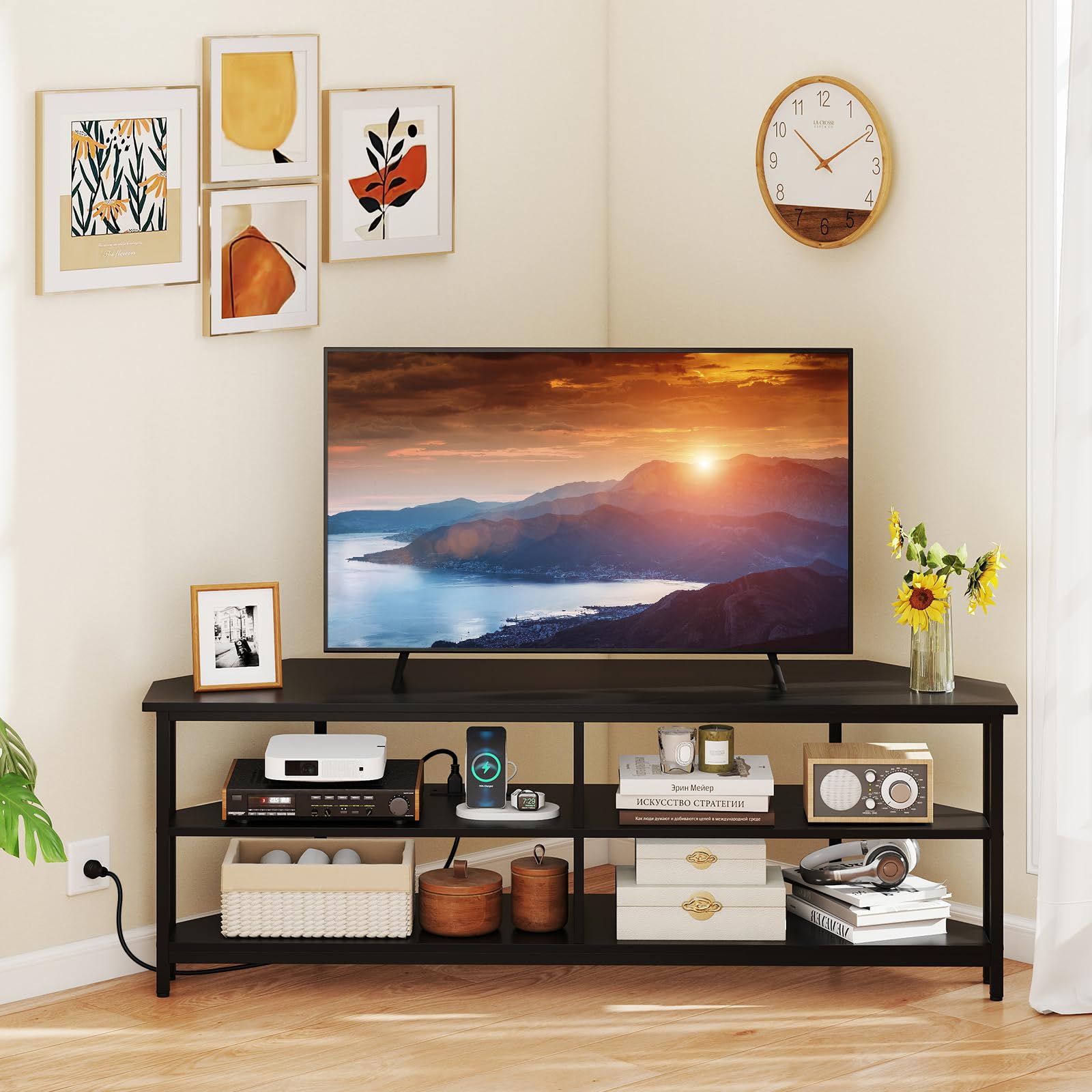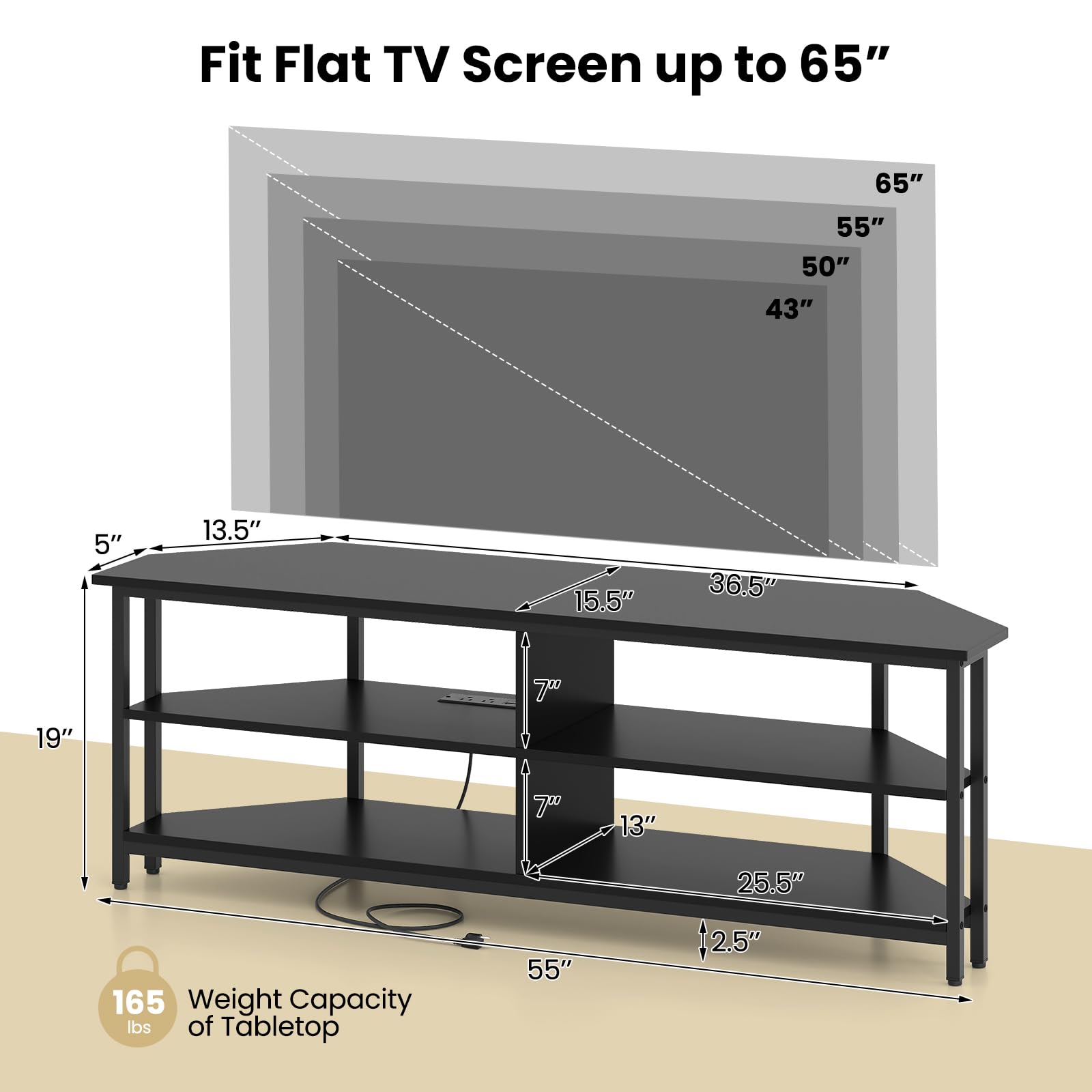 Elevate your home setup with this corner TV stand, designed to accommodate TVs up to 65". Tired of low battery or tangled wires? The built-in charging station allows you to keep your electronics powered up and ready to use. For storage convenience, this TV cabinet features 3-tier shelving, providing generous space to organize media items. Constructed with a robust metal frame, this media console table ensures durability and stability while supporting your television securely. This modern cabinet is designed to bring practicality and style to your daily entertainment routine.