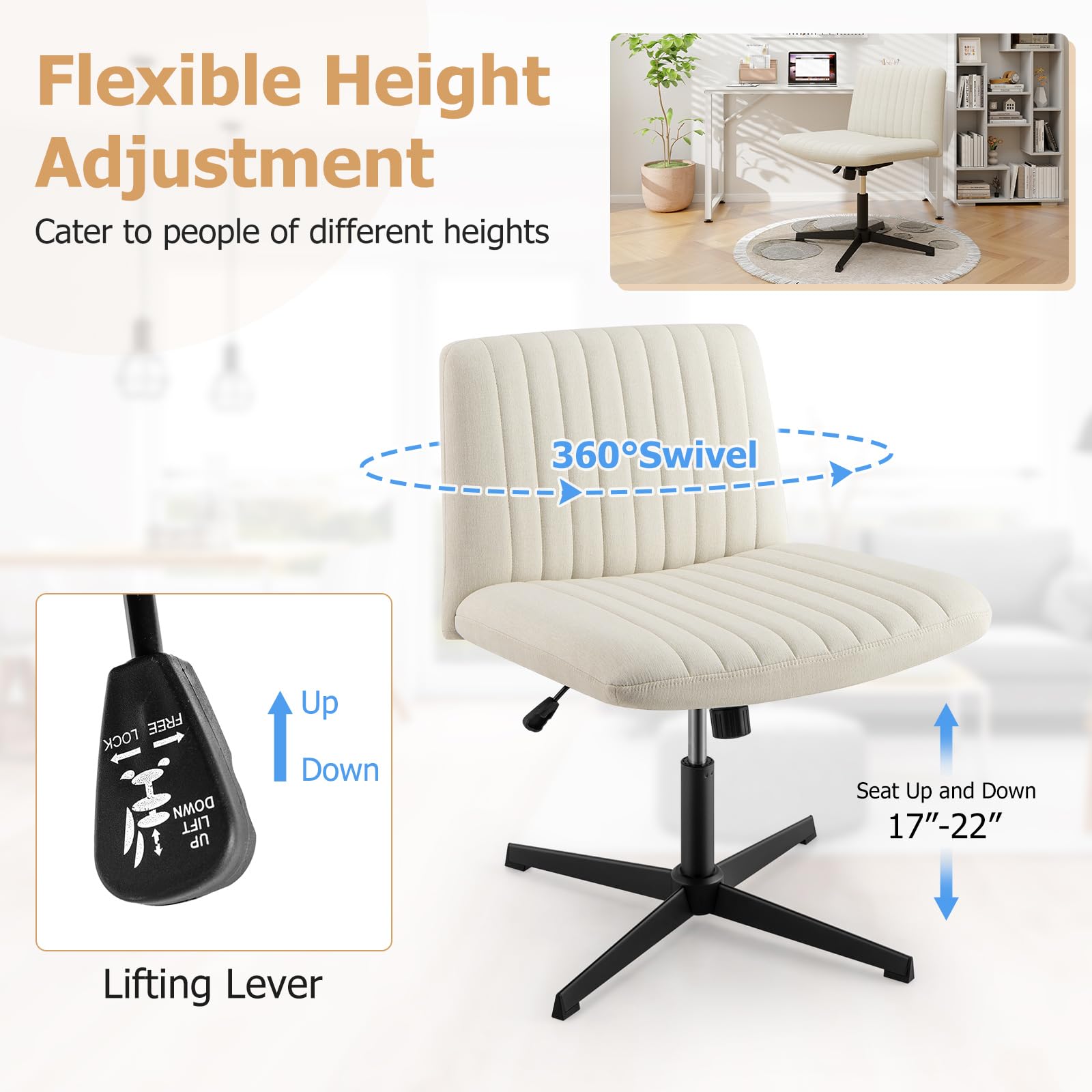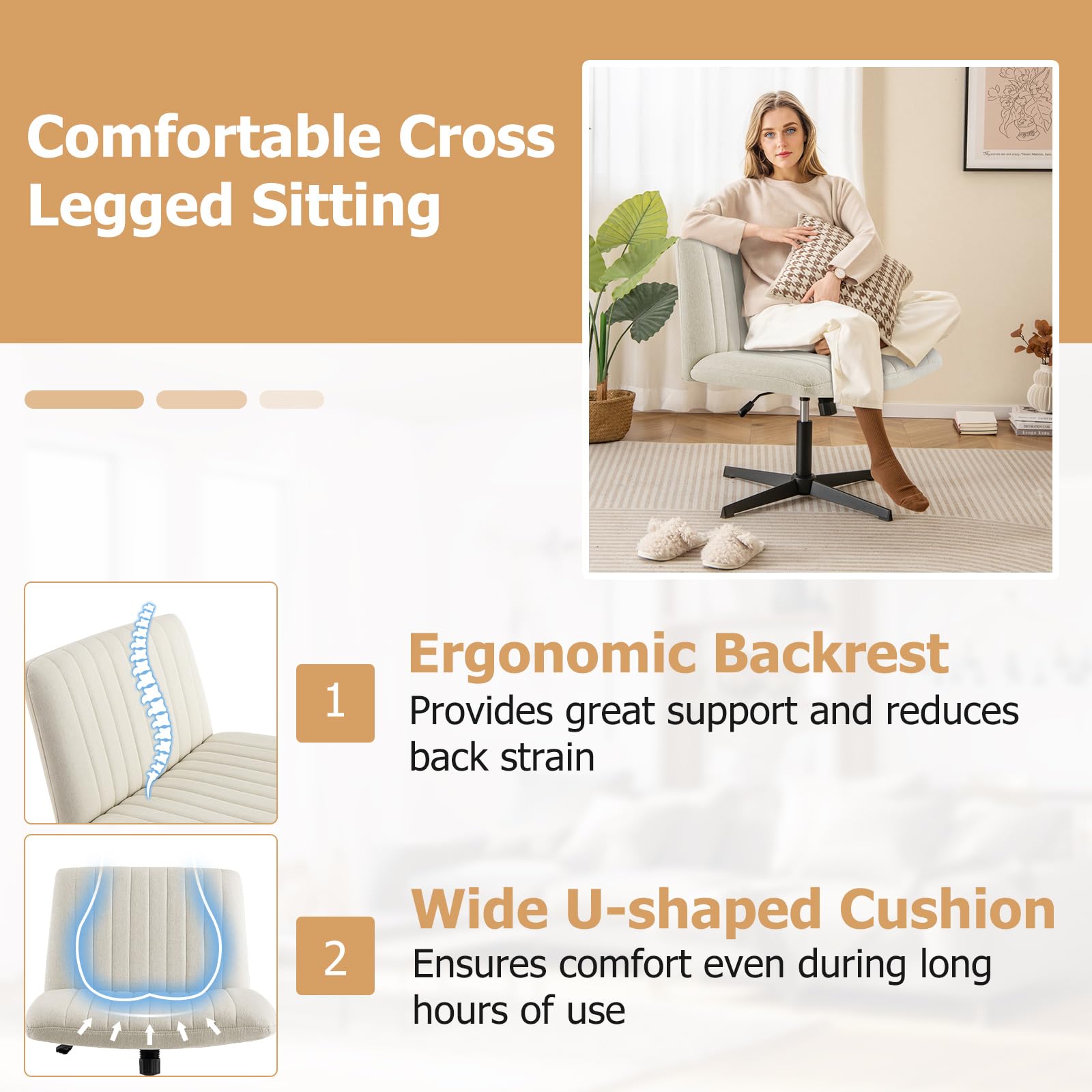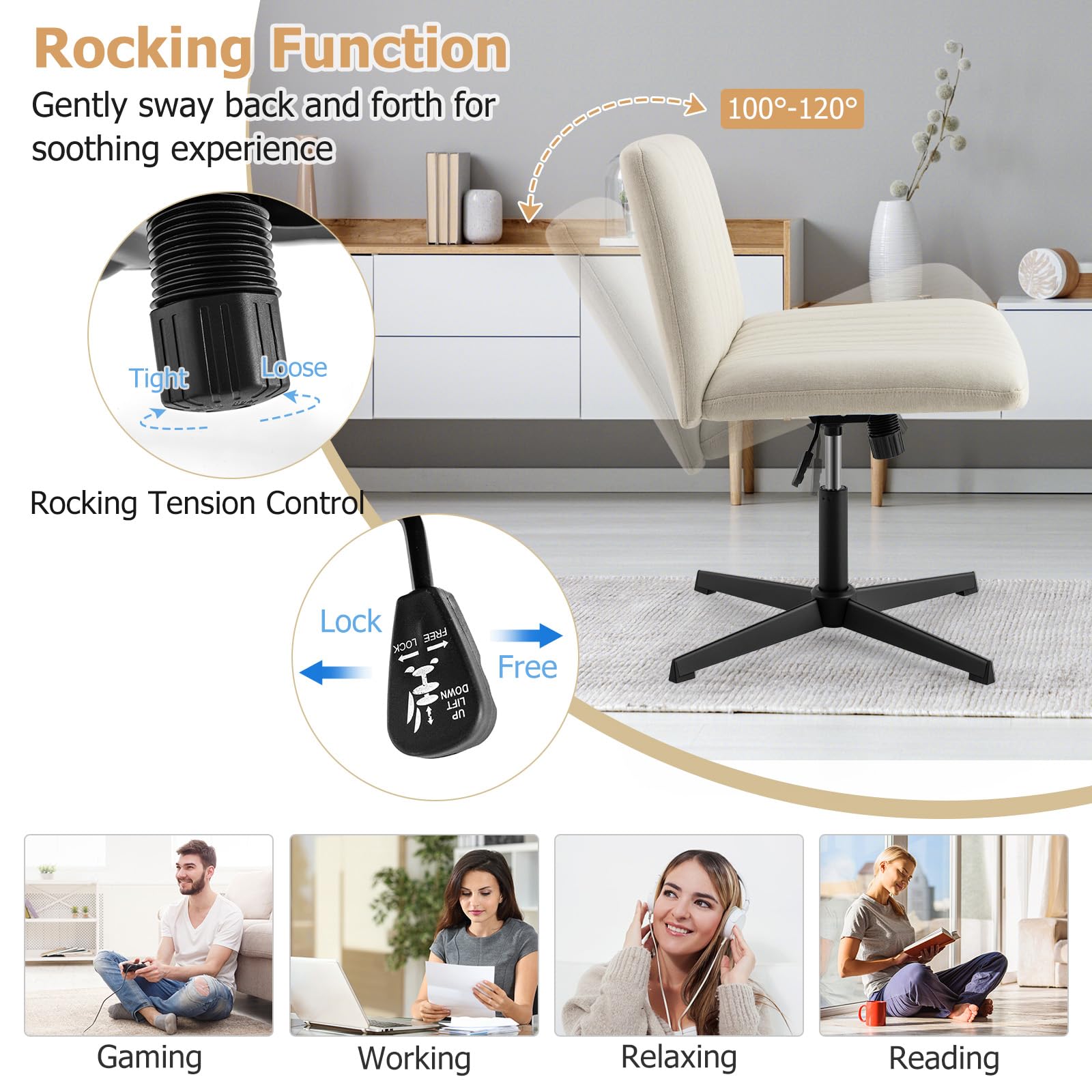 Elevate your space with this cross legged chair, designed to blend function and style seamlessly. Sit back and enjoy the plush comfort of the wide padded seat, designed to offer ample cushioning and support. The high-density sponge filling and soft linen fabric surface further enhance comfort. Moreover, featuring rocking function and flexible height adjustment, the home office chair can well suit specific needs. Made of strong cross metal base, the vanity chair presents excellent sturdiness and stability. Sleek and contemporary design complements any space, such as living room, bedroom, study and office.