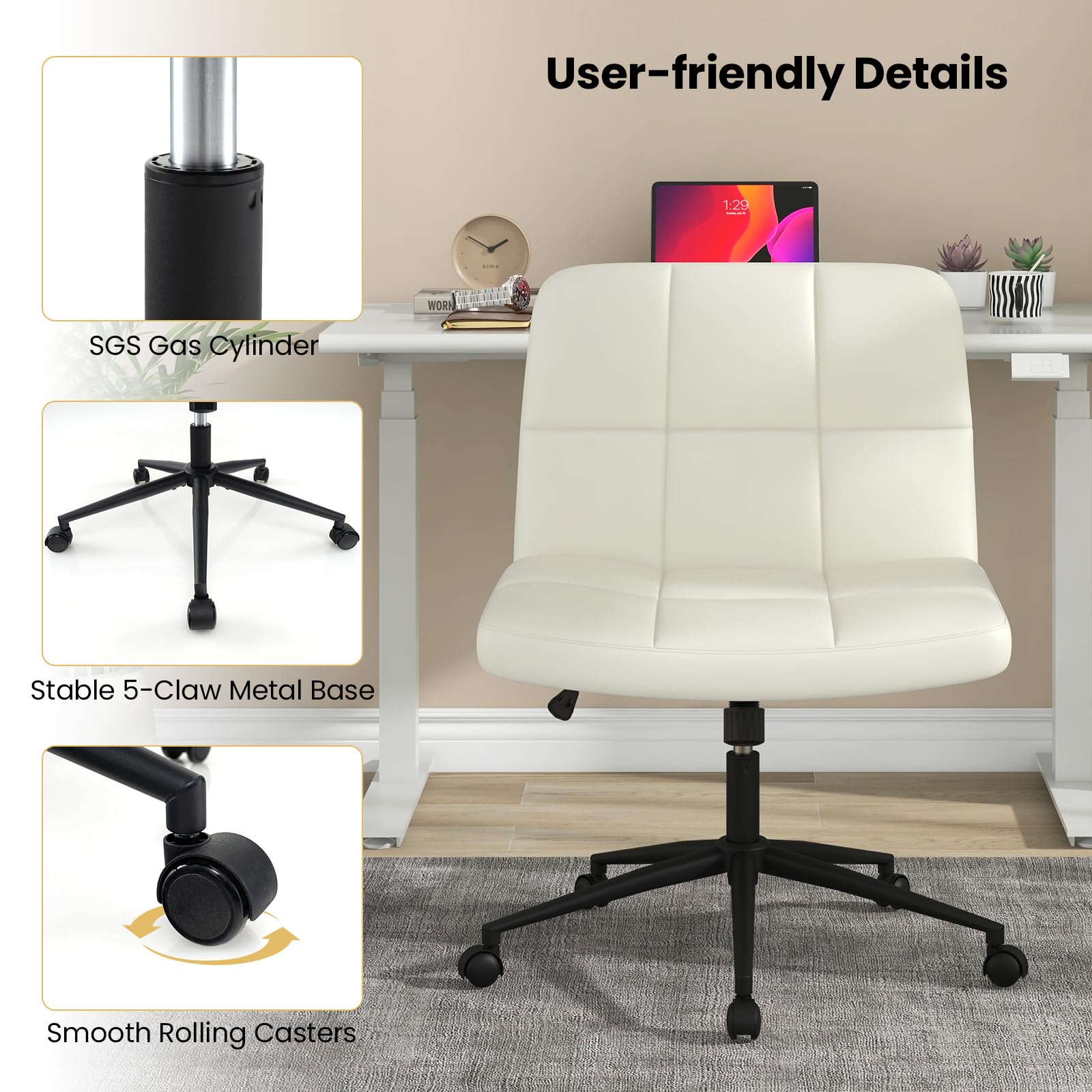 Does your office chair make you want to work more? Meet the ultimate criss cross chair with a U-shaped seat designed for cross-legged use, a dream come true for those lengthy workdays! Upholstered in sleek PU leather and equipped with a high-density sponge, it ensures comfort that lasts. Not just about comfort, this chair also boasts adjustable height, swivel capabilities, and a relaxing rocking function. Its armless design is perfect for small spaces, and the robust metal base with easy-glide wheels adds unmatched stability and mobility. Upgrade to the chair that combines elegance, comfort, and practicality, making every workday a breeze. Where comfort meets efficiency - try it today!