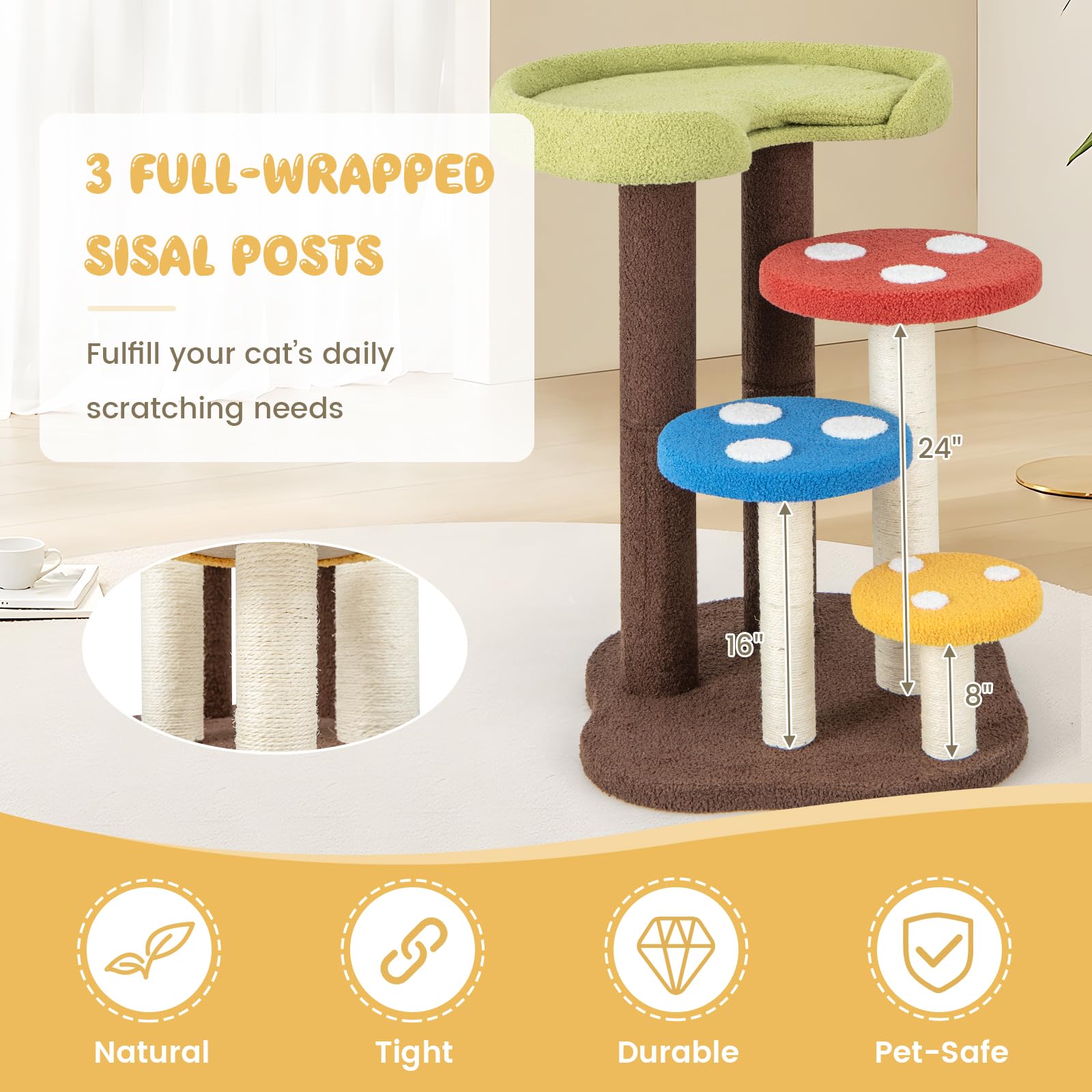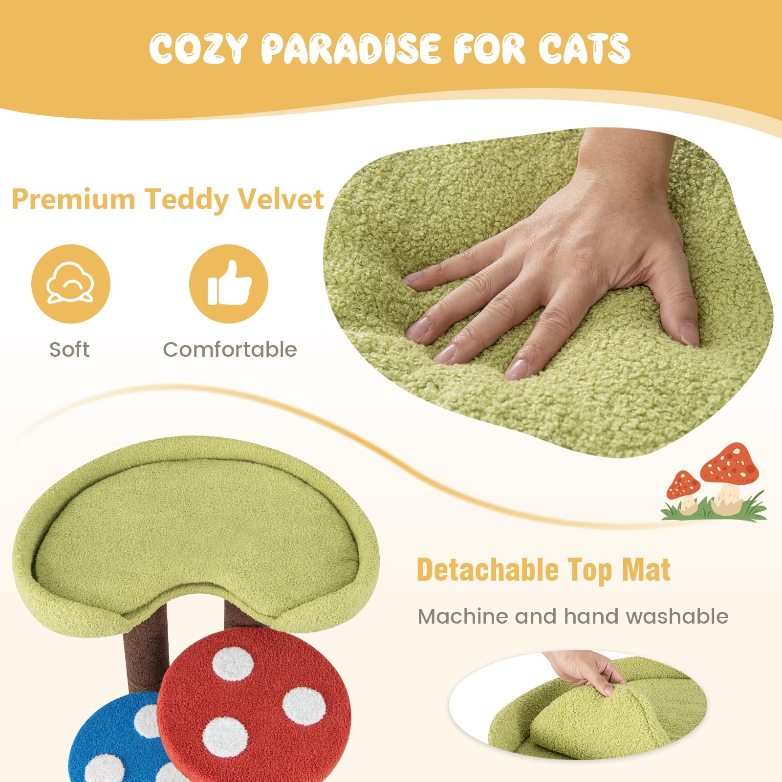 Introducing the ultimate playground and relaxation spot for your furry friends! Our cat tree features 3 full-wrapped sisal posts to satisfy your cat's instincts and protect your furniture from claw marks. With 5 levels, your cat can climb, jump, and perch on diverse platform heights. The cat tower is enveloped in superior teddy velvet, providing a cozy retreat for your furry friends. Cleanup is a breeze with the removable and washable mat. The cat activity center is designed with stability in mind, featuring 1.6" thick boards and an enlarged base. Its charming mushroom design adds a delightful touch to any room.