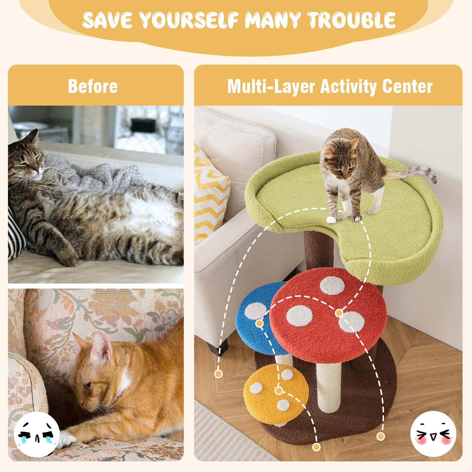 - Adorable Mushroom Design: This multi-layer cat tree offers a charming mushroom design that adds a cute touch to any room in your home. Your beloved cat can have their own special place in the living room, entryway, bedroom, and more.