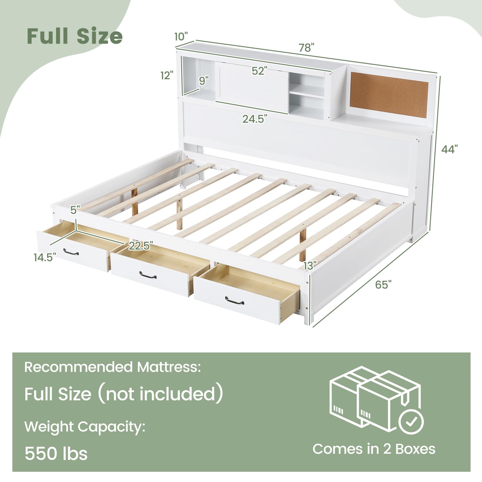 Elevate your space with our full size daybed, thoughtfully designed with 3 drawers and storage shelves to keep your essentials organized. The unique addition of a cork board provides a personal touch to this daybed, allowing you to display photos, notes, or reminders. Alongside this, a sliding door adds an element of privacy, concealing belongings or simply adding to the overall aesthetic. Supported by solid wooden slats, the daybed frame is sturdy for a long lifespan. Designed for your living room, study, or bedroom, the sofa bed with 3 drawers maximizes the usage of your floor space while offering a practical sleeping solution.