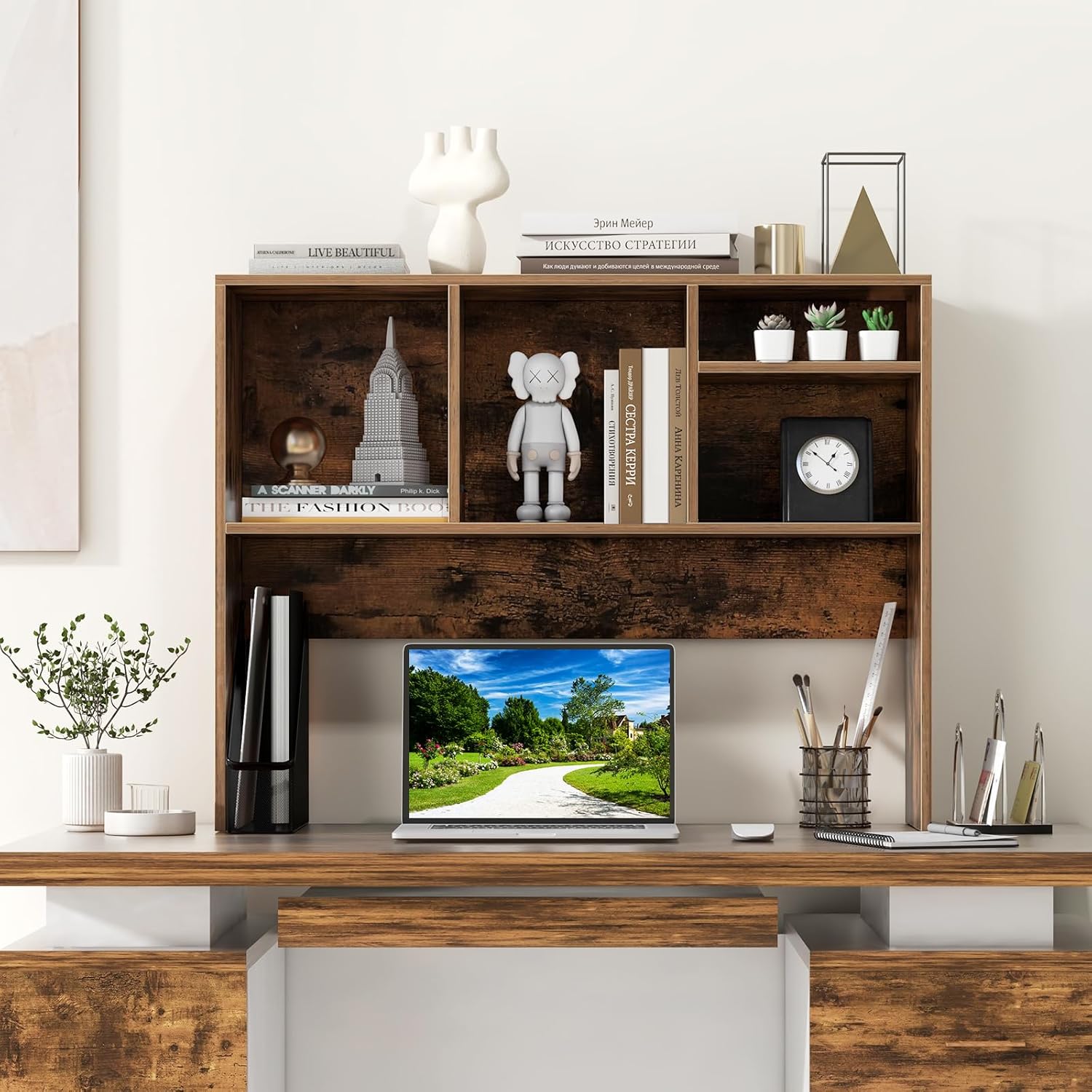 This desktop bookshelf creates more space and offers more convenience for your daily work.