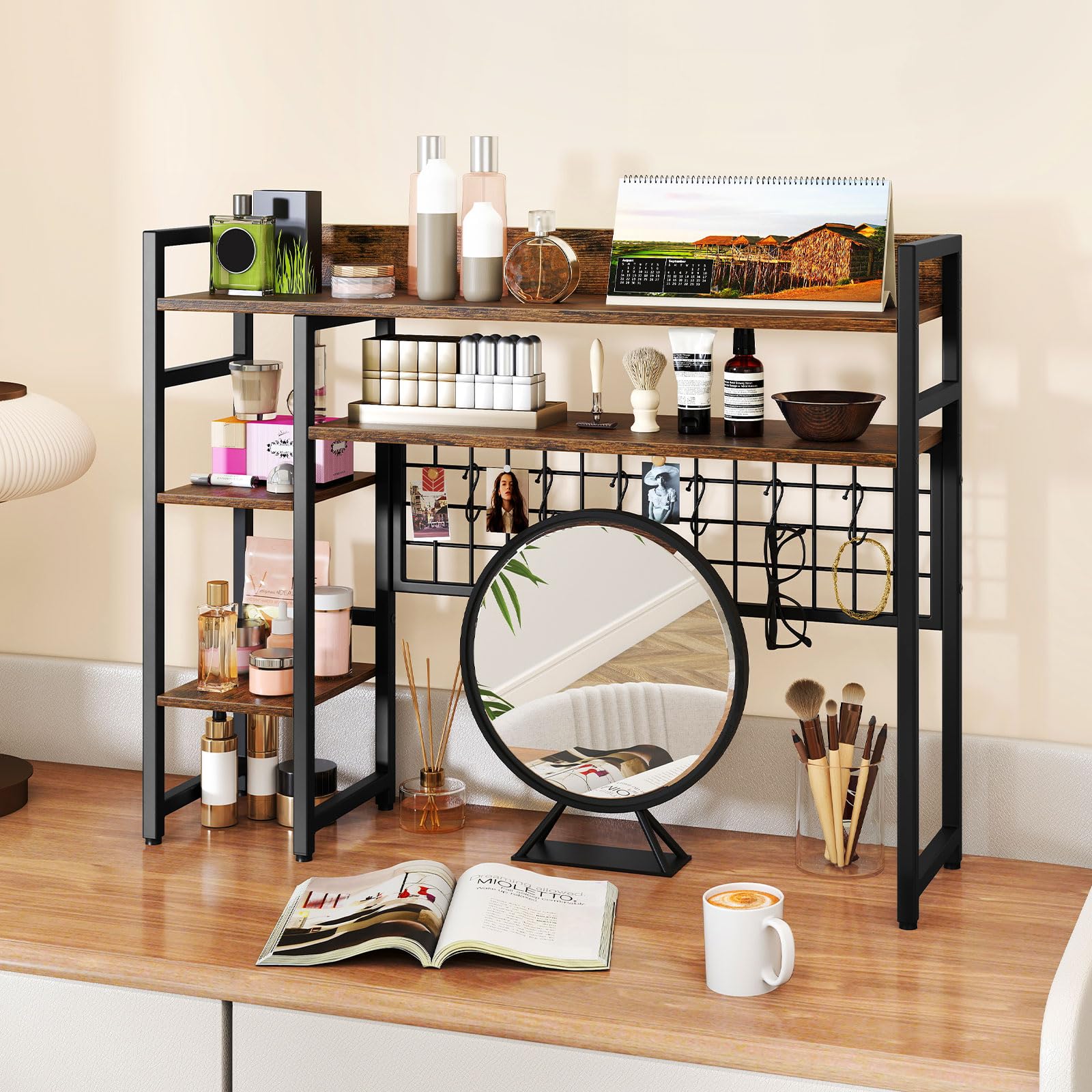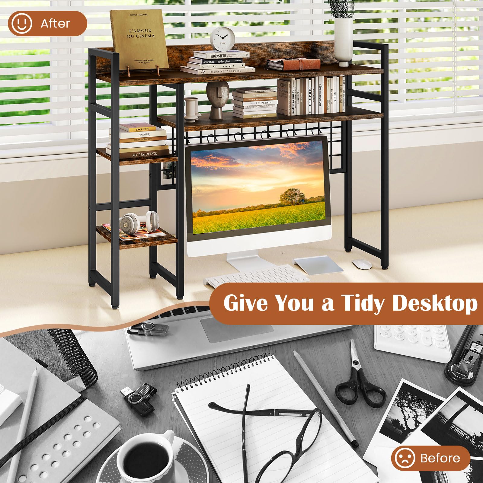 Transform your workspace into a haven of efficiency and style with the multifunctional desk shelf. Designed to accommodate things from a 32" monitor to your favorite reads, it is a perfect storage solution and a space-saver. What’s more, the wooden display shelf features a storage grid with 6 movable hooks, perfect for hang items and ensuring them are easily accessible. Crafted from a heavy-duty metal frame with 2 anti-toppling devices, the countertop hutch promises long-lasting durability and safety. Plus, the adjustable foot pads make it adaptable to uneven surfaces. Ideal for home offices, study areas, or any part of your house, the wooden bookshelf combines functionality with a sleek look that fits seamlessly into multiple settings.