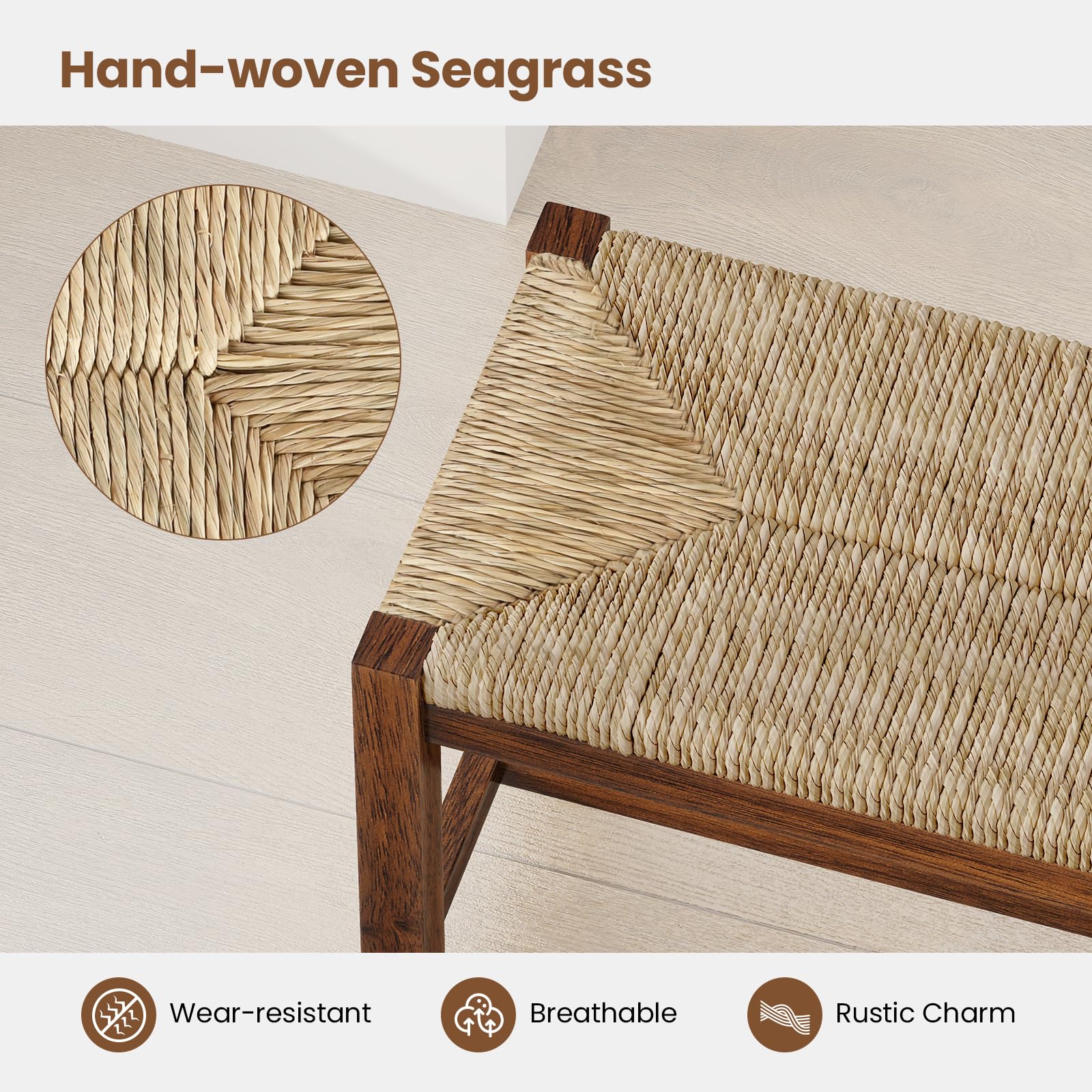 The hand-woven seagrass seat of our dining chair is not only visually stunning but also highly practical. Its breathable nature ensures that you stay comfortable even during long meals, while its wear-resistant properties ensure durability. The support frame of our dining chair is constructed from rubber wood, known for its sturdiness. Also, the supporting structure boasts stable triangle corners and added crossbars for a reliable foundation. Furthermore, the rustic bench comes with non-slip foot pads that prevent any unsightly scratches.