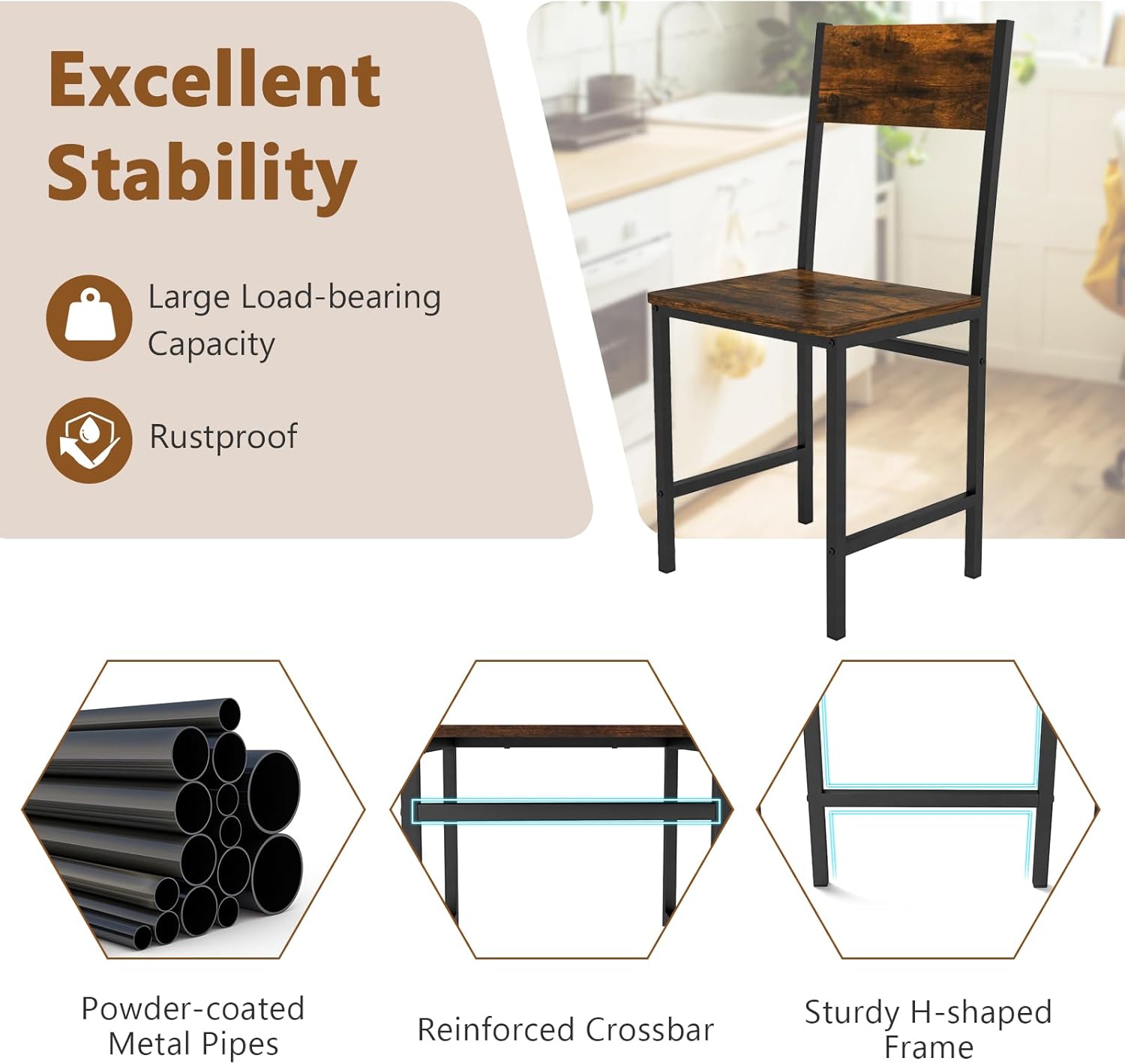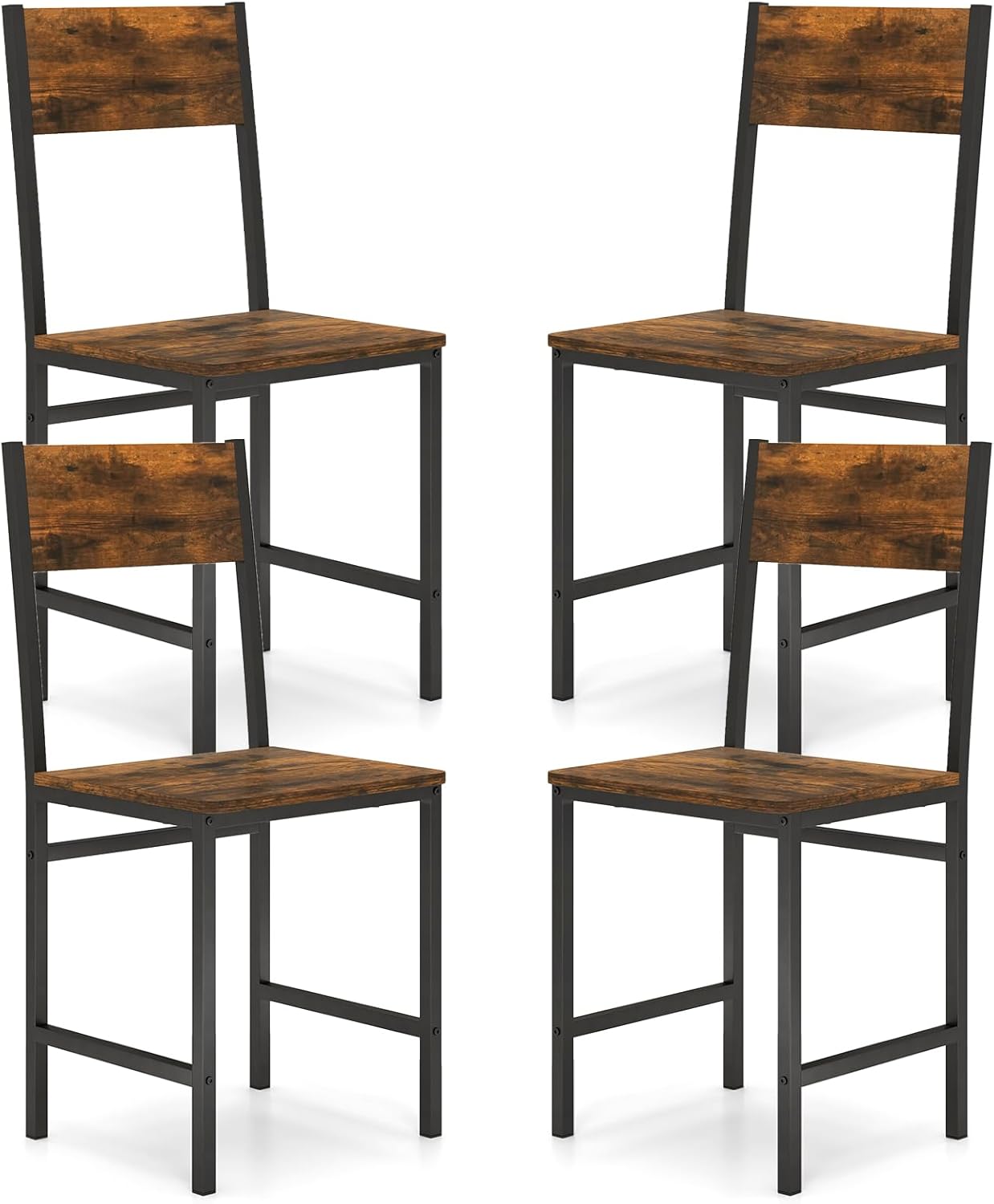 The wide seats of these chairs ensures that you feel completely relaxed, whether you're enjoying a meal, working on a project, or engaging in a lively conversation. Plus, the 96° tilted backrest is designed to provide an enjoyable sitting experience, promoting good posture and reducing strain on your body. With metal supporting frame and reinforced design, the industrial dining chairs not only provides superior comfort but also boasts excellent stability, making it the ideal choice for any dining space. Combining rustic wood grain and black frame, the set of 2 dining chairs can be used in various settings, including the dining room, kitchen, restaurant, or living room.
