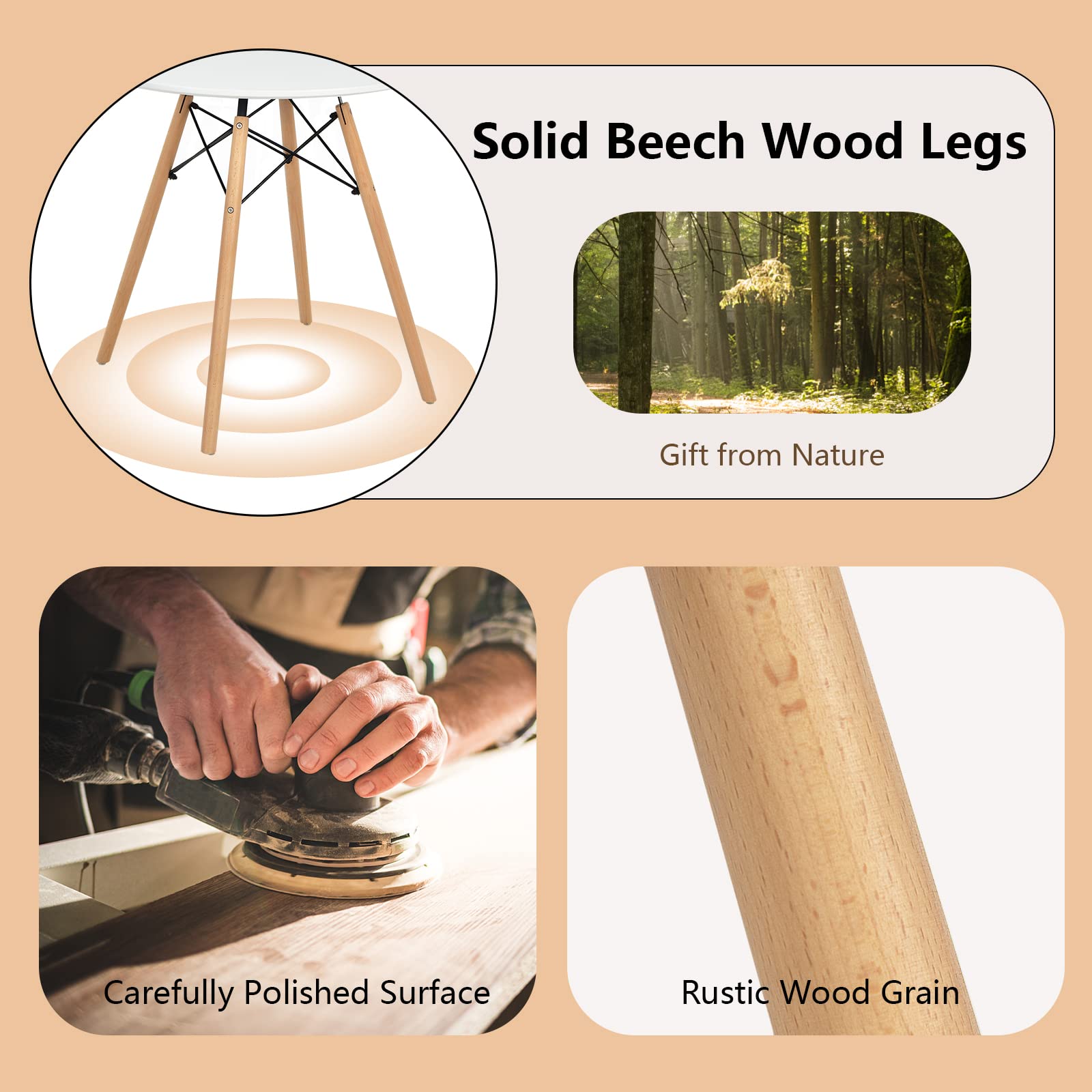 This dining room table comfortably seats 2 people and can fit up to 4, which is great for dining, working and creating. During use, the high-quality MDF, solid beech wood legs and sturdy steel frame make this round table stable and durable enough. What's more, the compact size allows you to use it wherever you want, such as kitchen, dorm and apartment. And the smooth and waterproof surface ensures ease of cleaning every time.